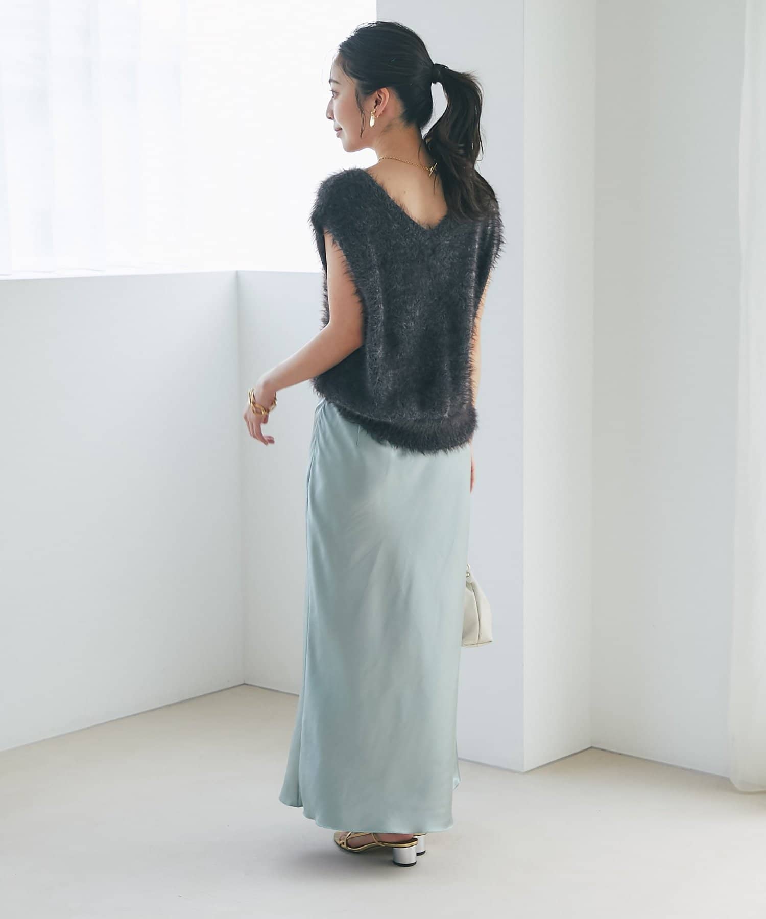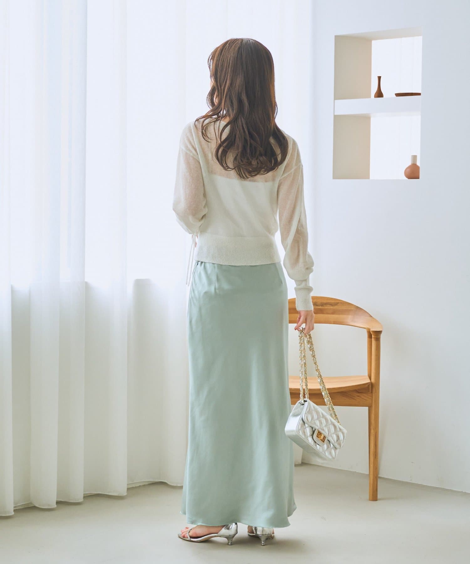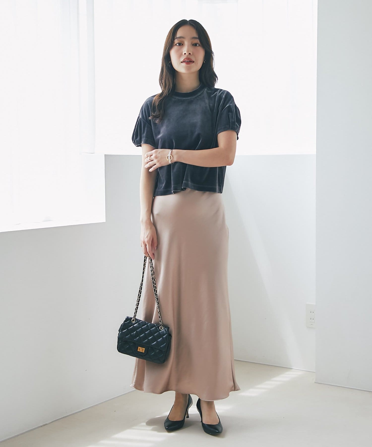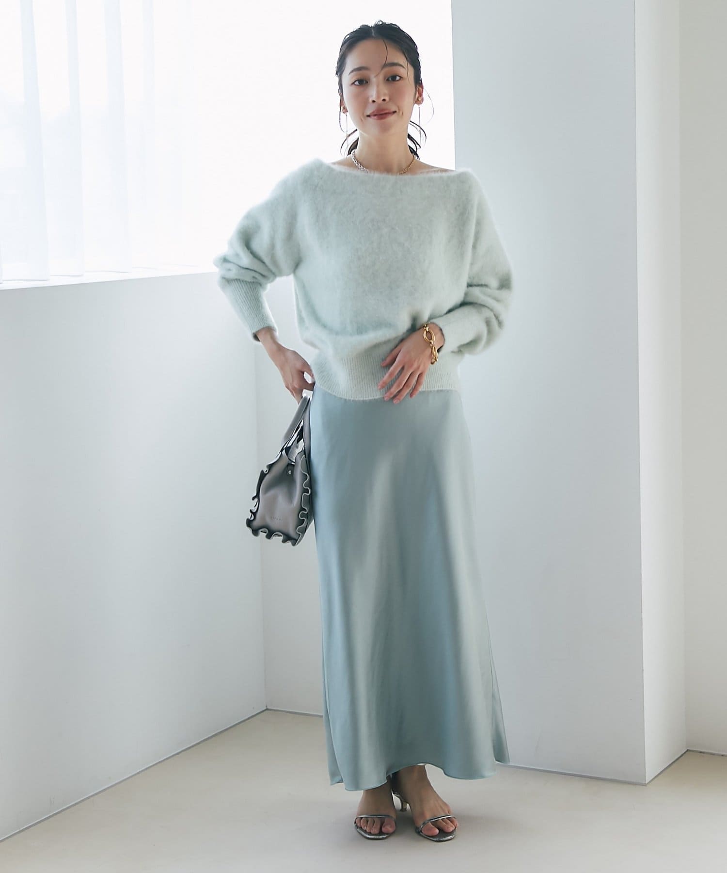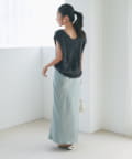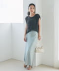 マキシ丈ながら、裾は軽やかで重たく見えず、抜け感のある印象に。