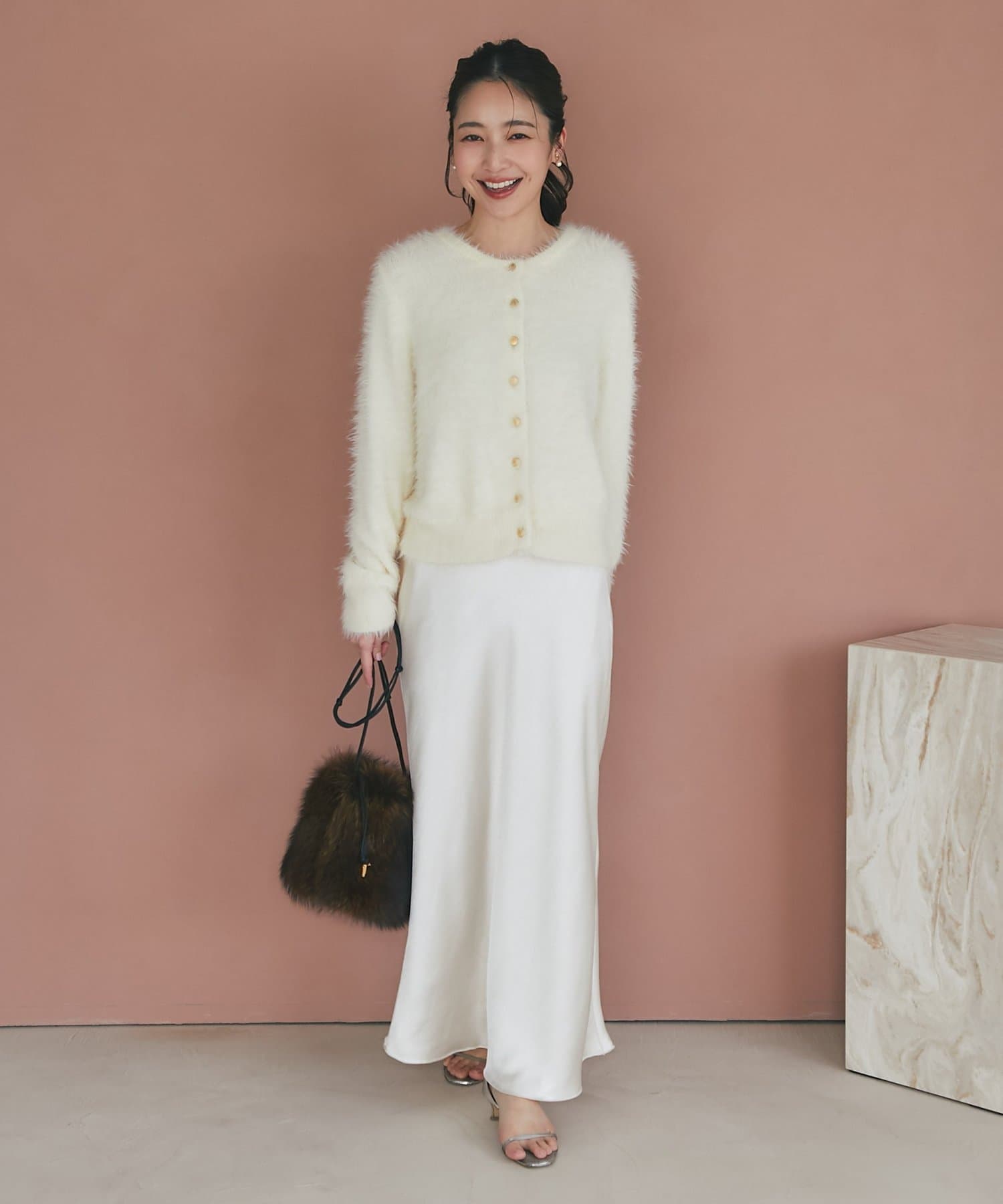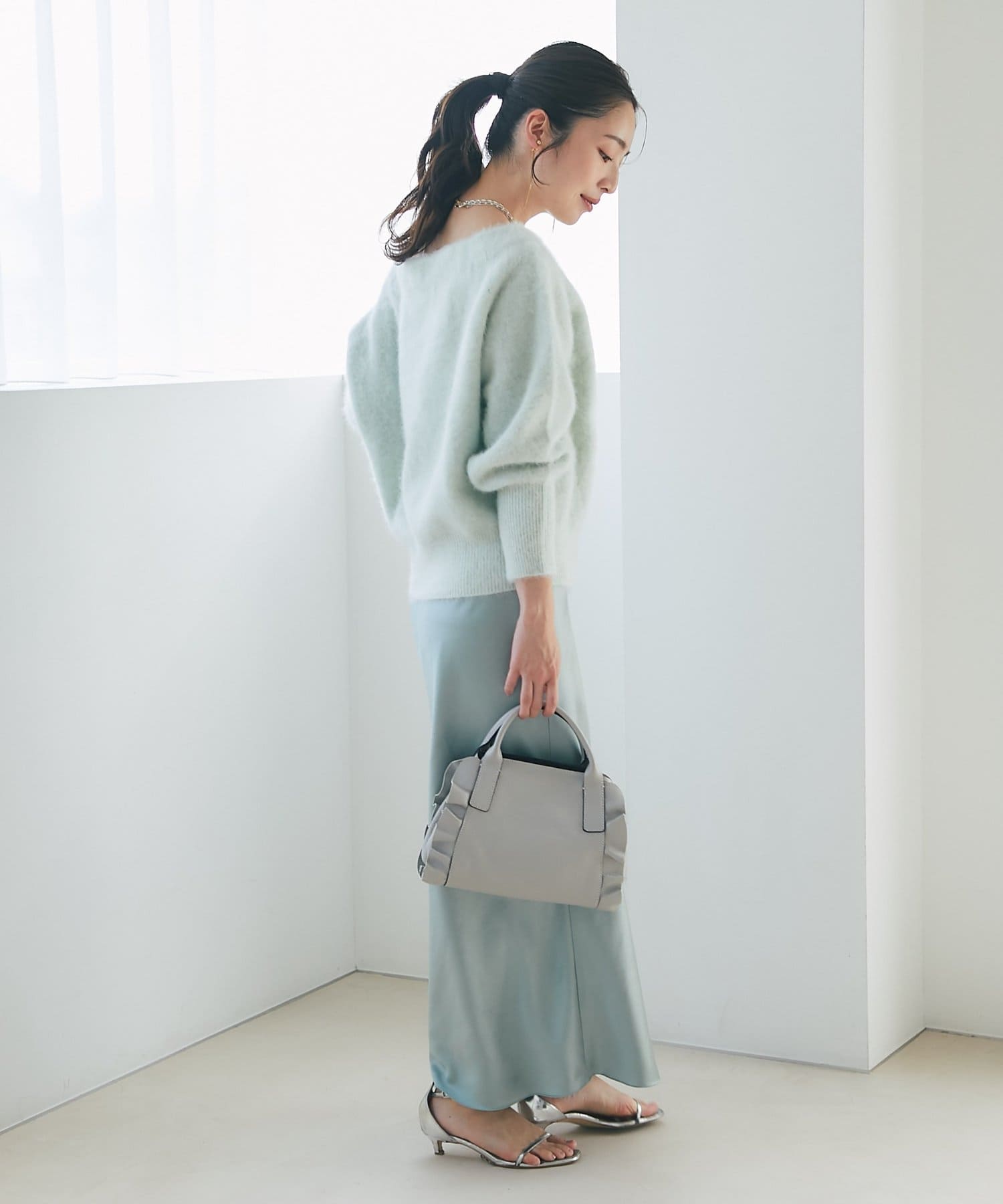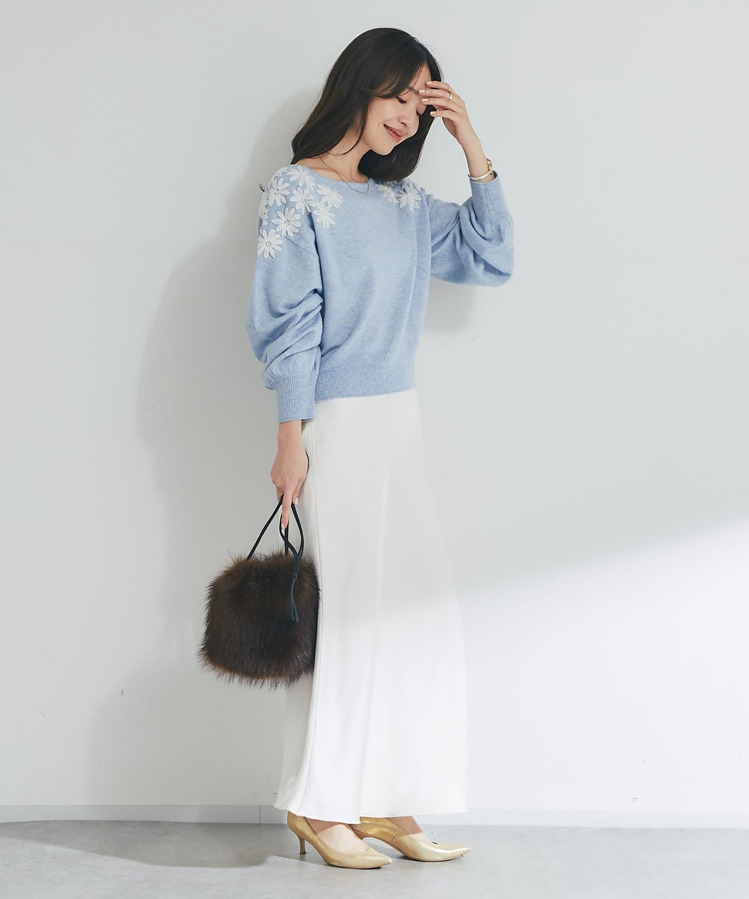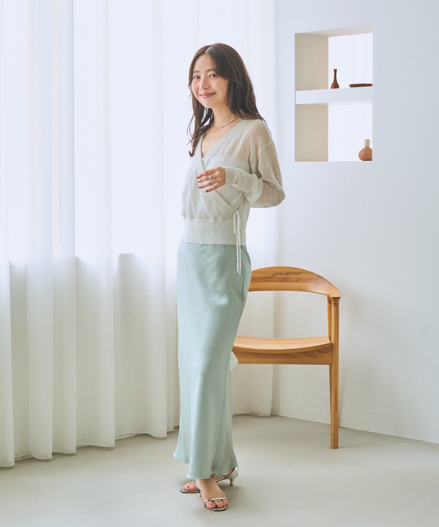 マキシ丈ながら、裾は軽やかで重たく見えず、抜け感のある印象に。