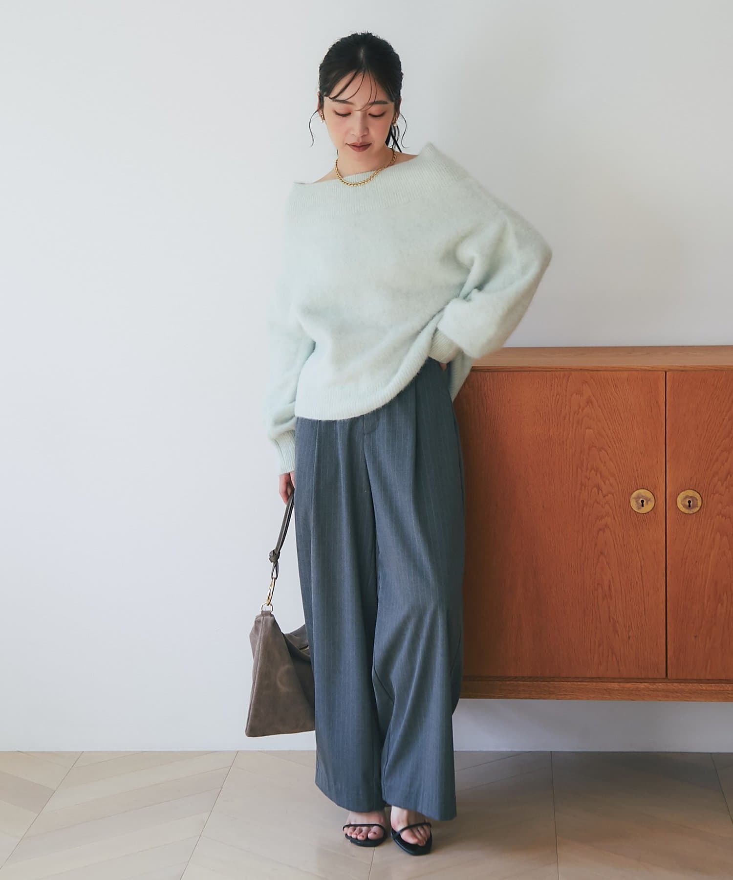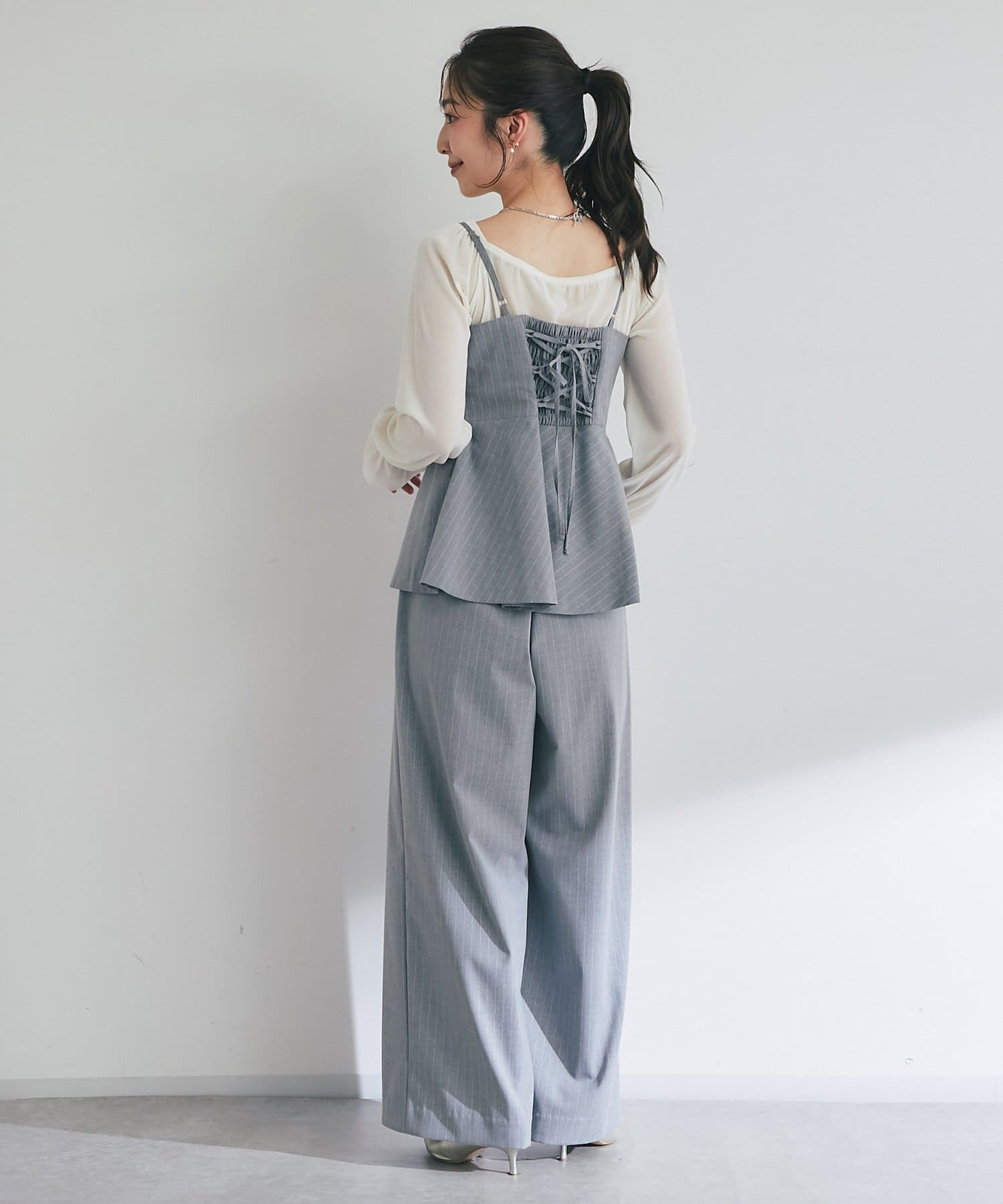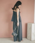 同素材のキャミソールと合わせたセットアップスタイルはもちろん、