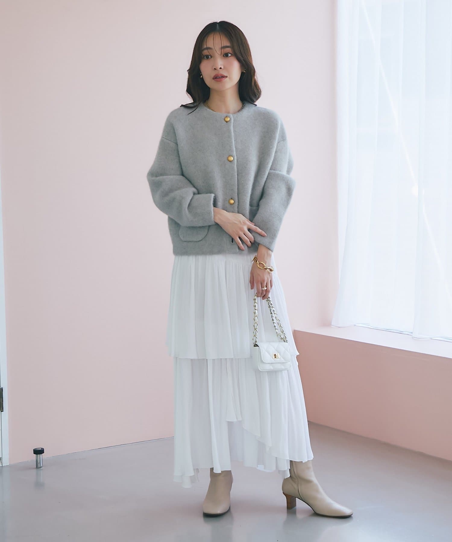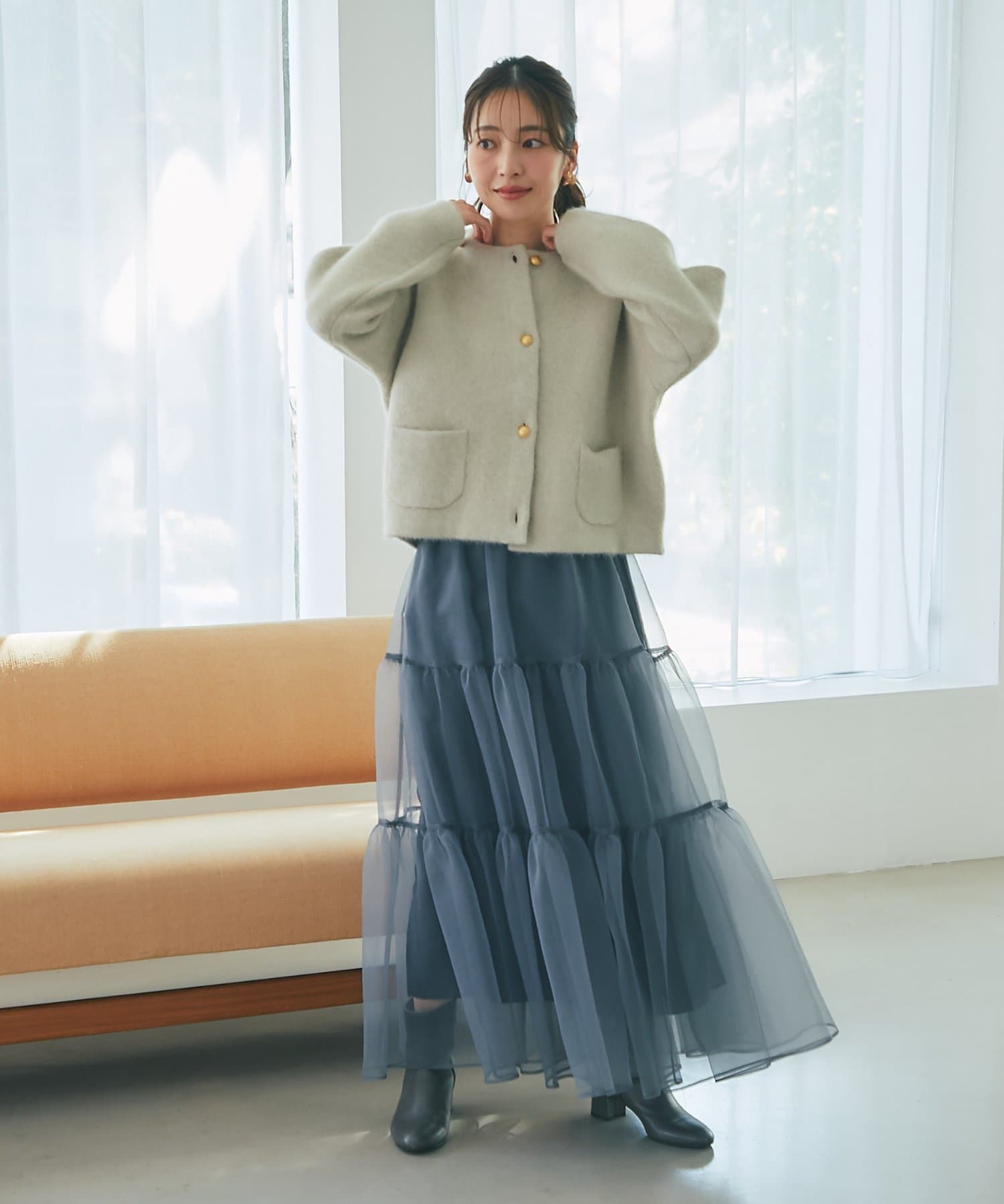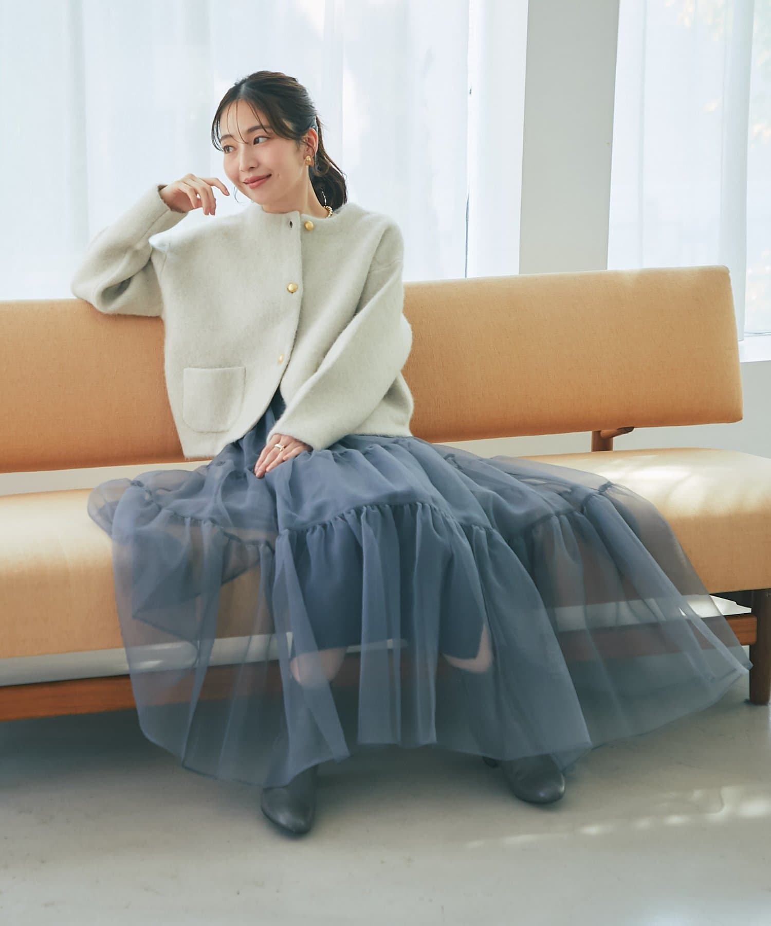 デニムと合わせたカジュアルスタイルや、スカートやワンピースのフェミニンスタイルも◎