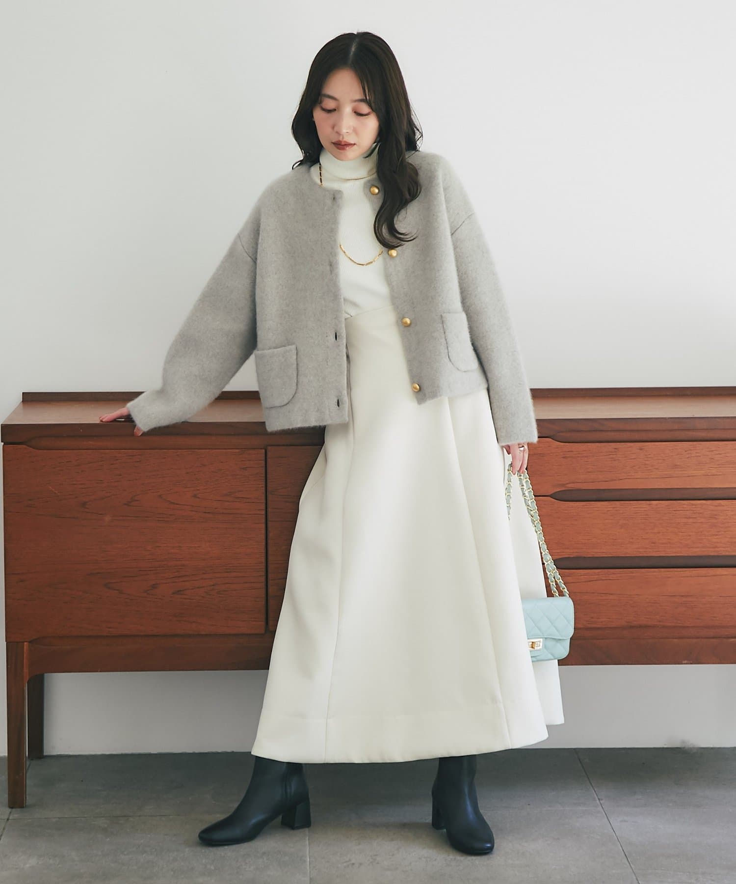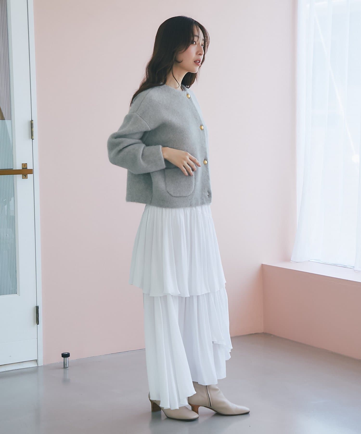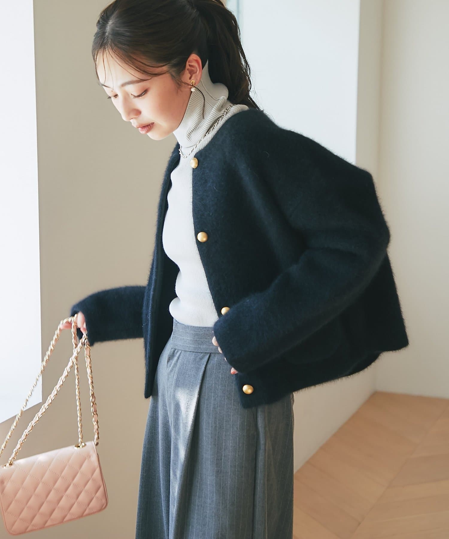 首元をすっきりと見せるノーカラーデザインは、タートルネックやシャツ、