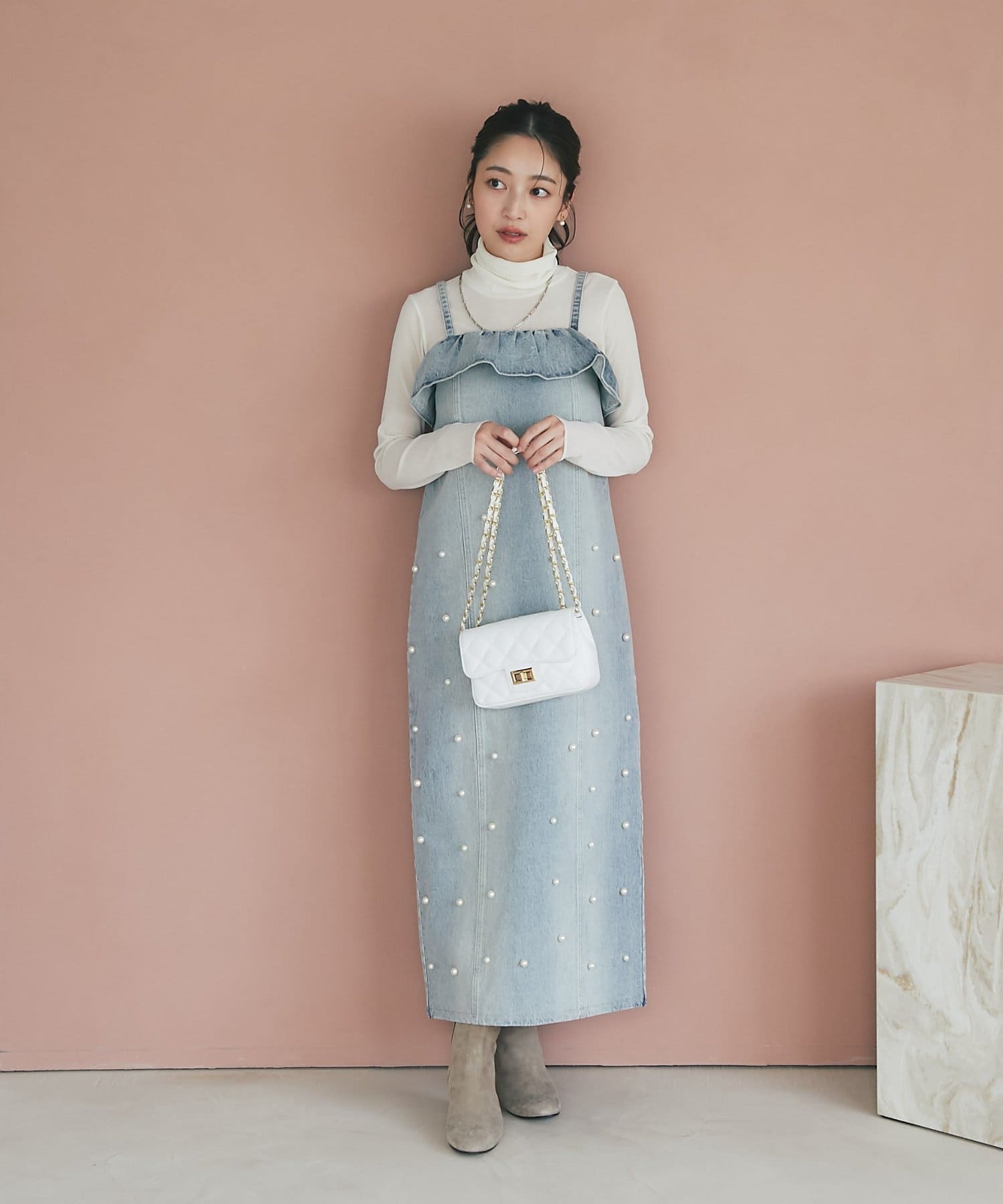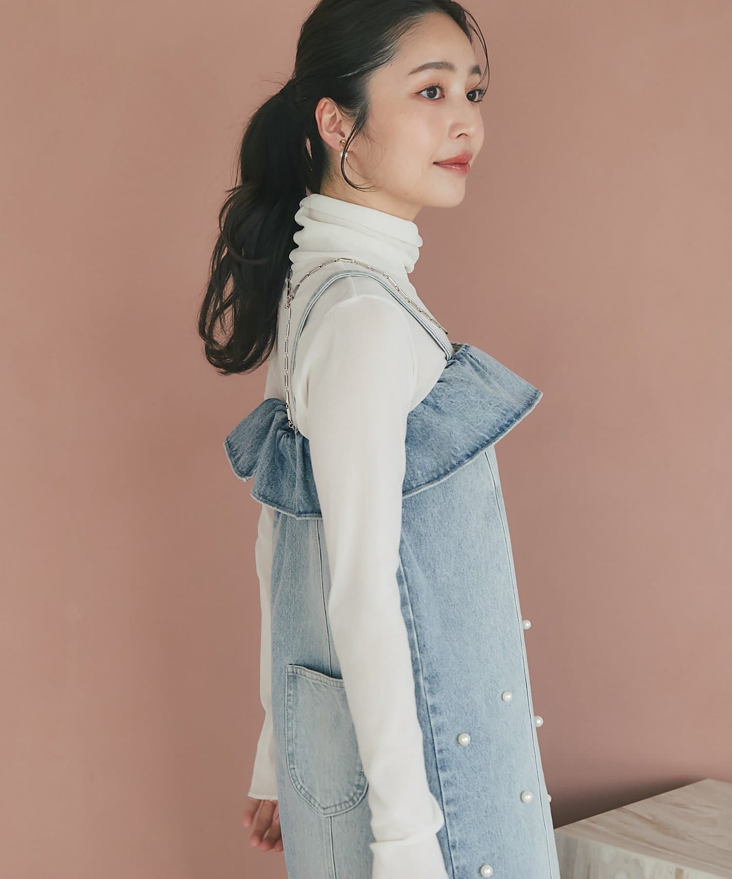 タートルネックが程よいフィット感で着心地よく、少し長い袖もポイント。