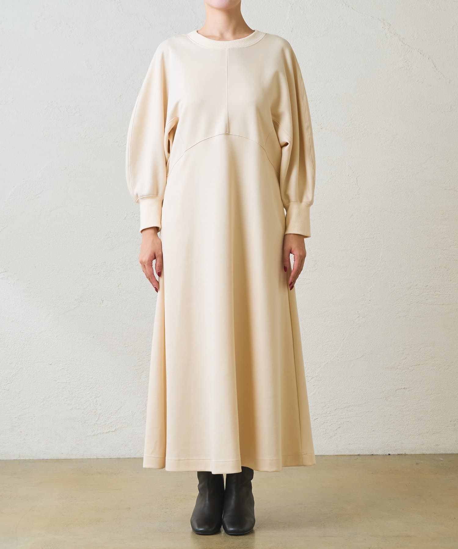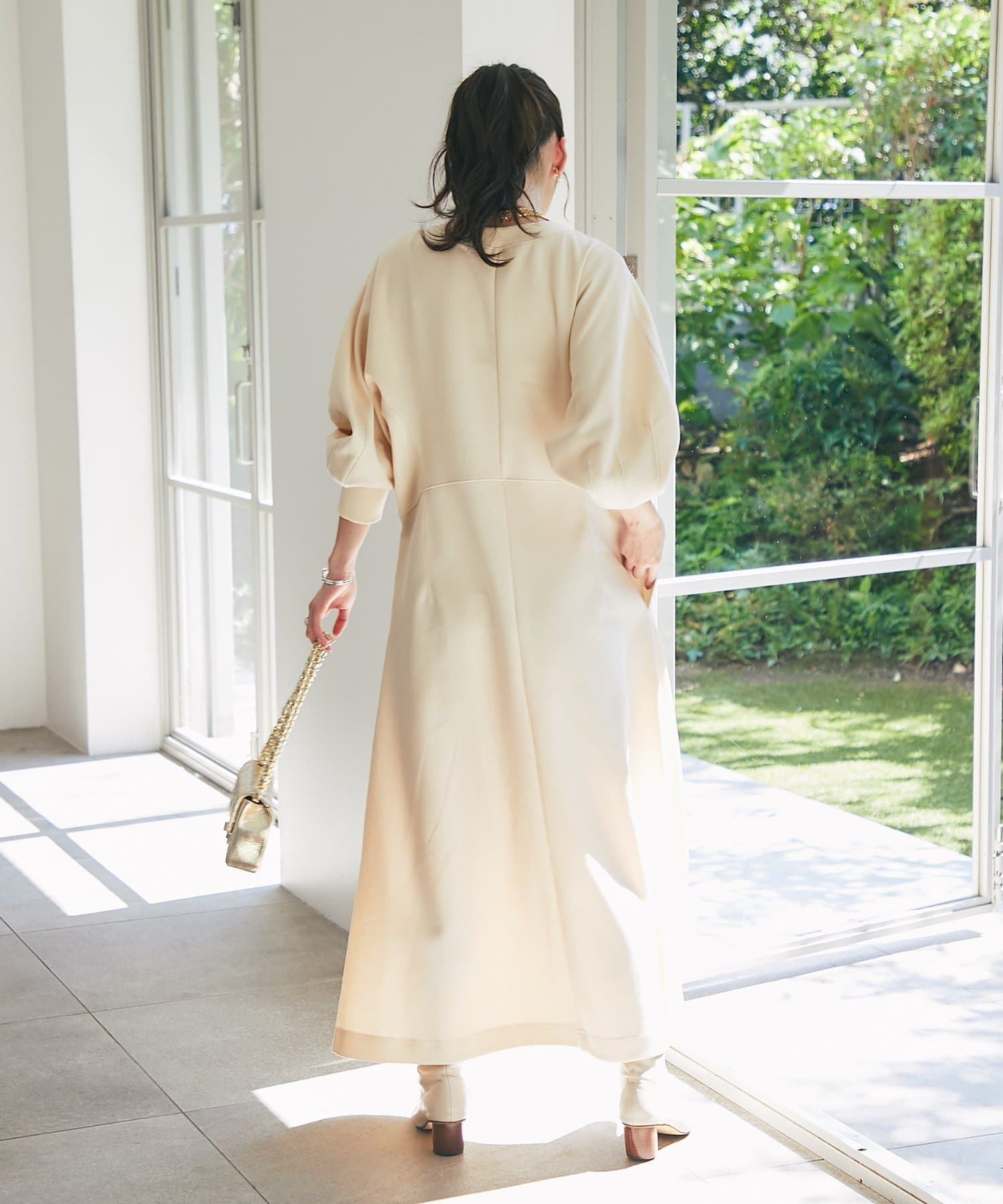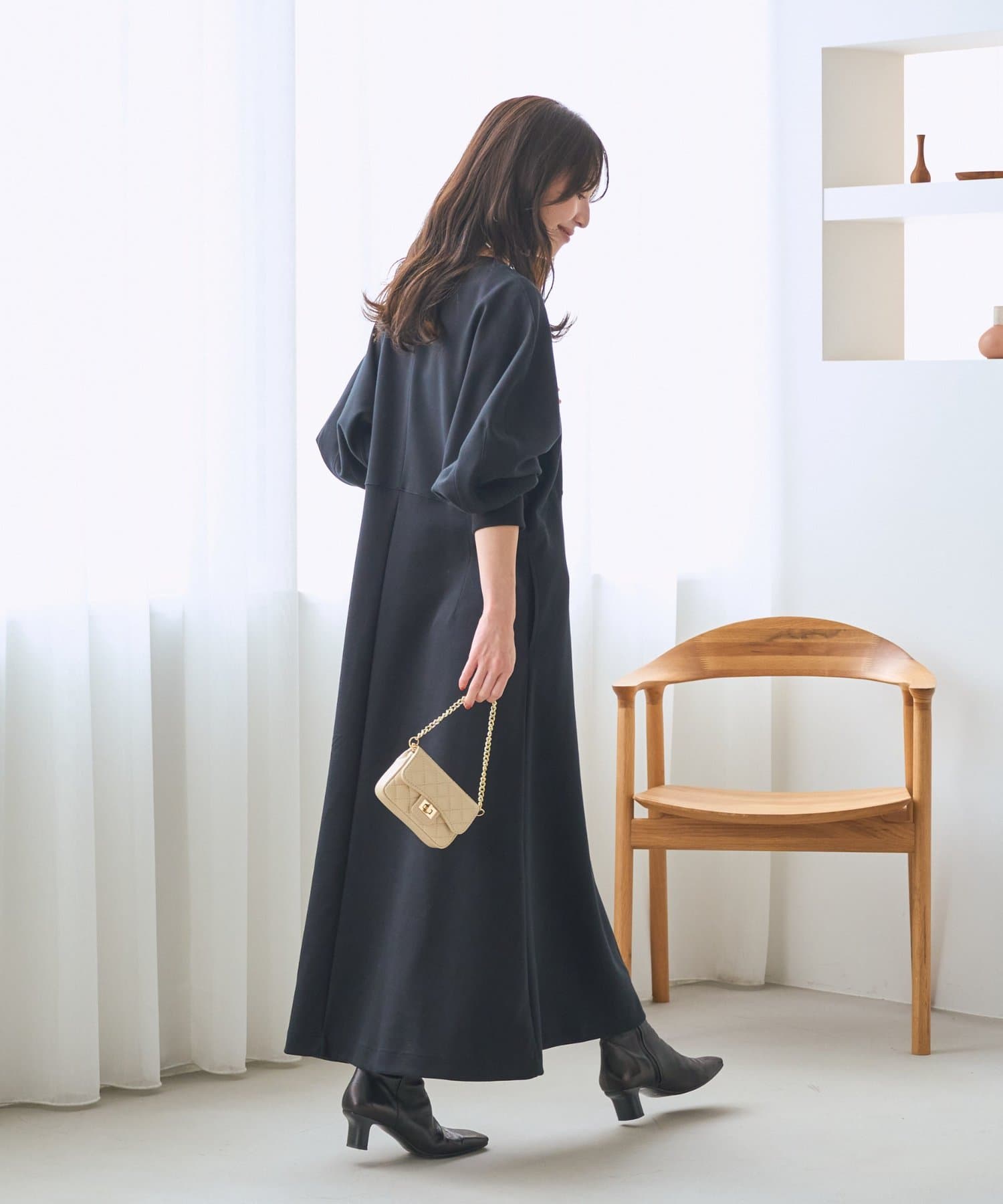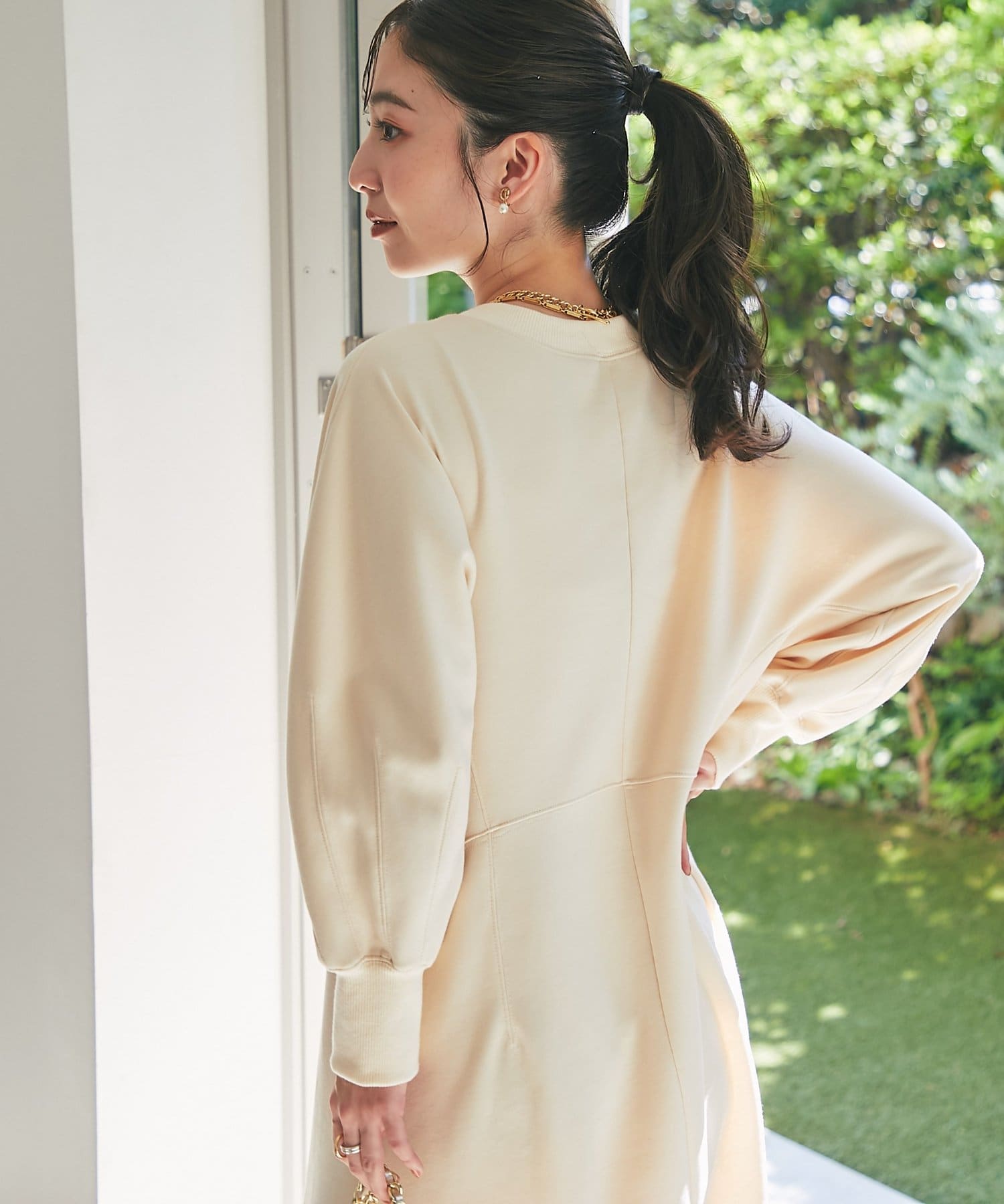 ウエストの切り替えが自然にメリハリをつくり、今っぽいシルエットを演出します。