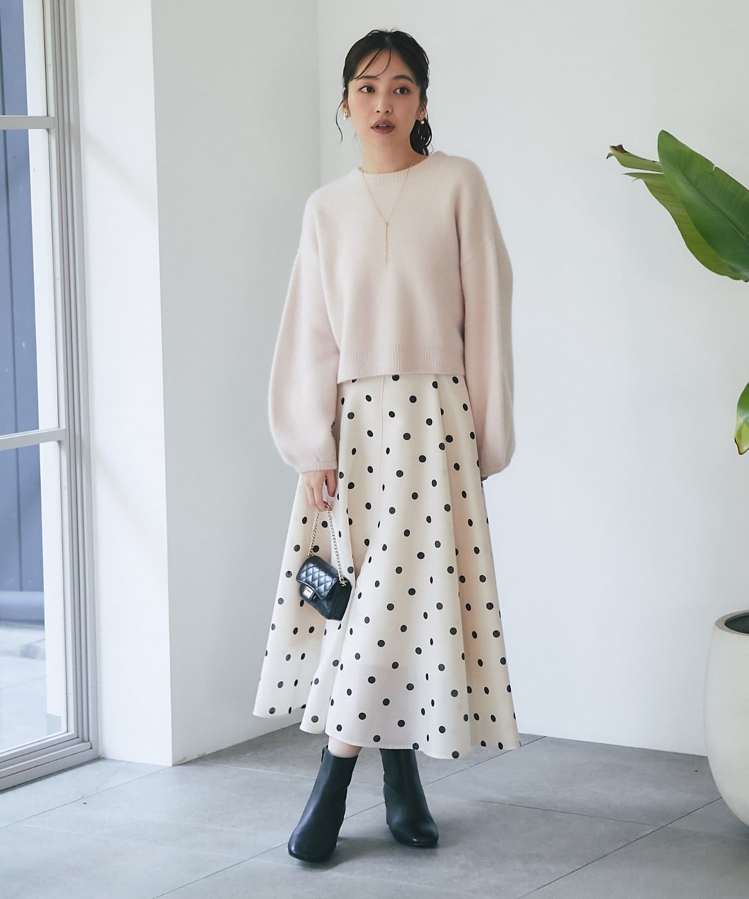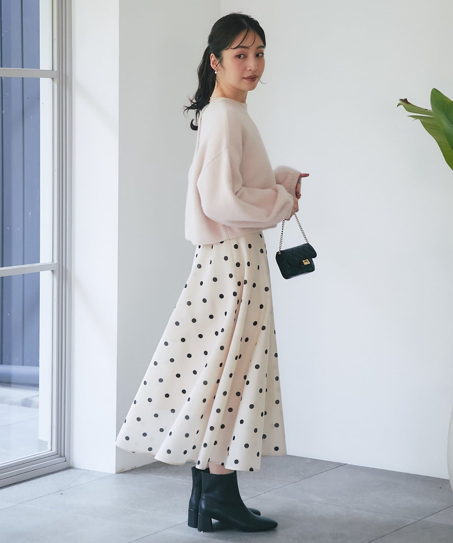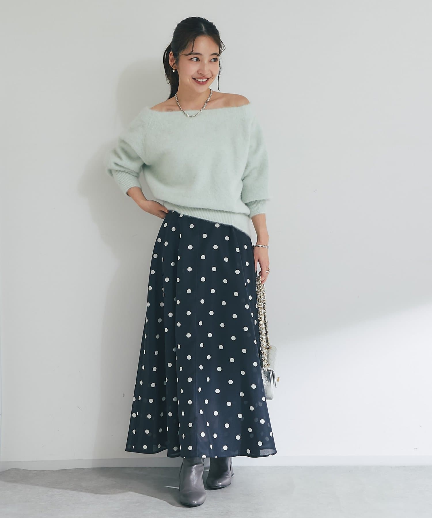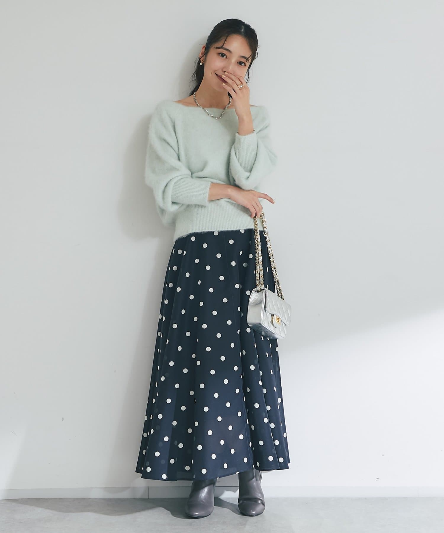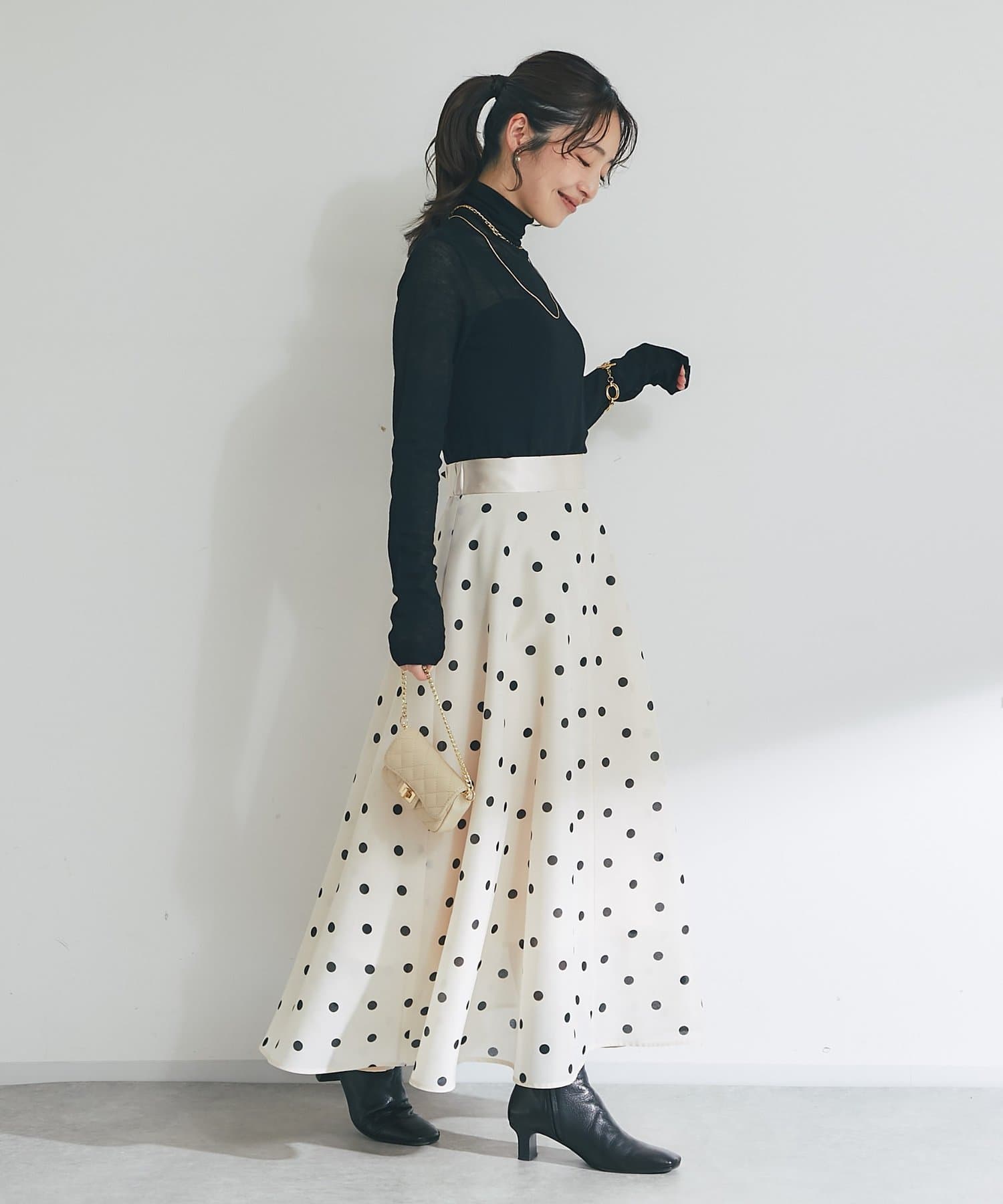 大人も素敵に着こなせる甘さを抑えたドット柄のスカートです。