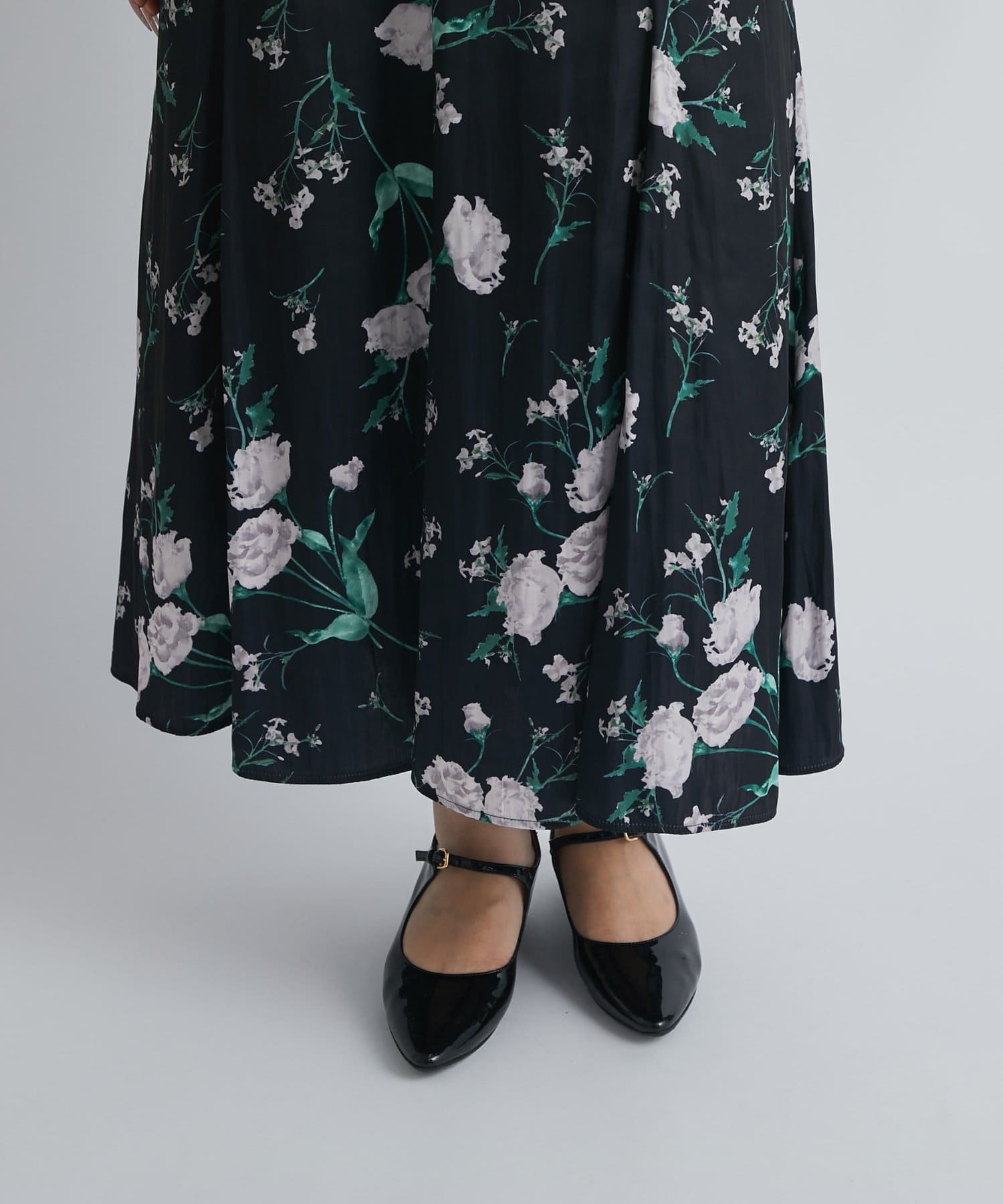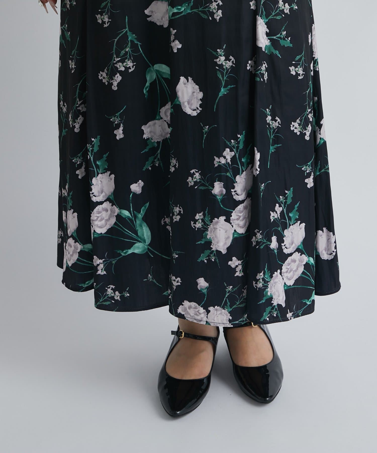 オリジナルの中花柄プリントが目を引くロングスカート。