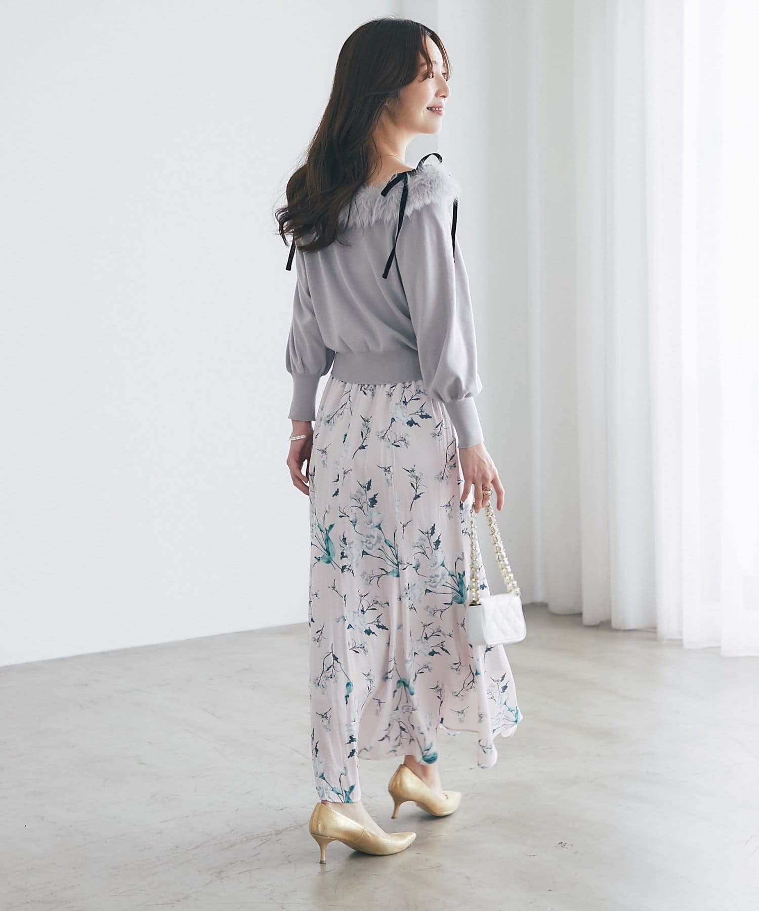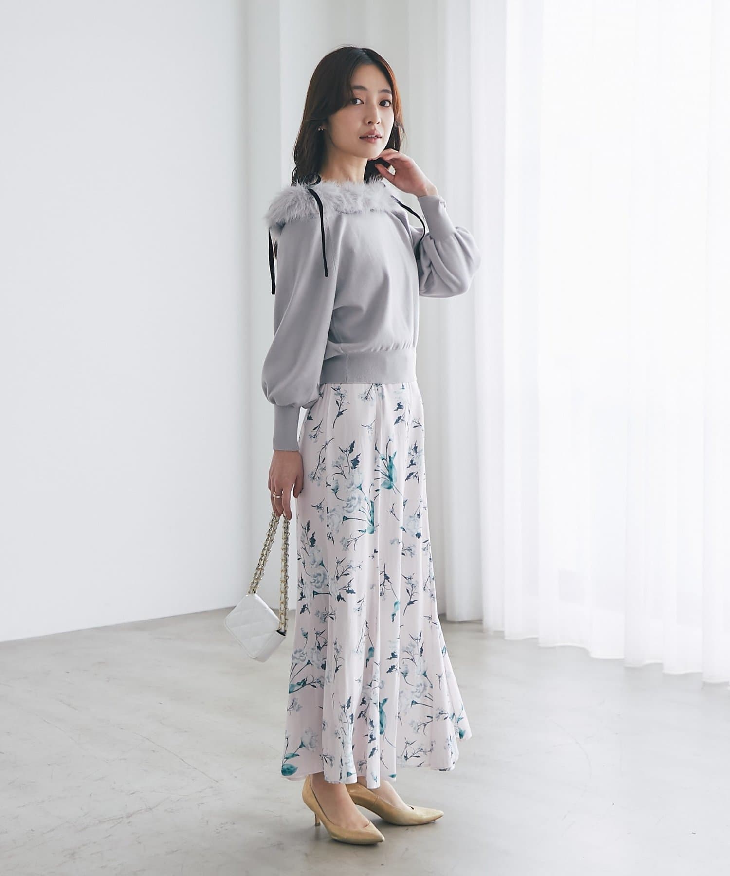 柔らかいタッチと優しい色合いの花柄が、フェミニンな印象に仕上がります。