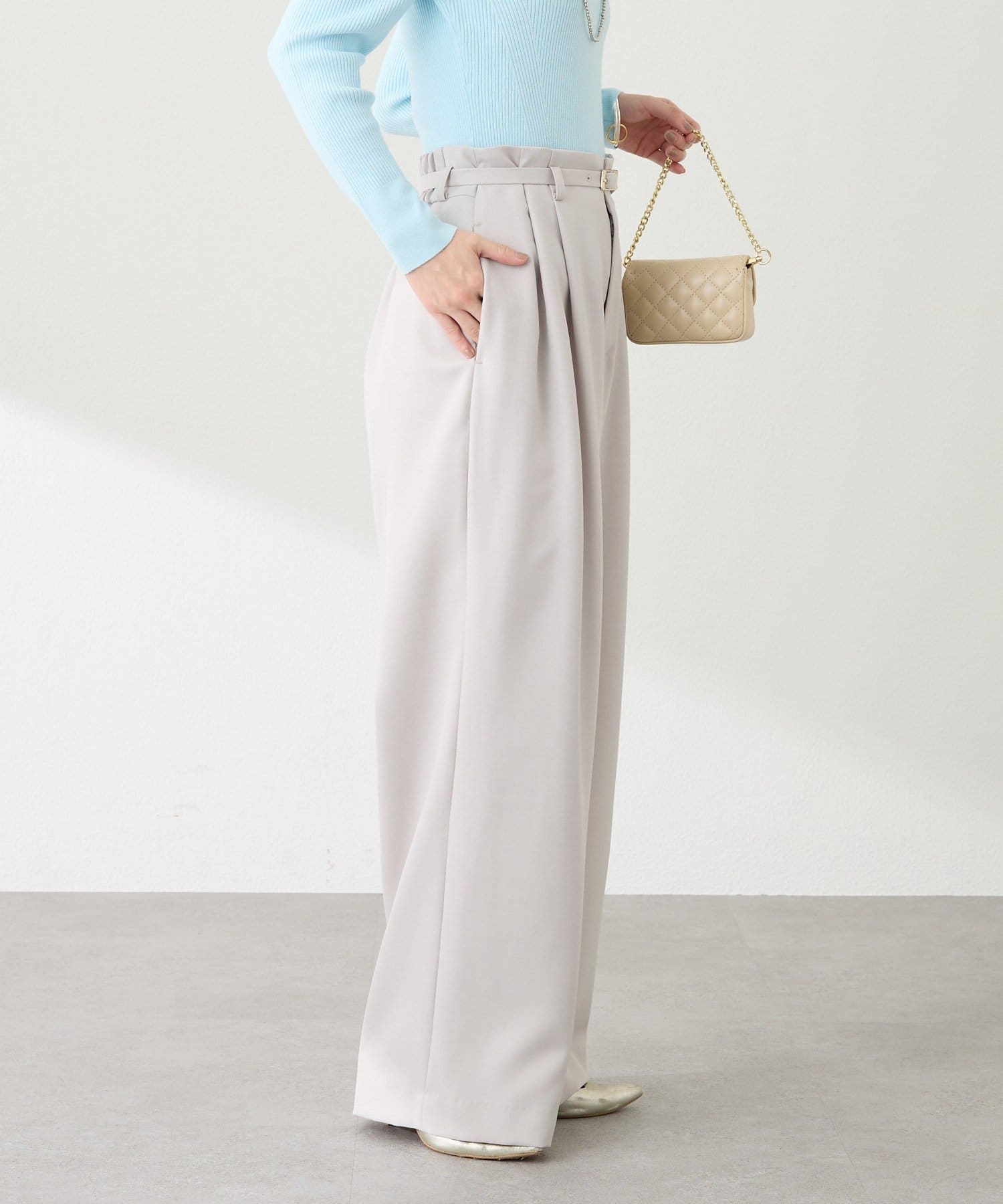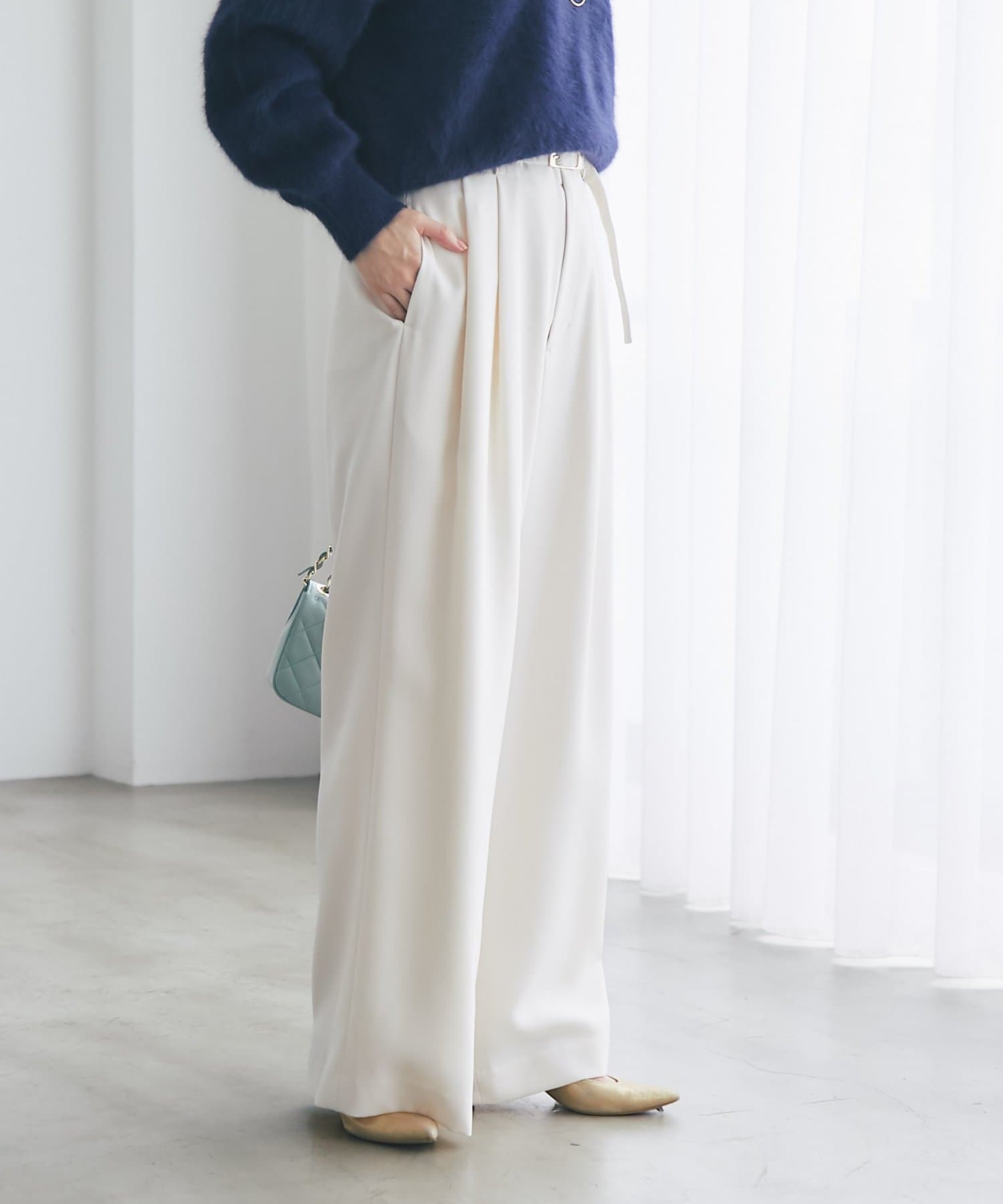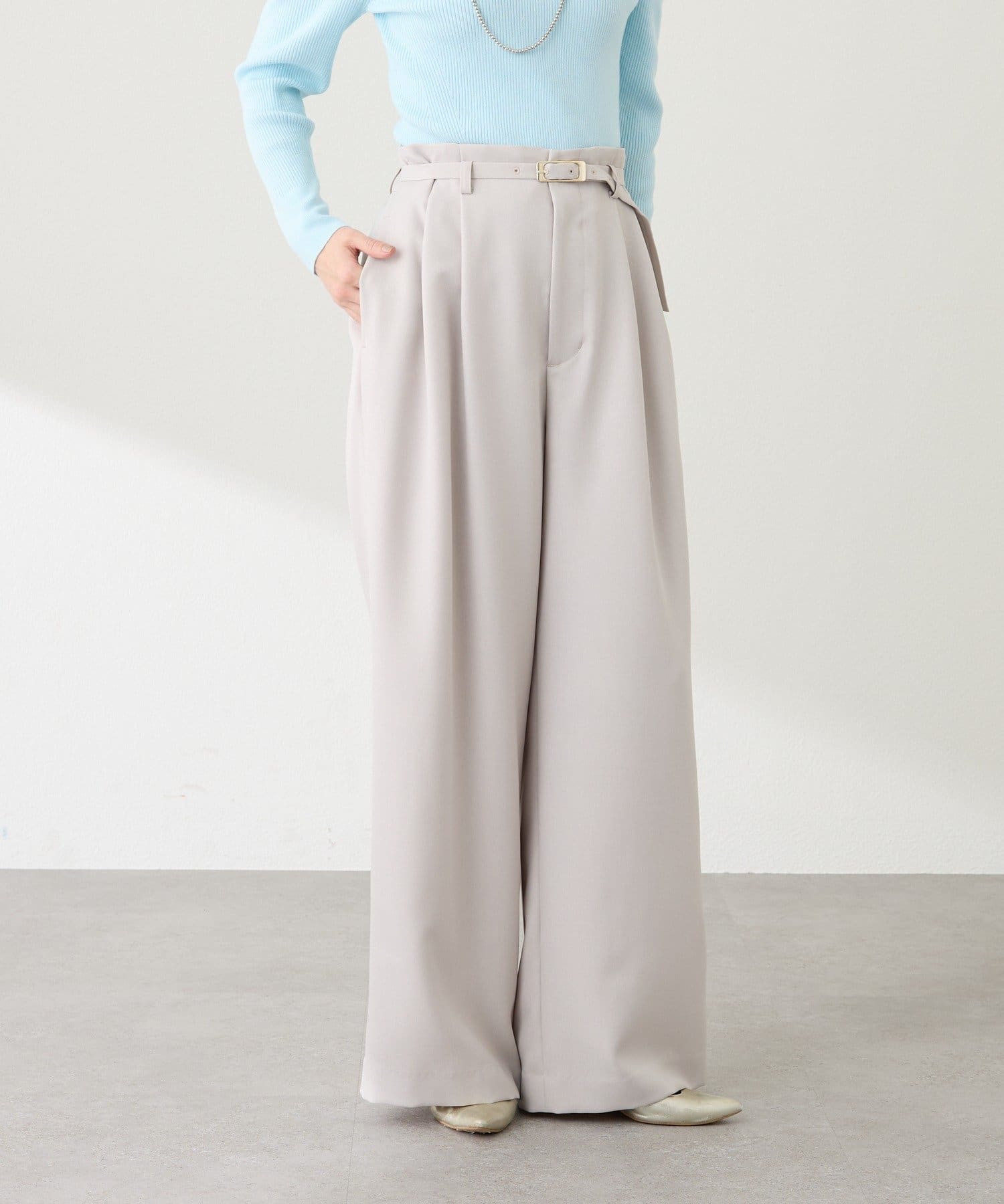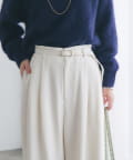 ゴールドのバックルが目を引く、上品なベルト付きワイドパンツ。