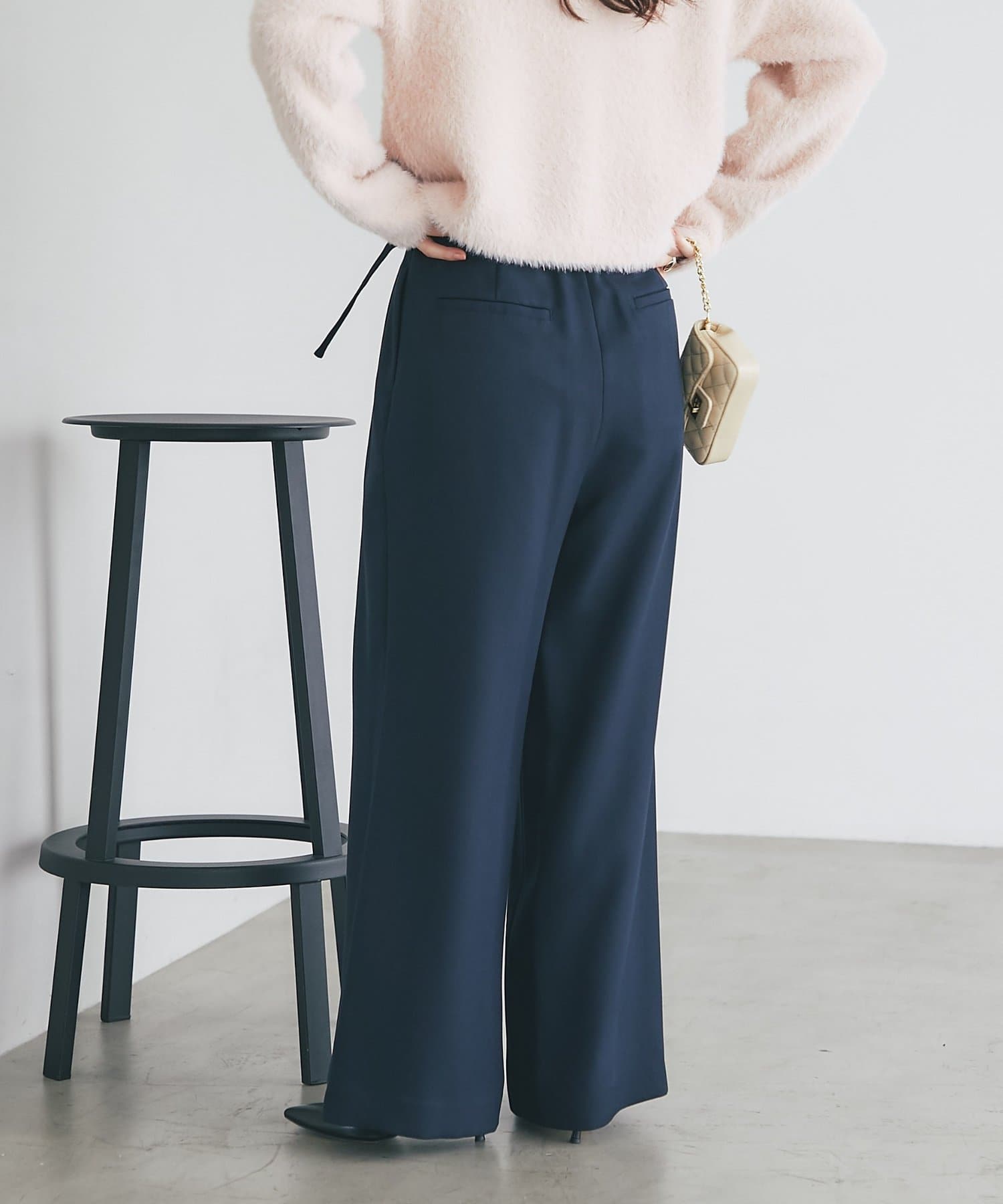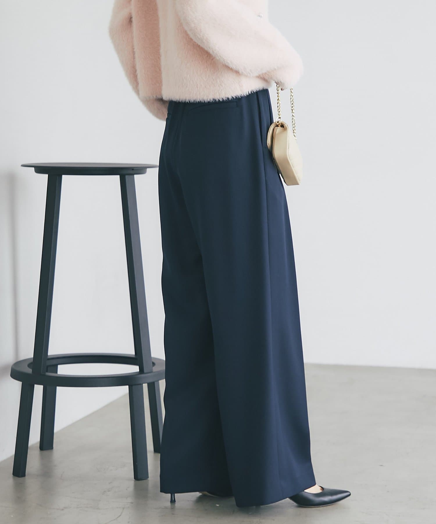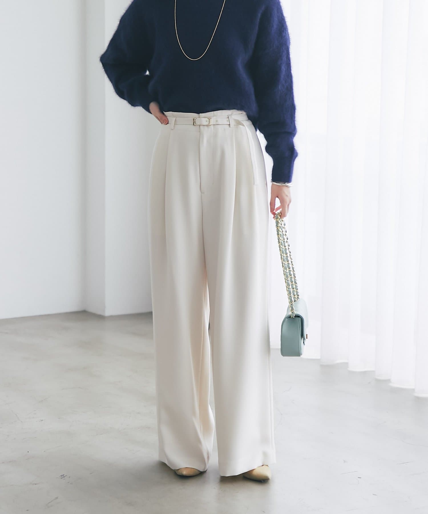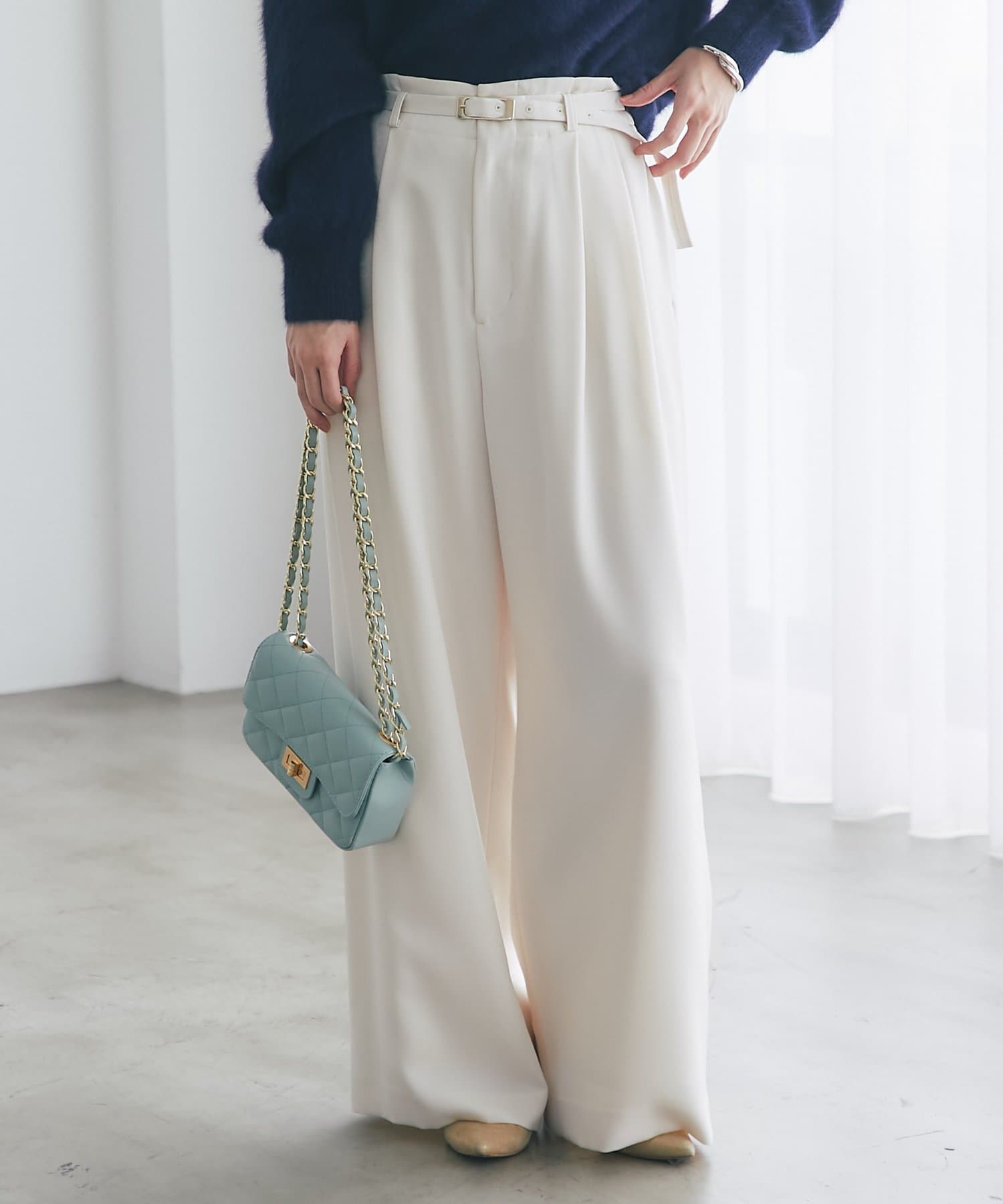 ゴールドのバックルが目を引く、上品なベルト付きワイドパンツ。