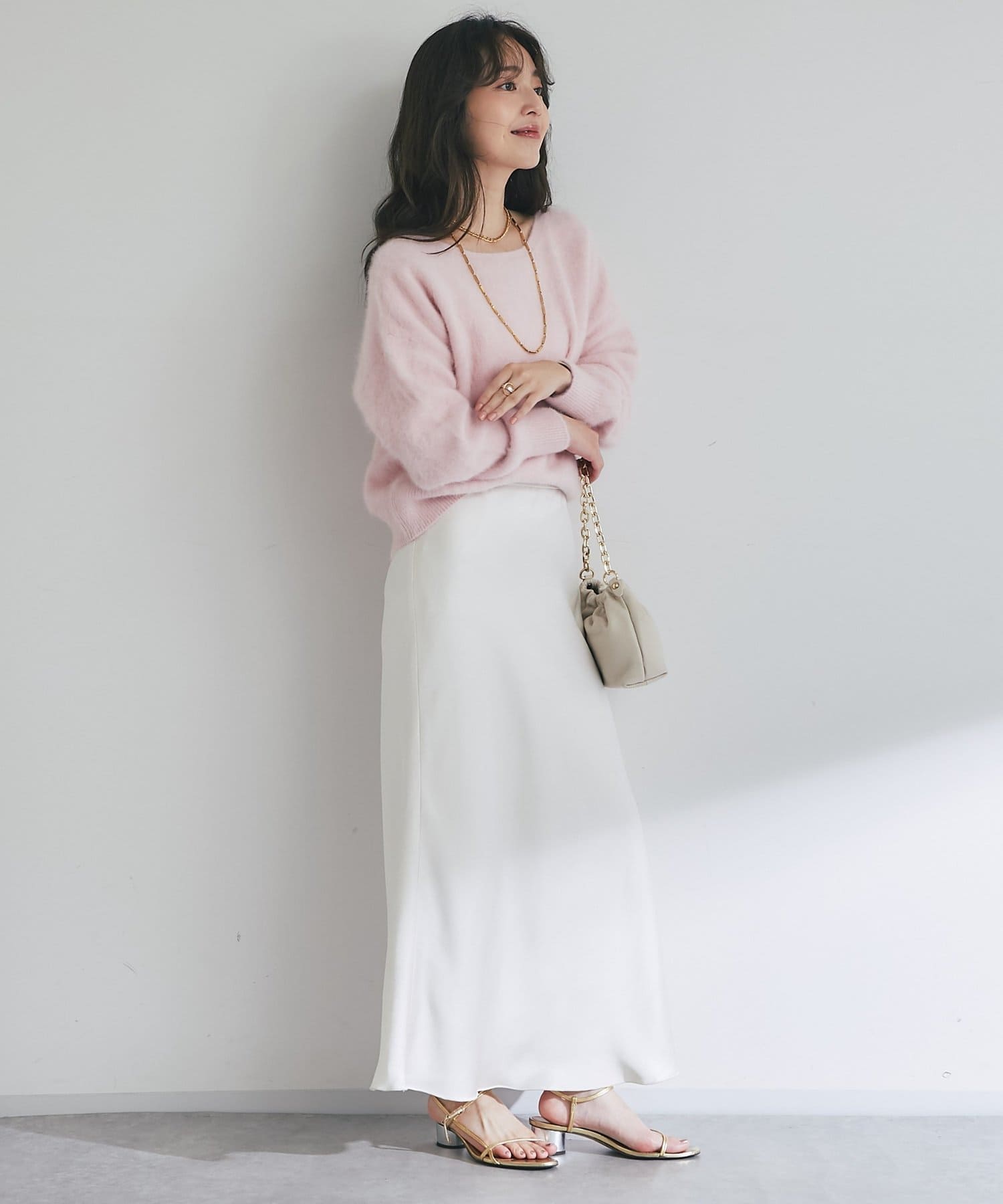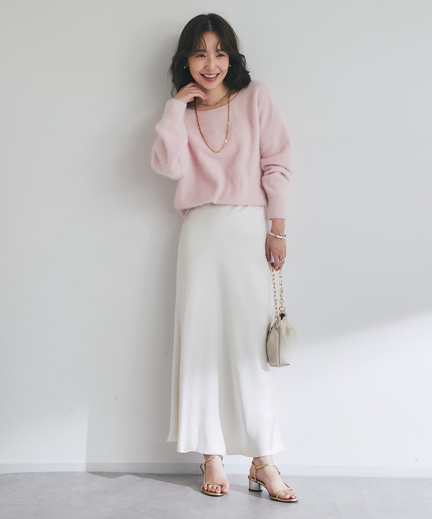 光沢のあるスカートなど、素材に特徴があるボトムス合わせは