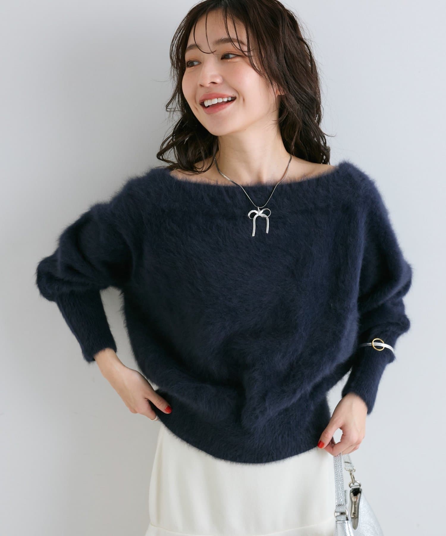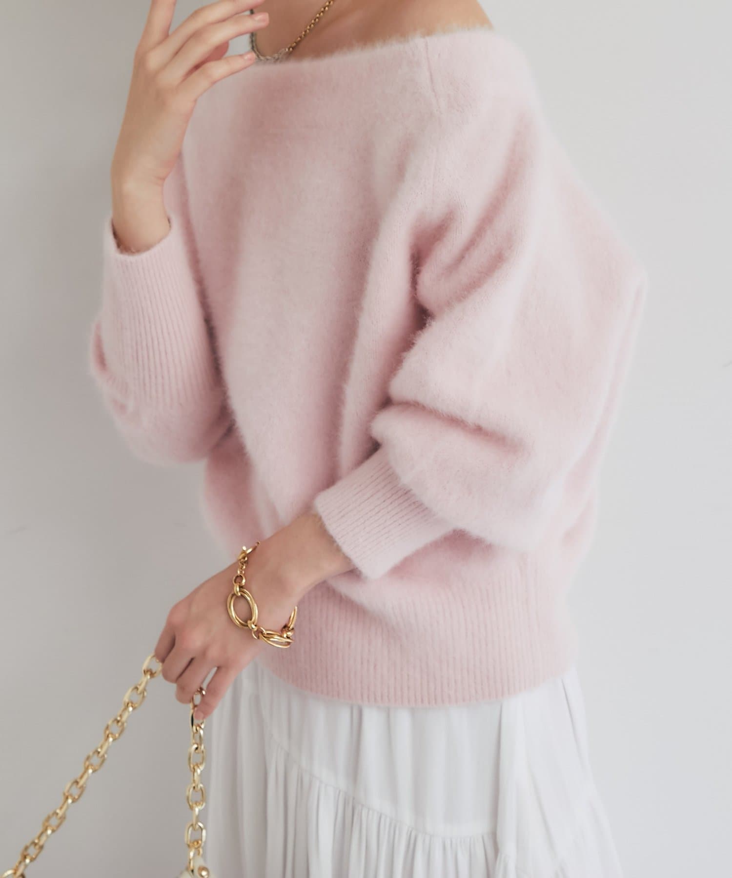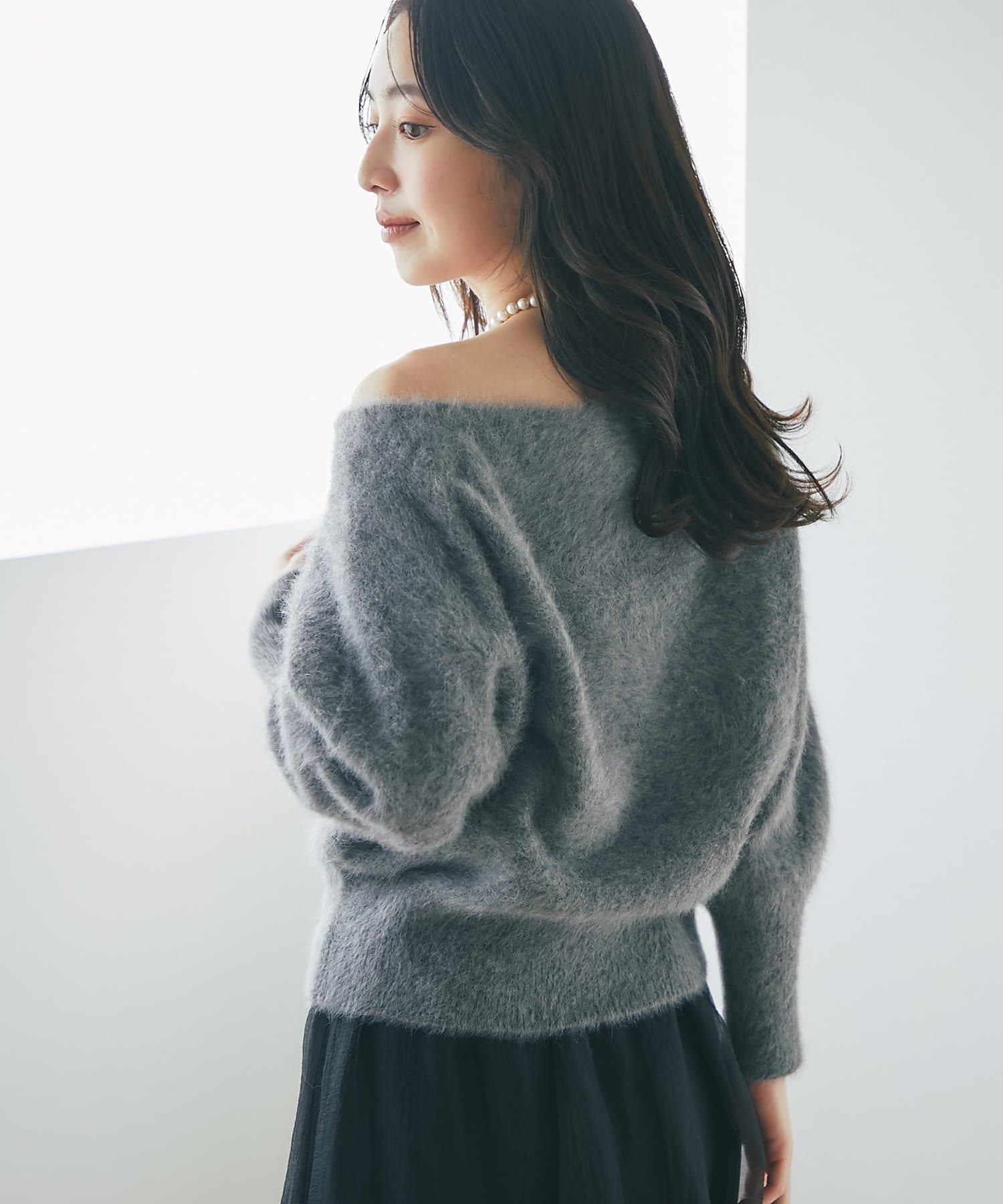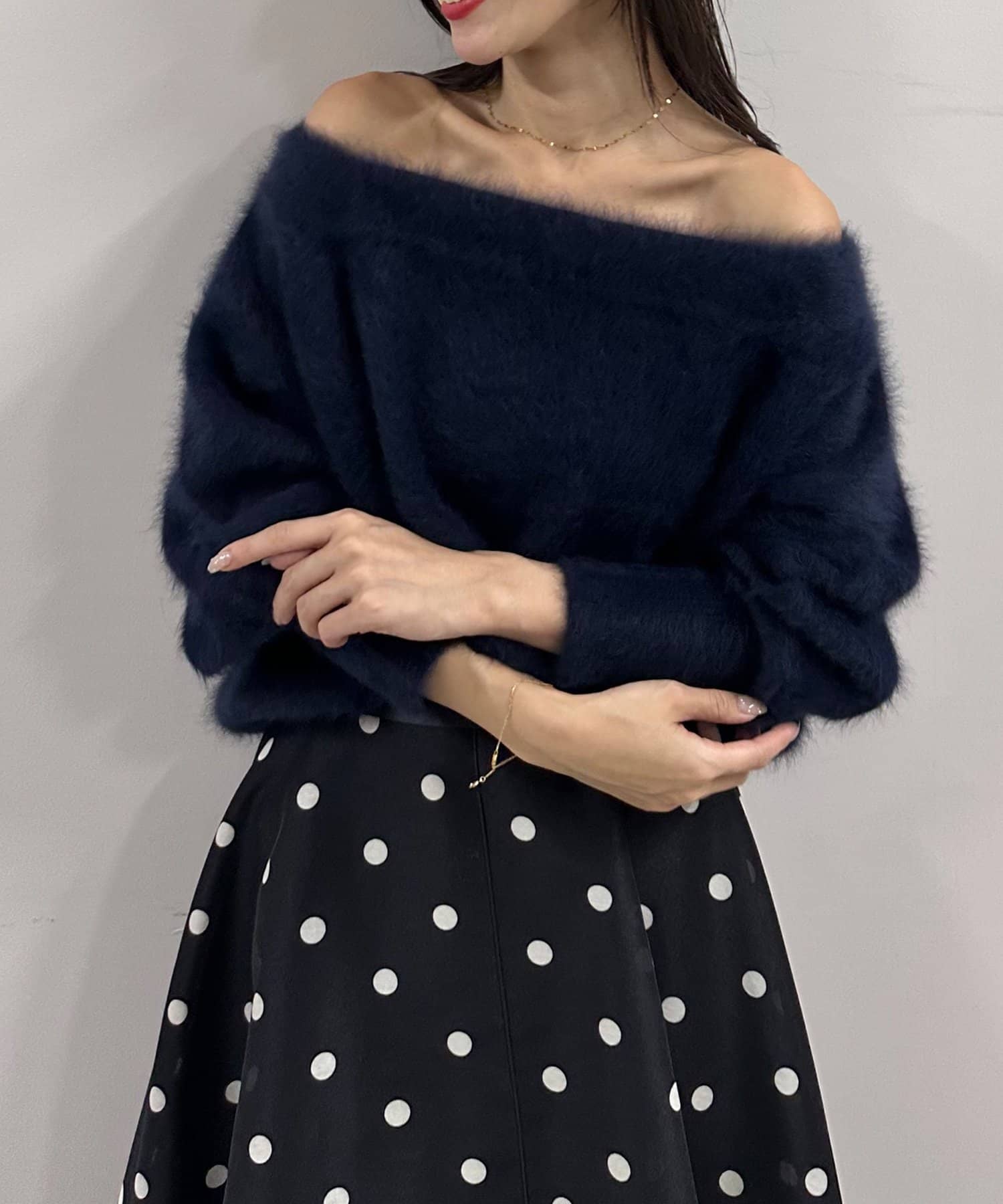 へアリーなフォックス混の女性らしさが詰まったオフショルニット。