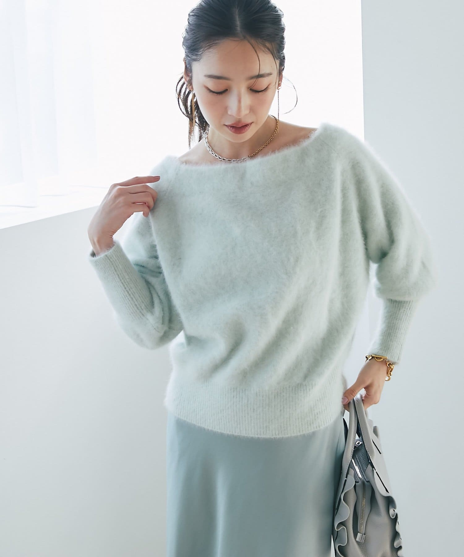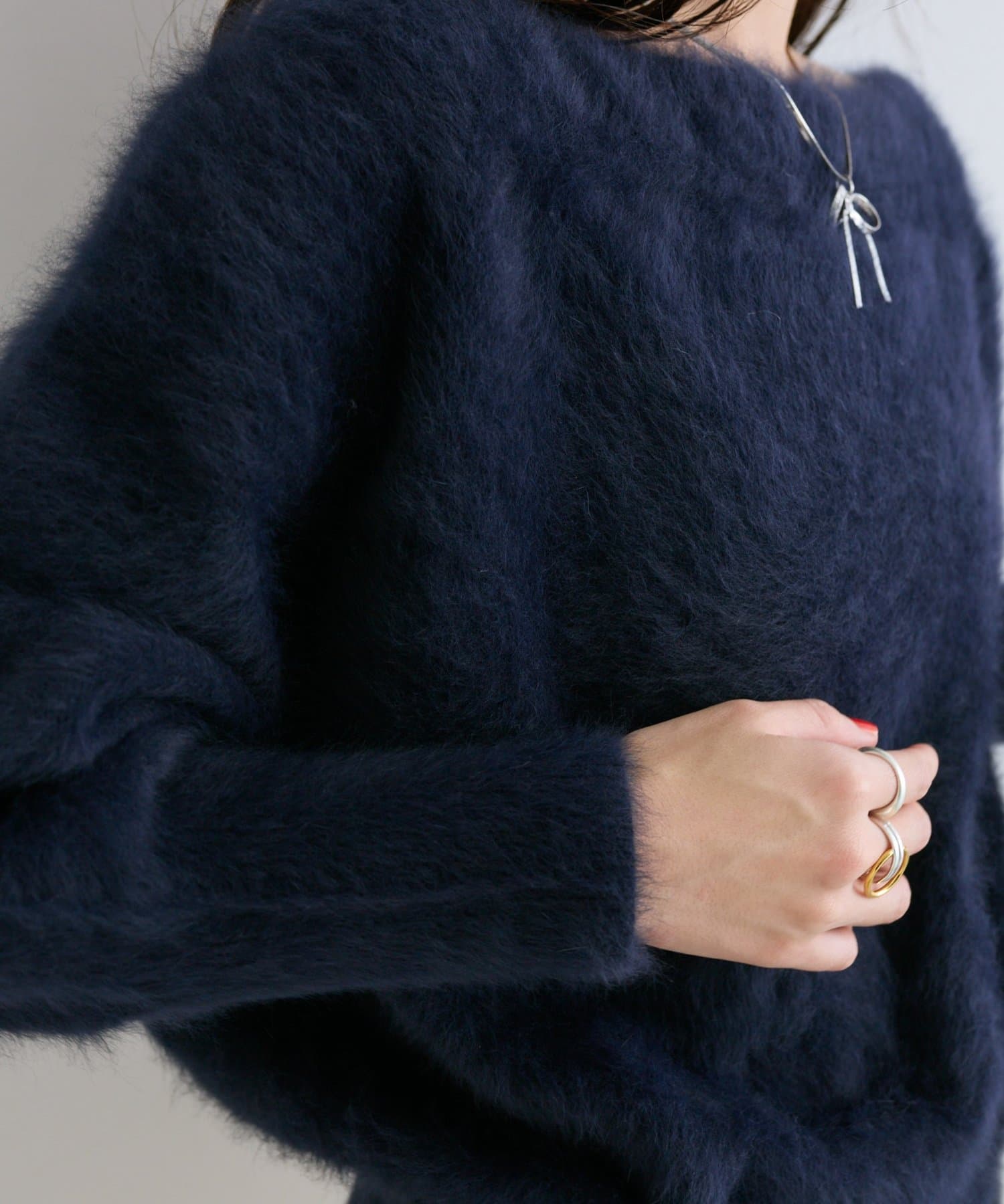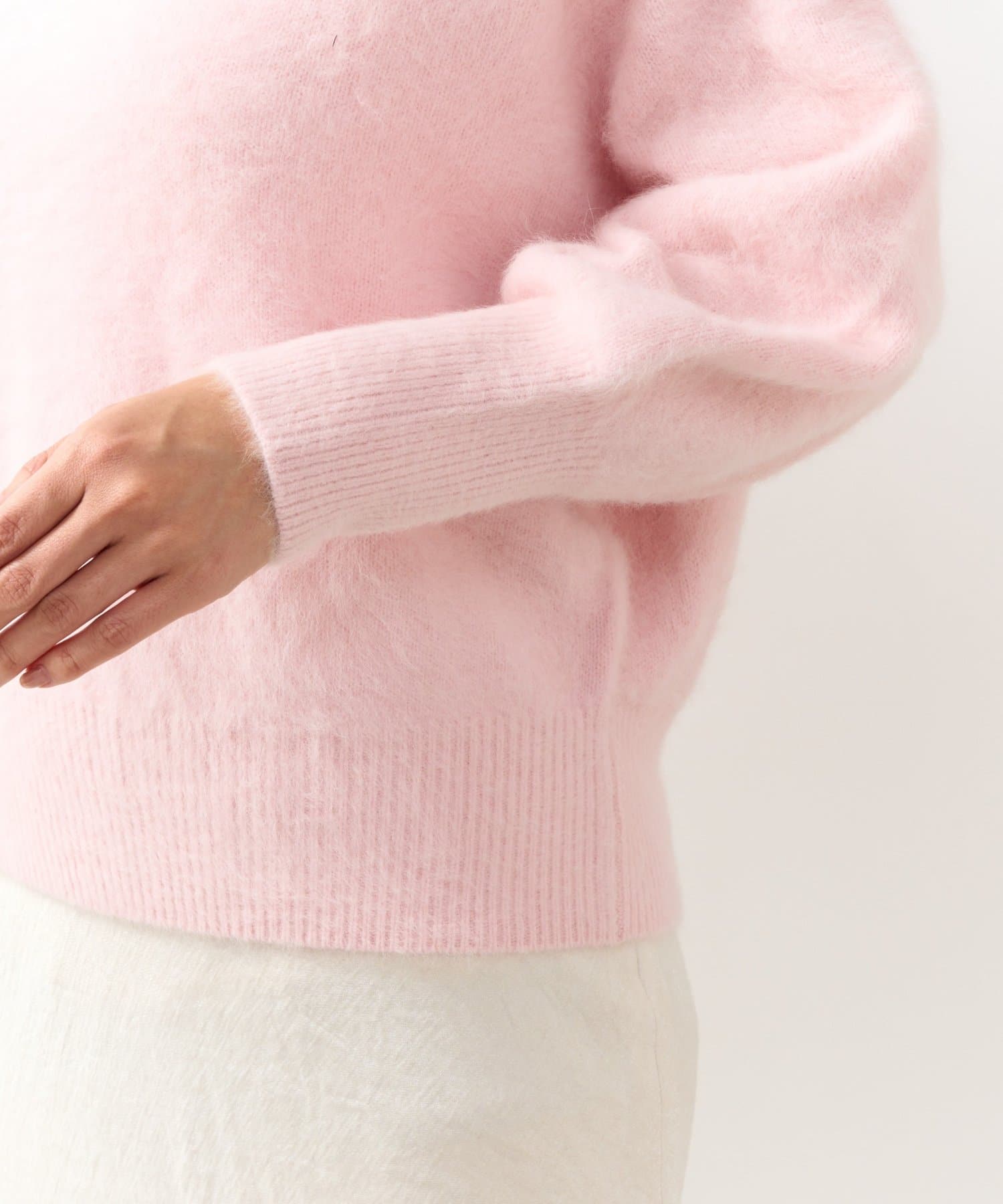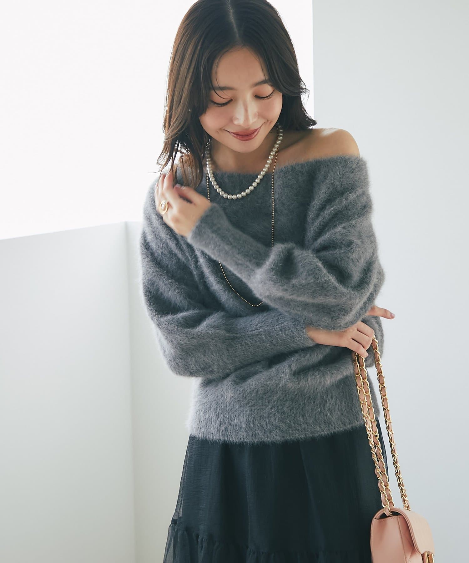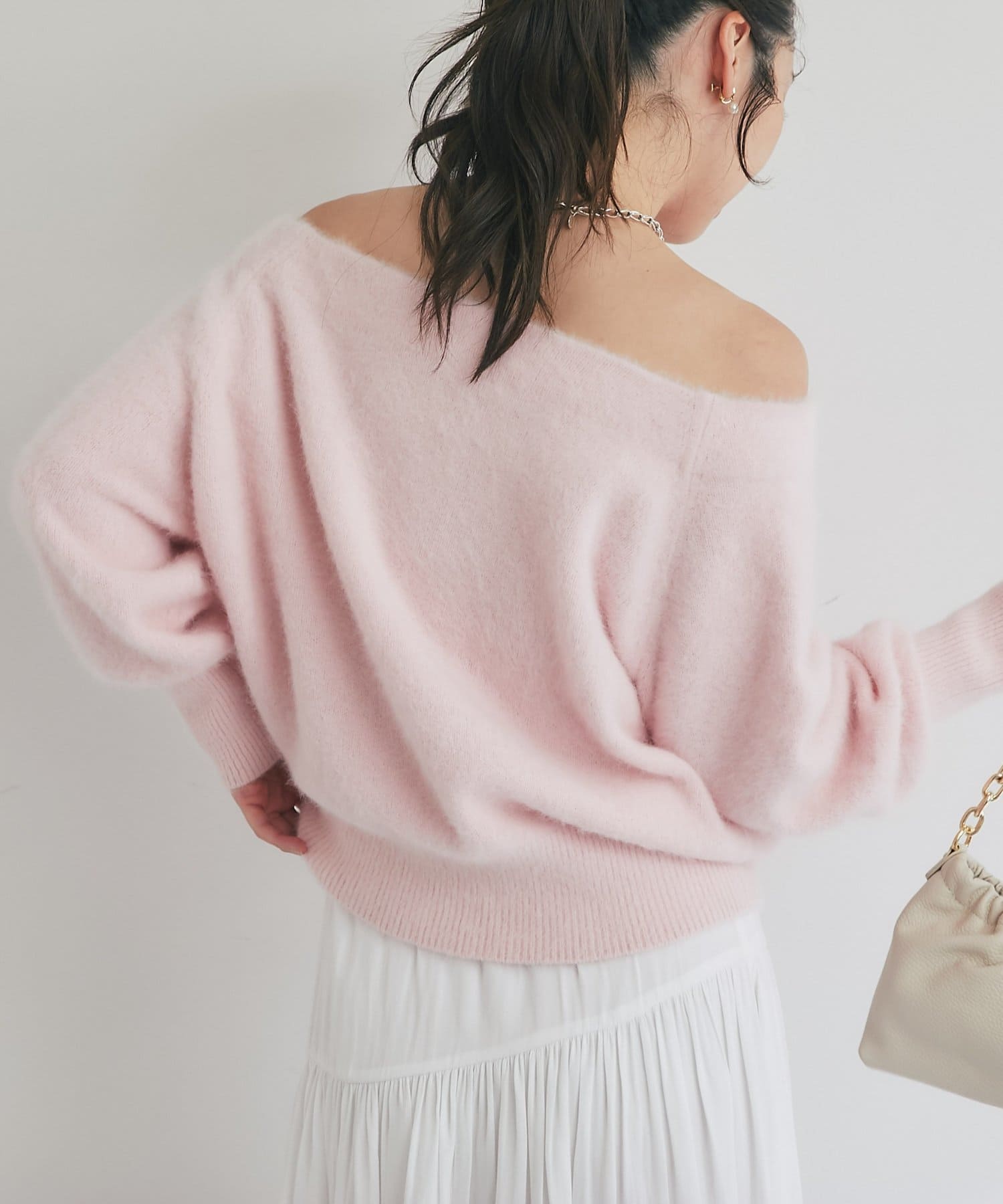 へアリーなフォックス混の女性らしさが詰まったオフショルニット。