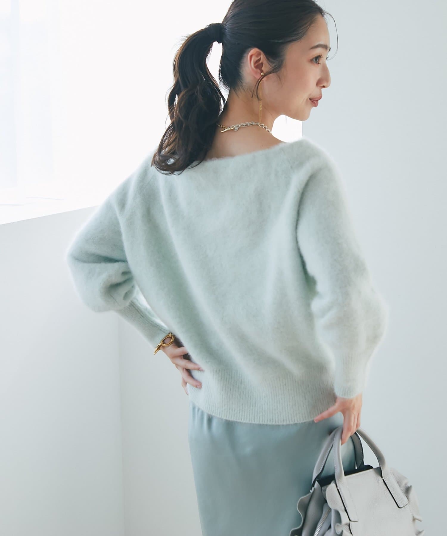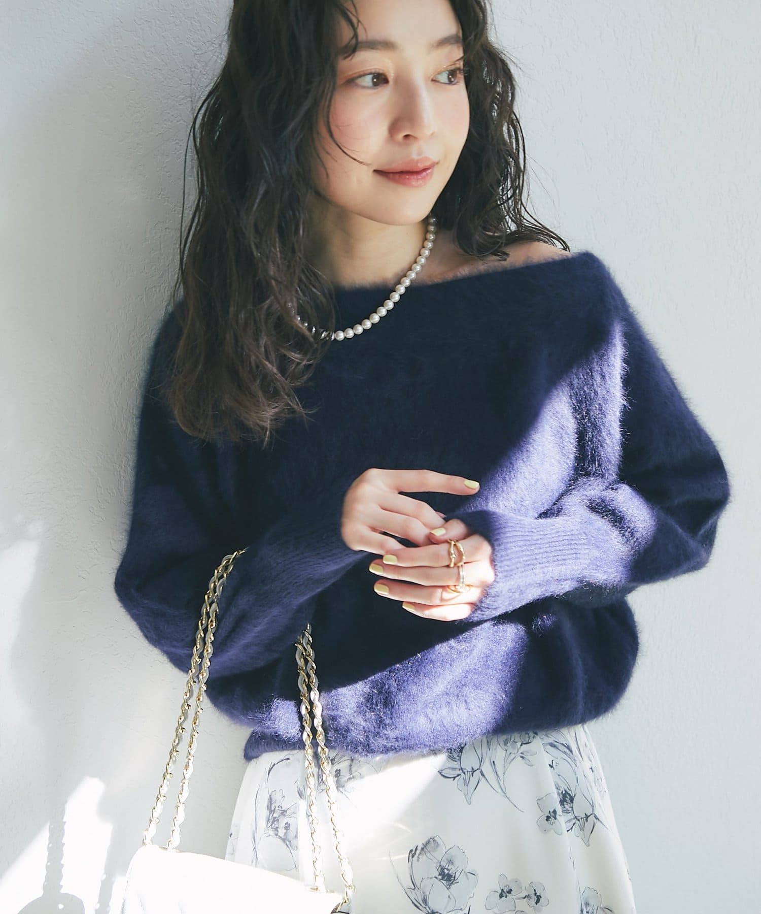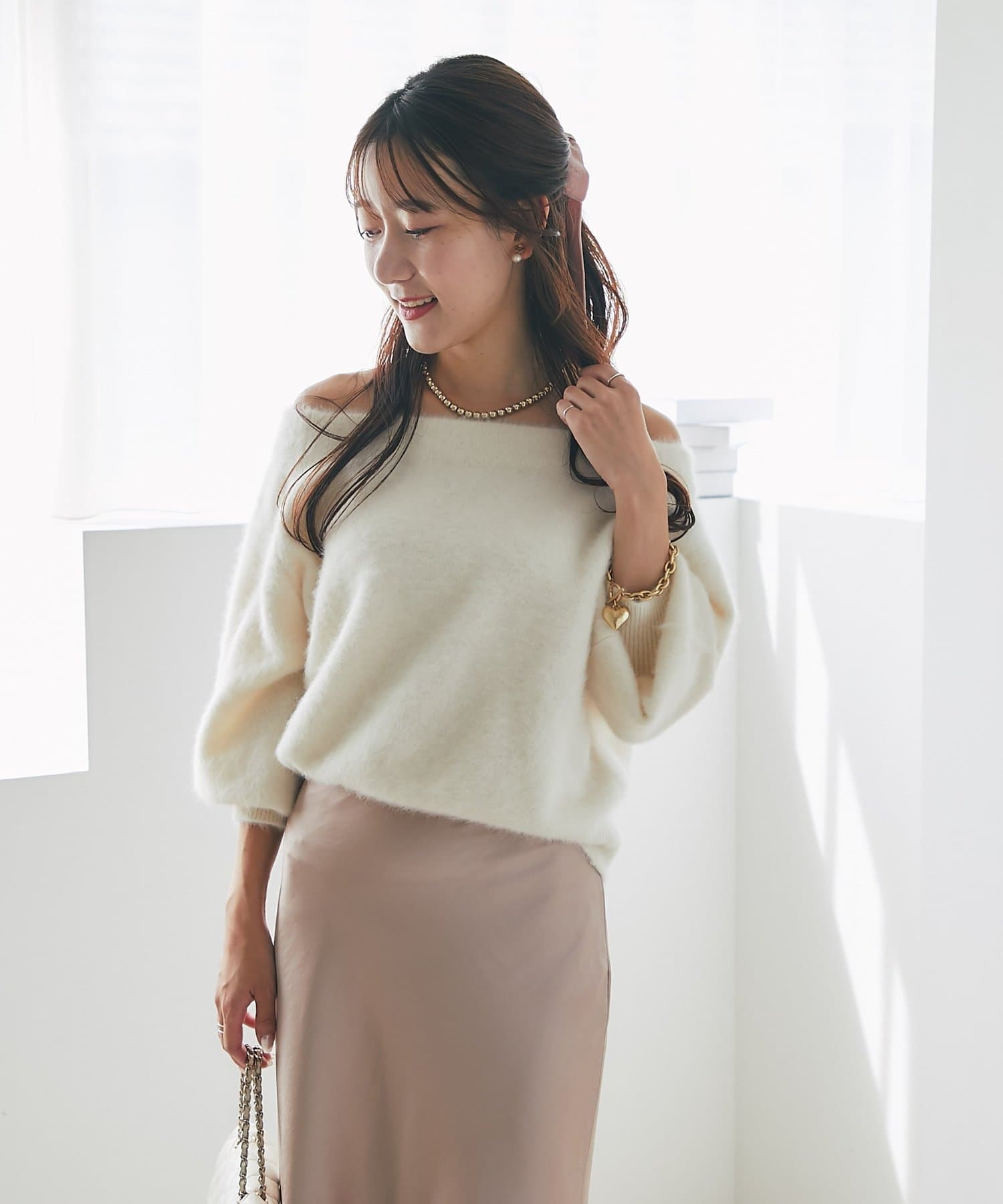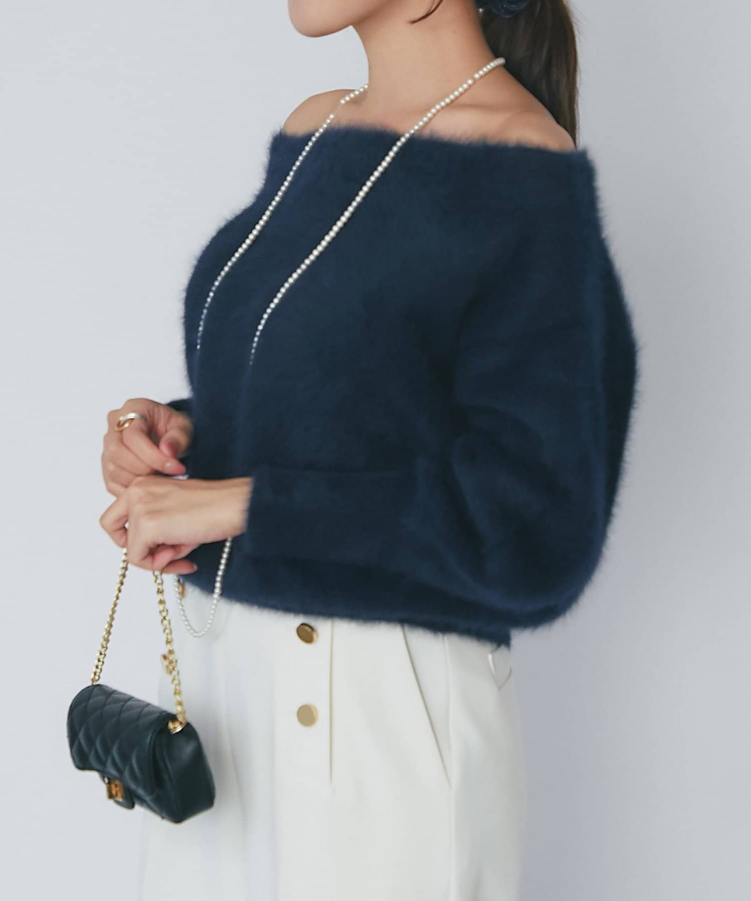 へアリーなフォックス混の女性らしさが詰まったオフショルニット。