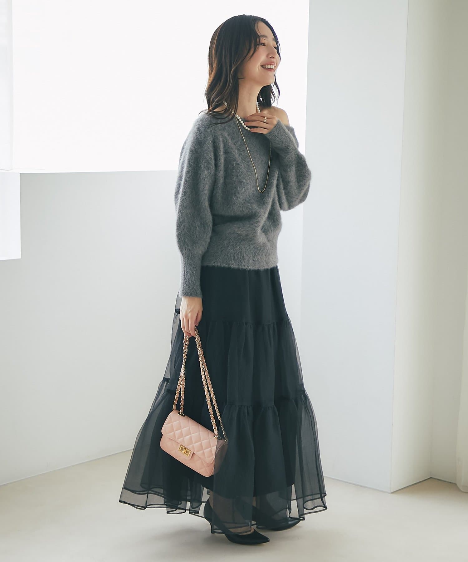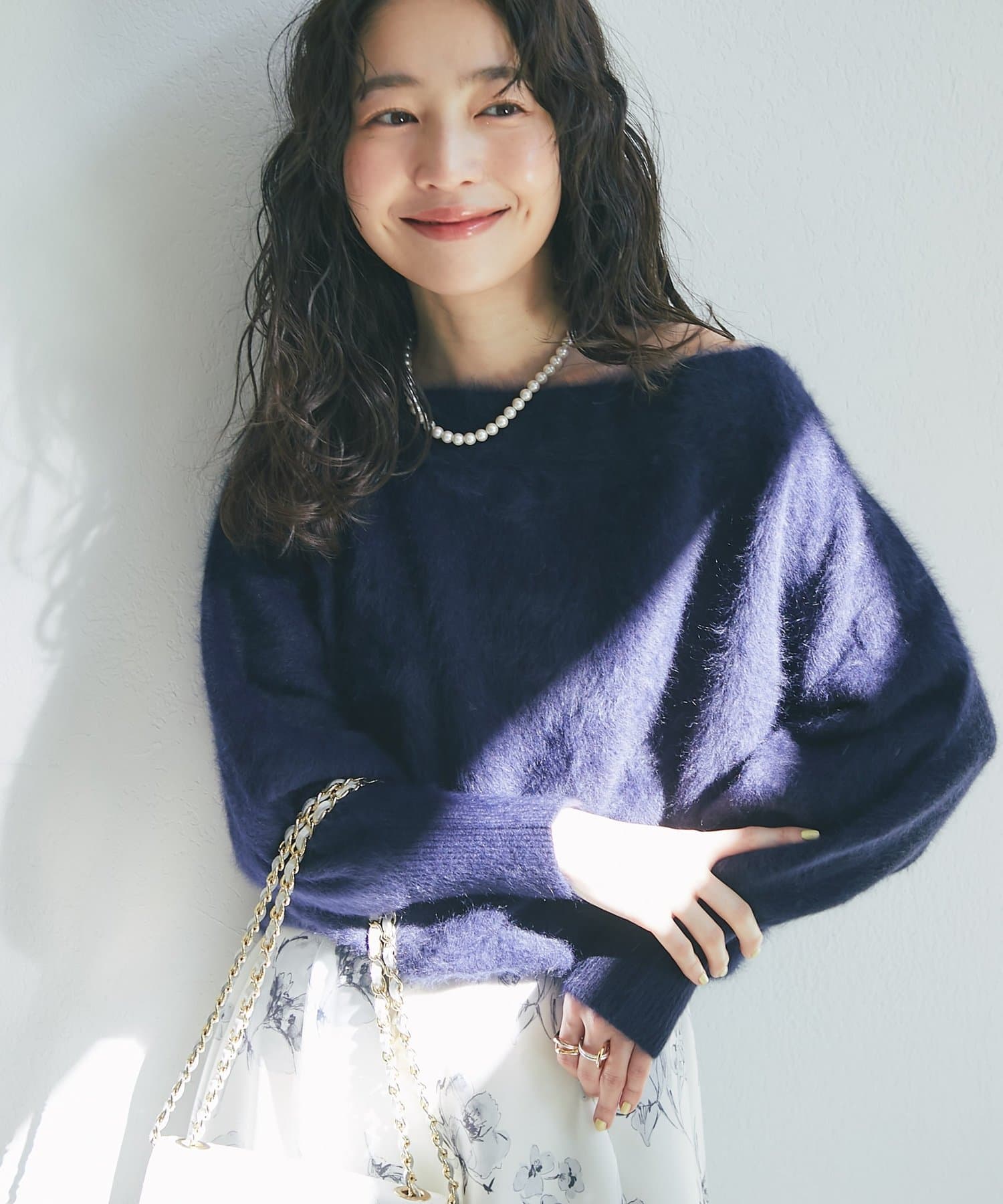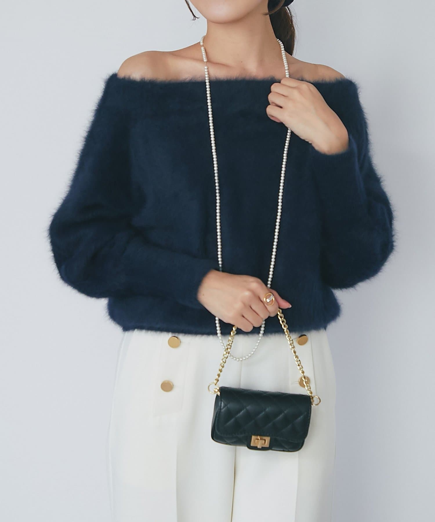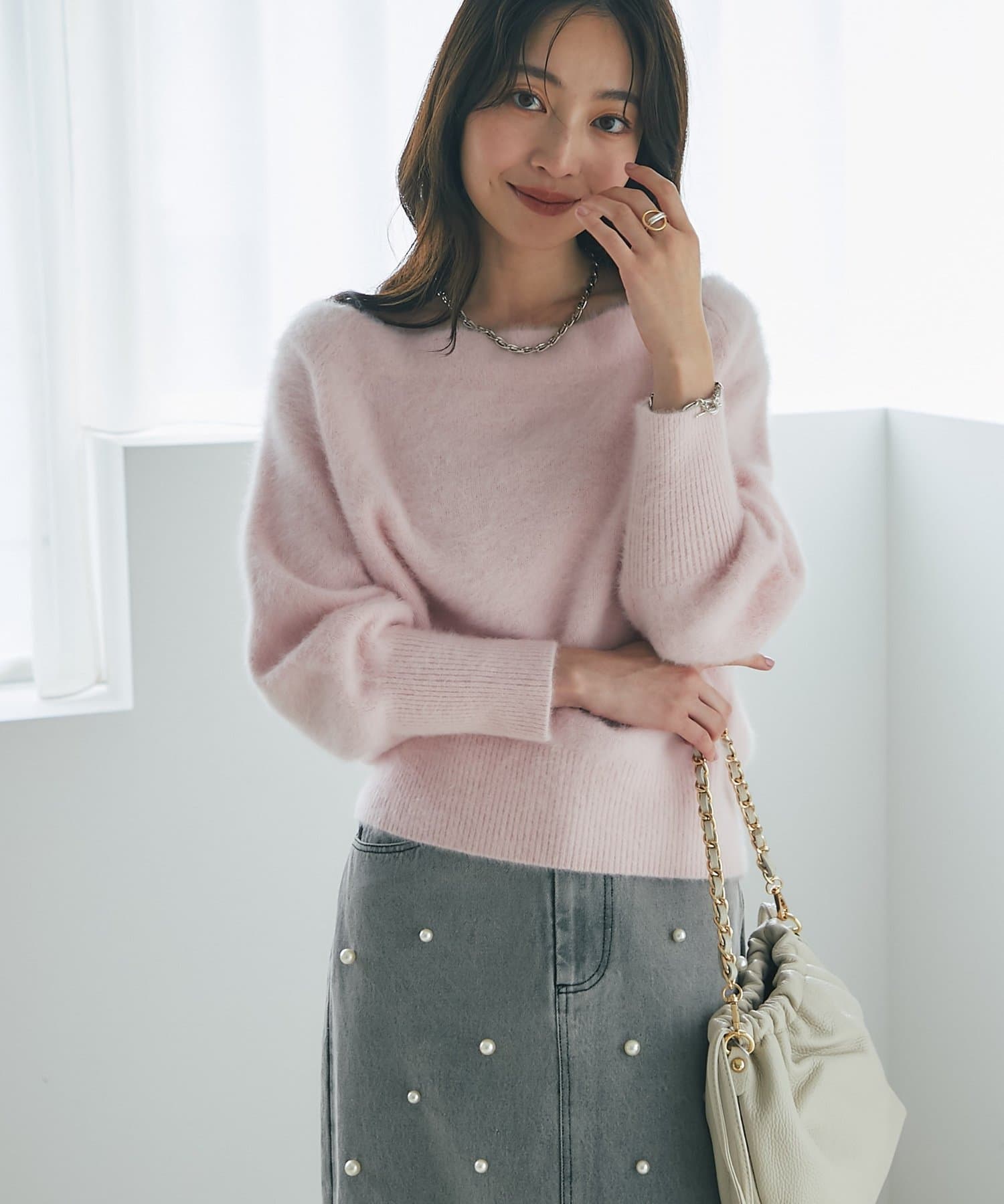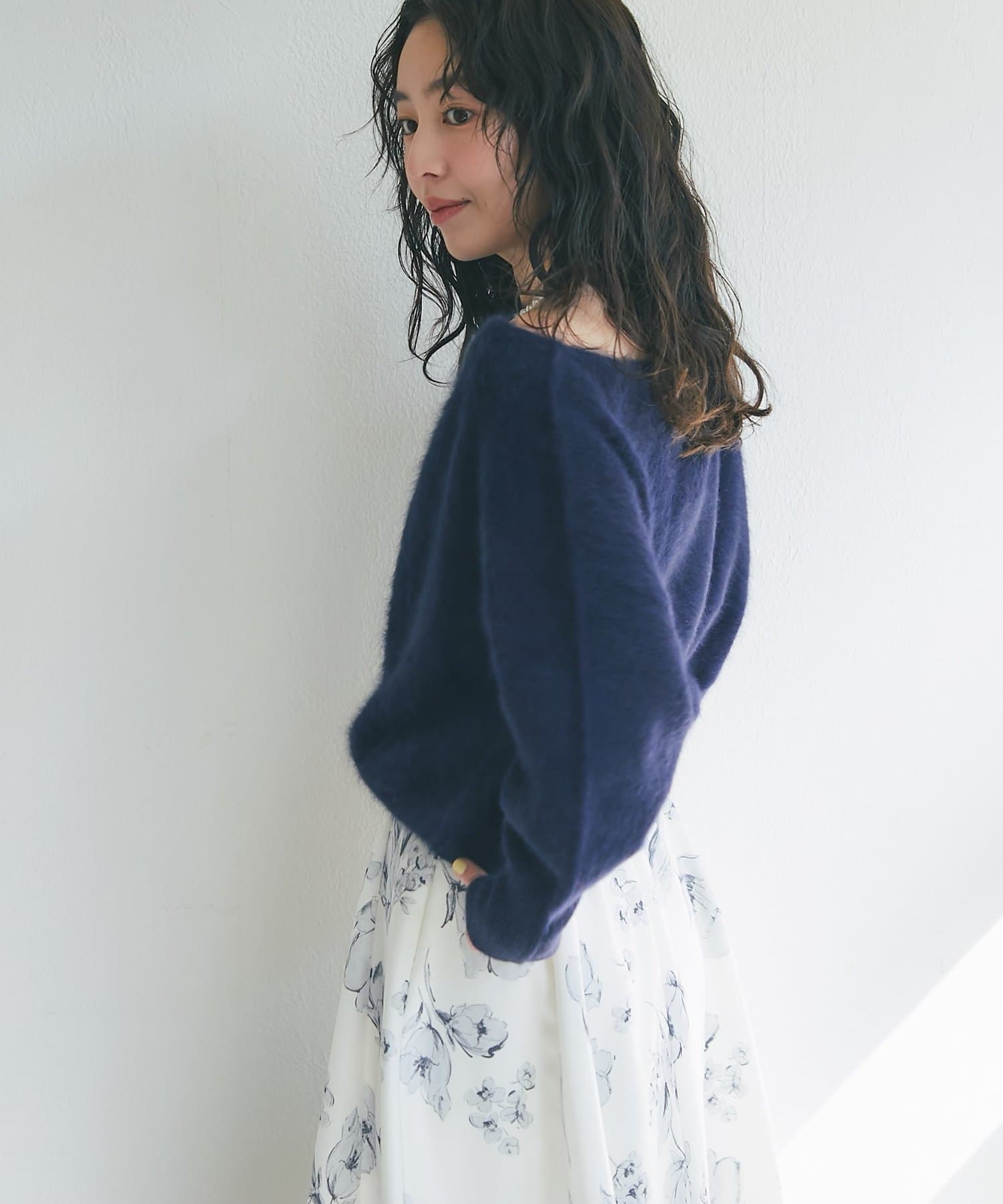 へアリーなフォックス混の女性らしさが詰まったオフショルニット。