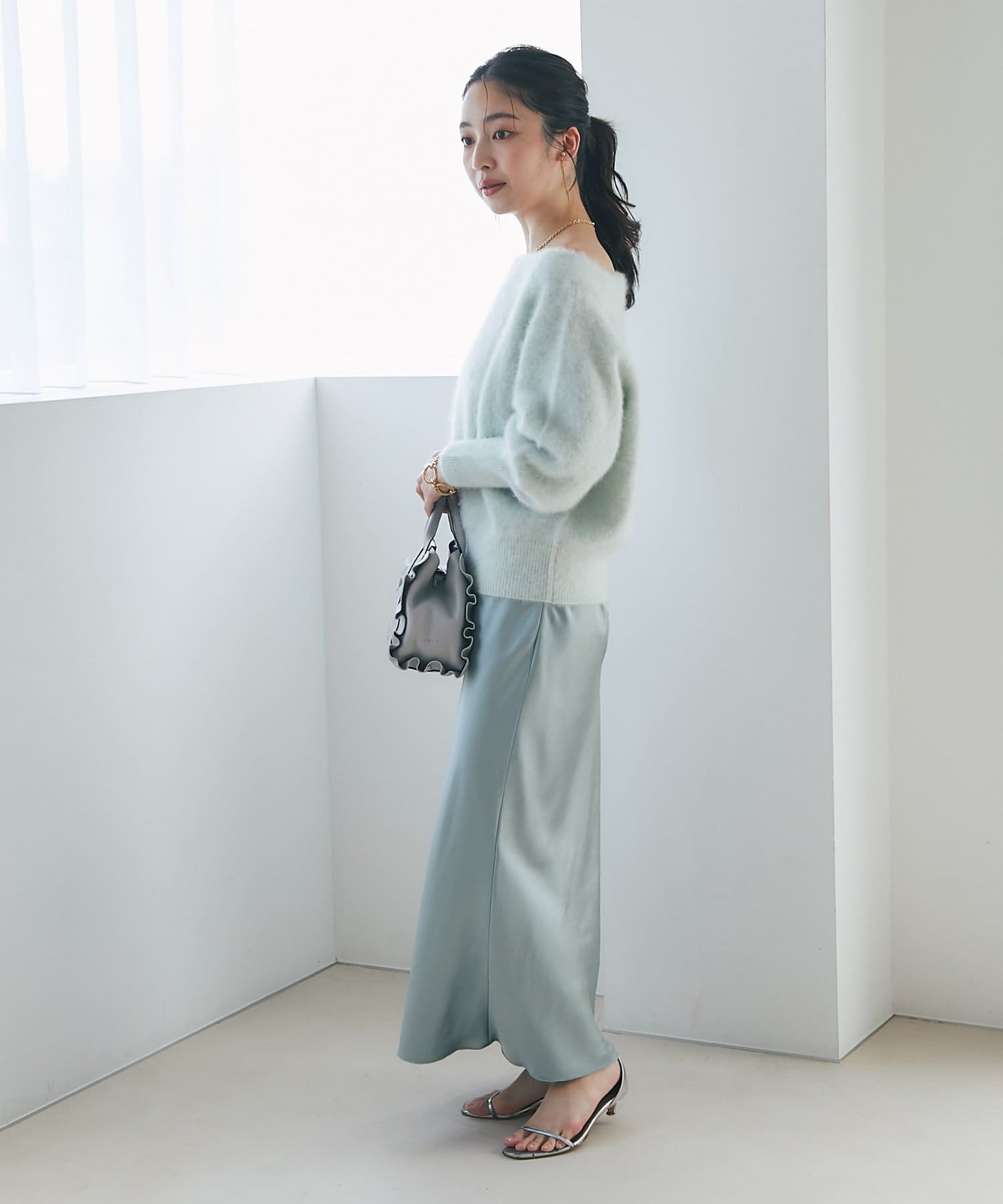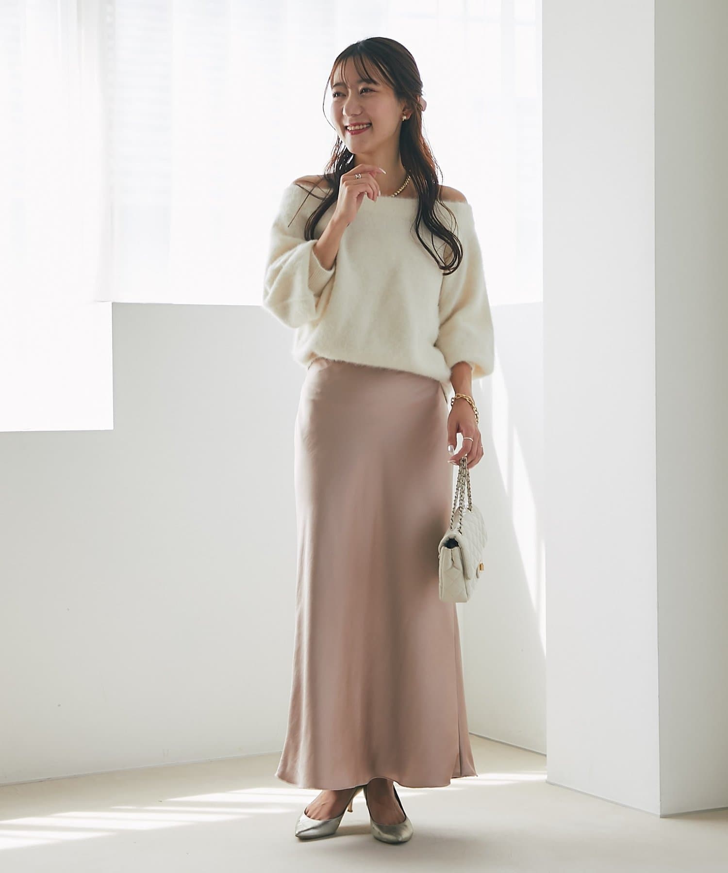光沢のあるスカートなど、素材に特徴があるボトムス合わせは