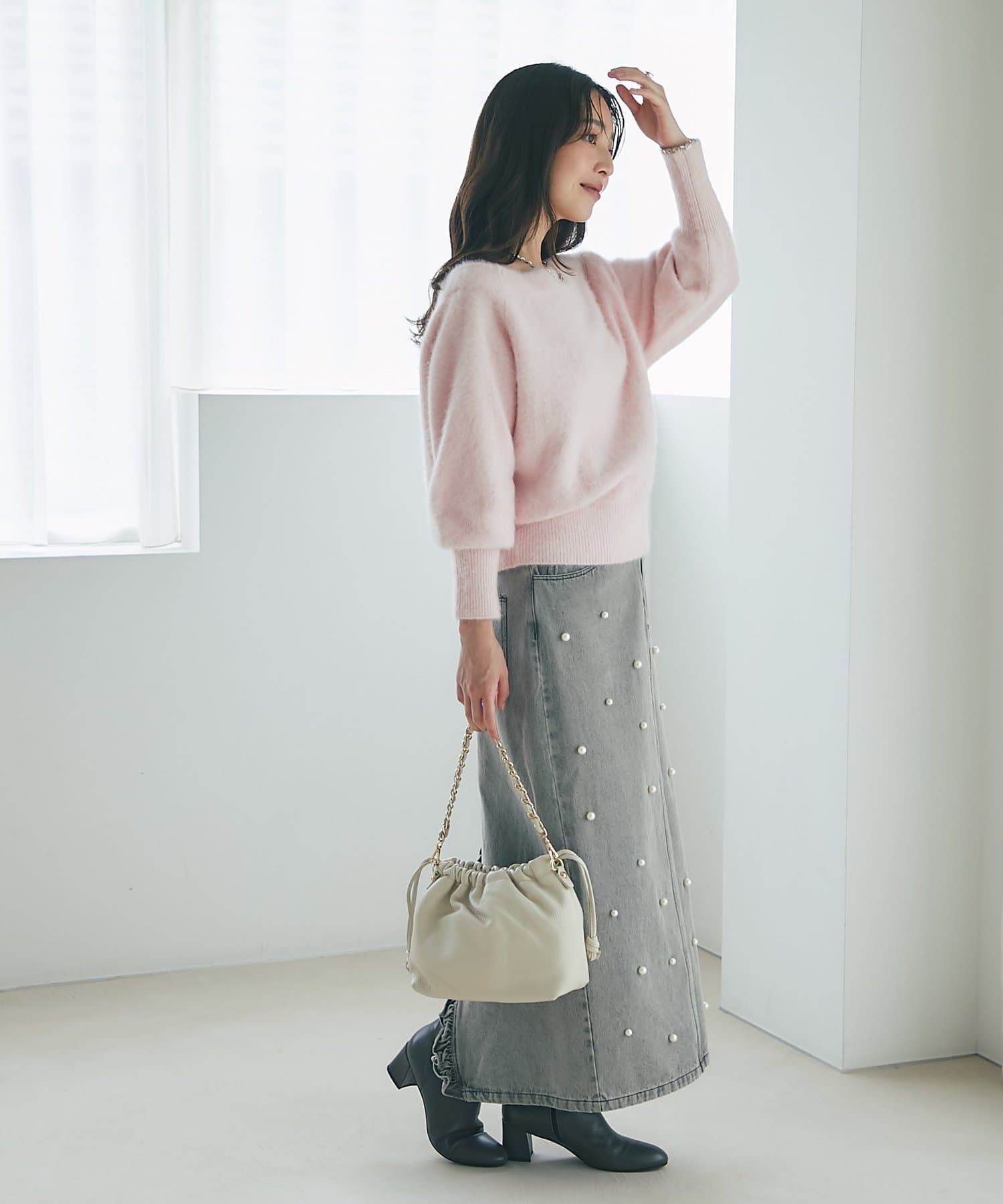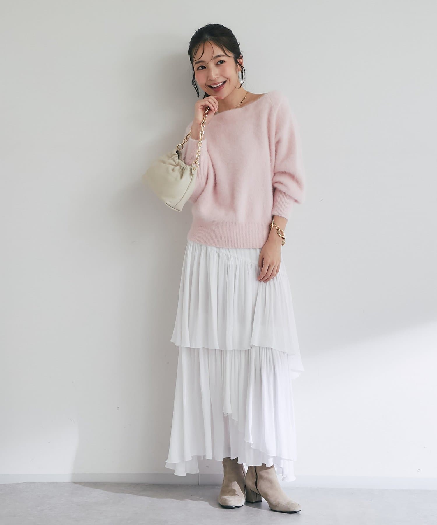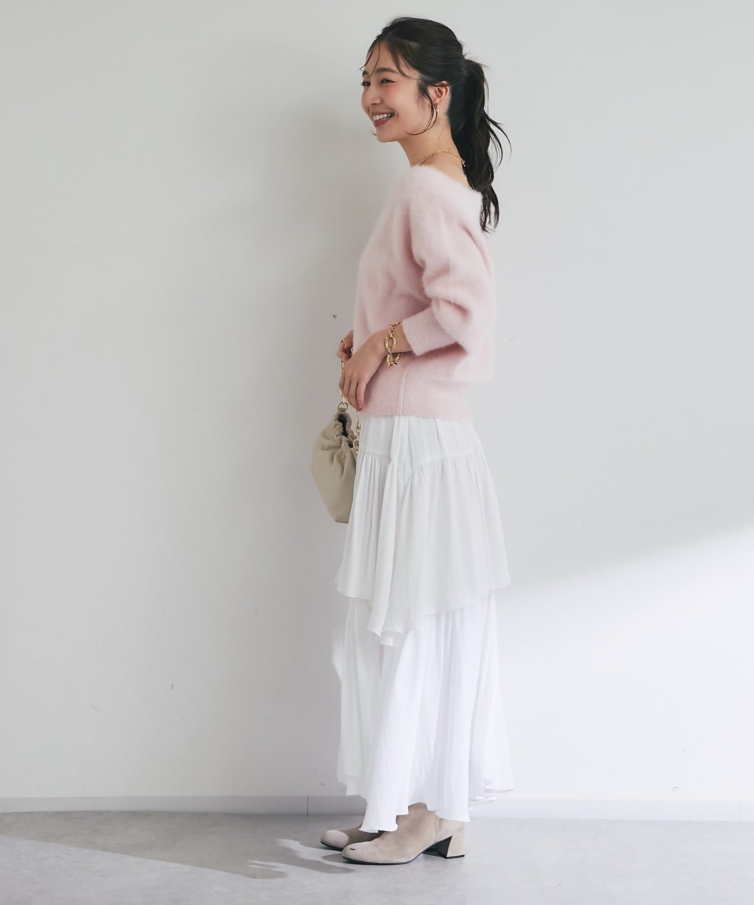 ボトムスはスカートからパンツまで幅ひろく合わせられます。