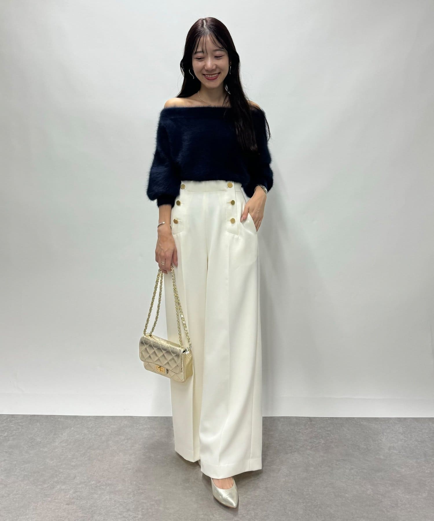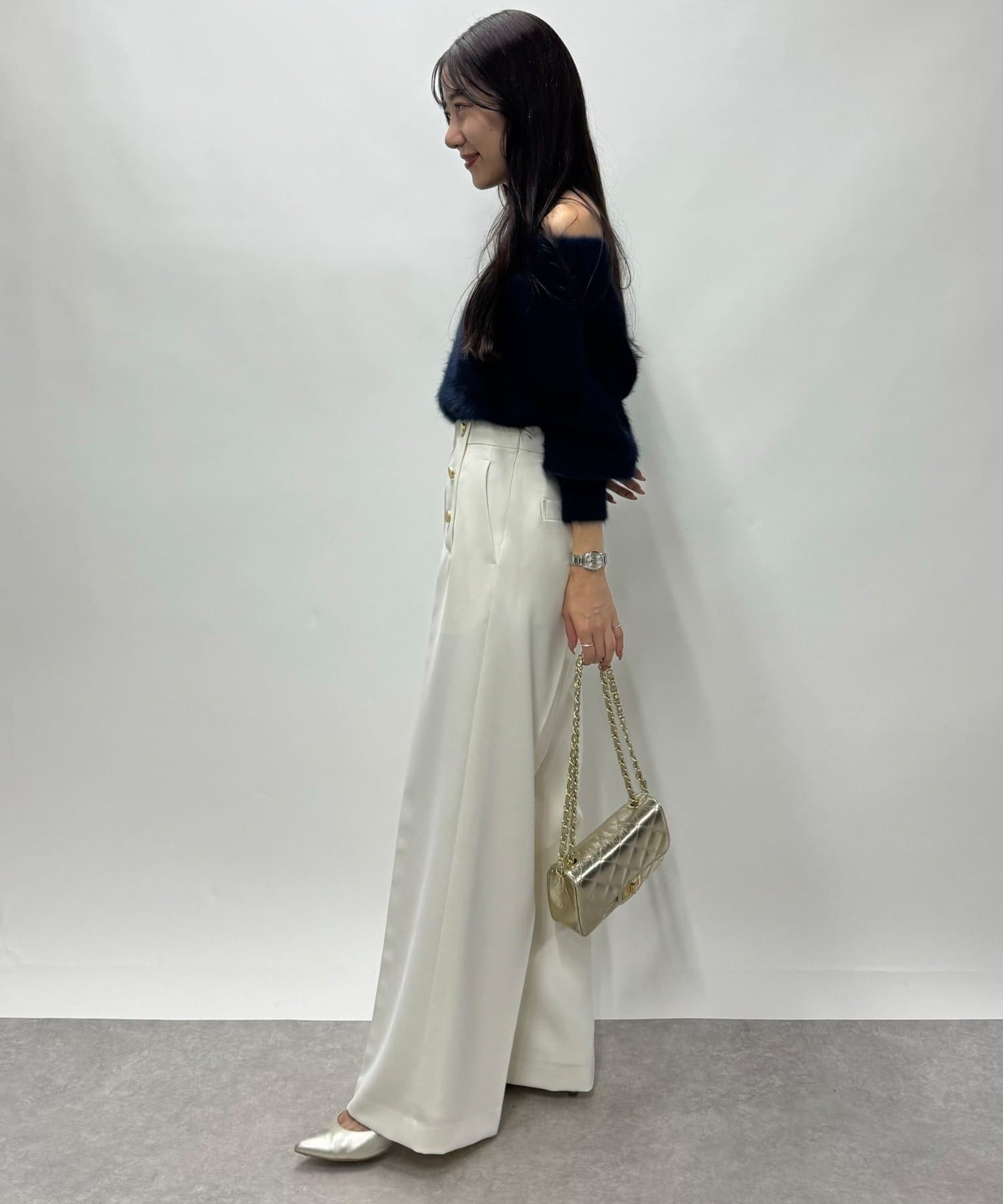 ・オフショルでデコルテが上品に美しく見える。