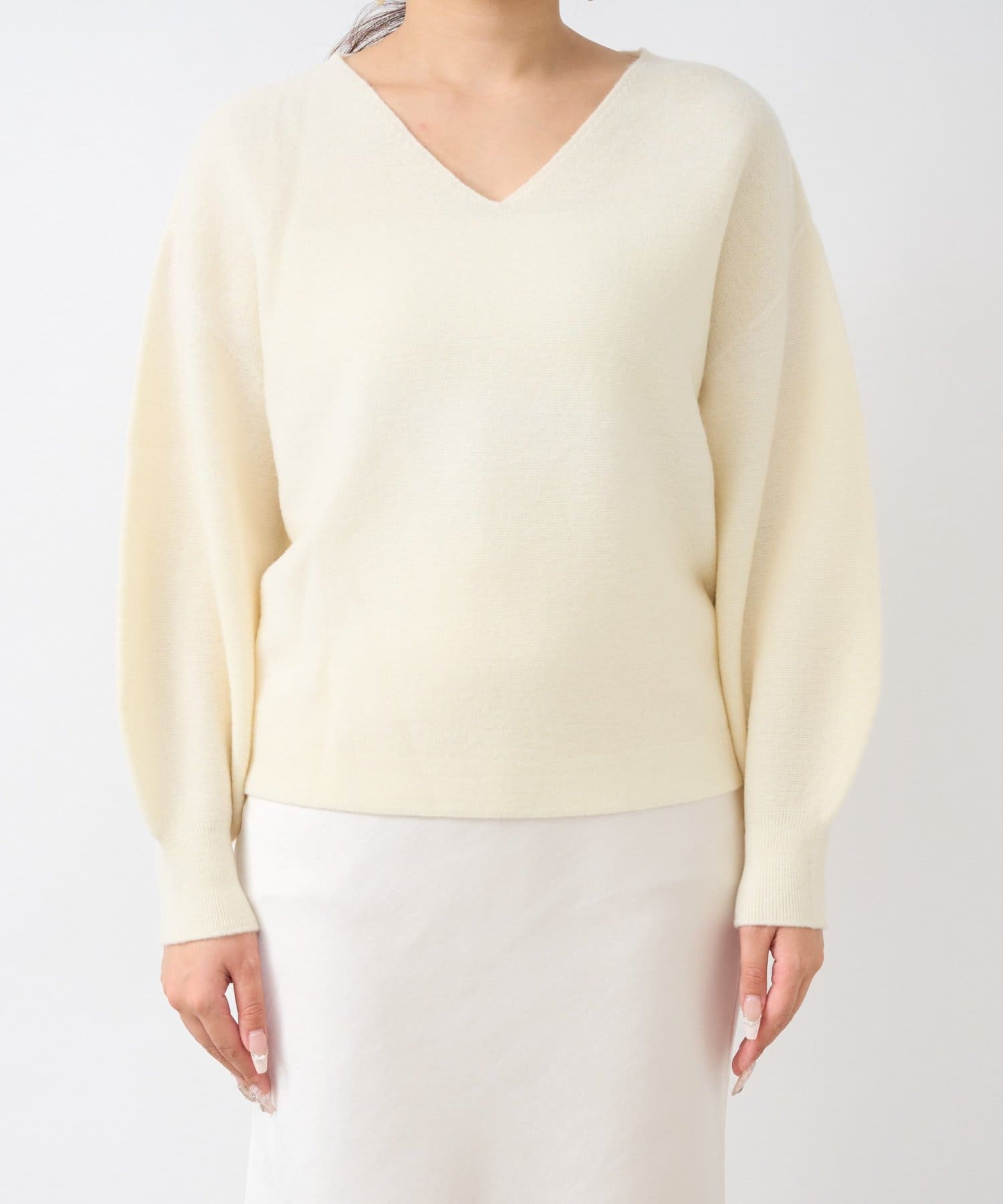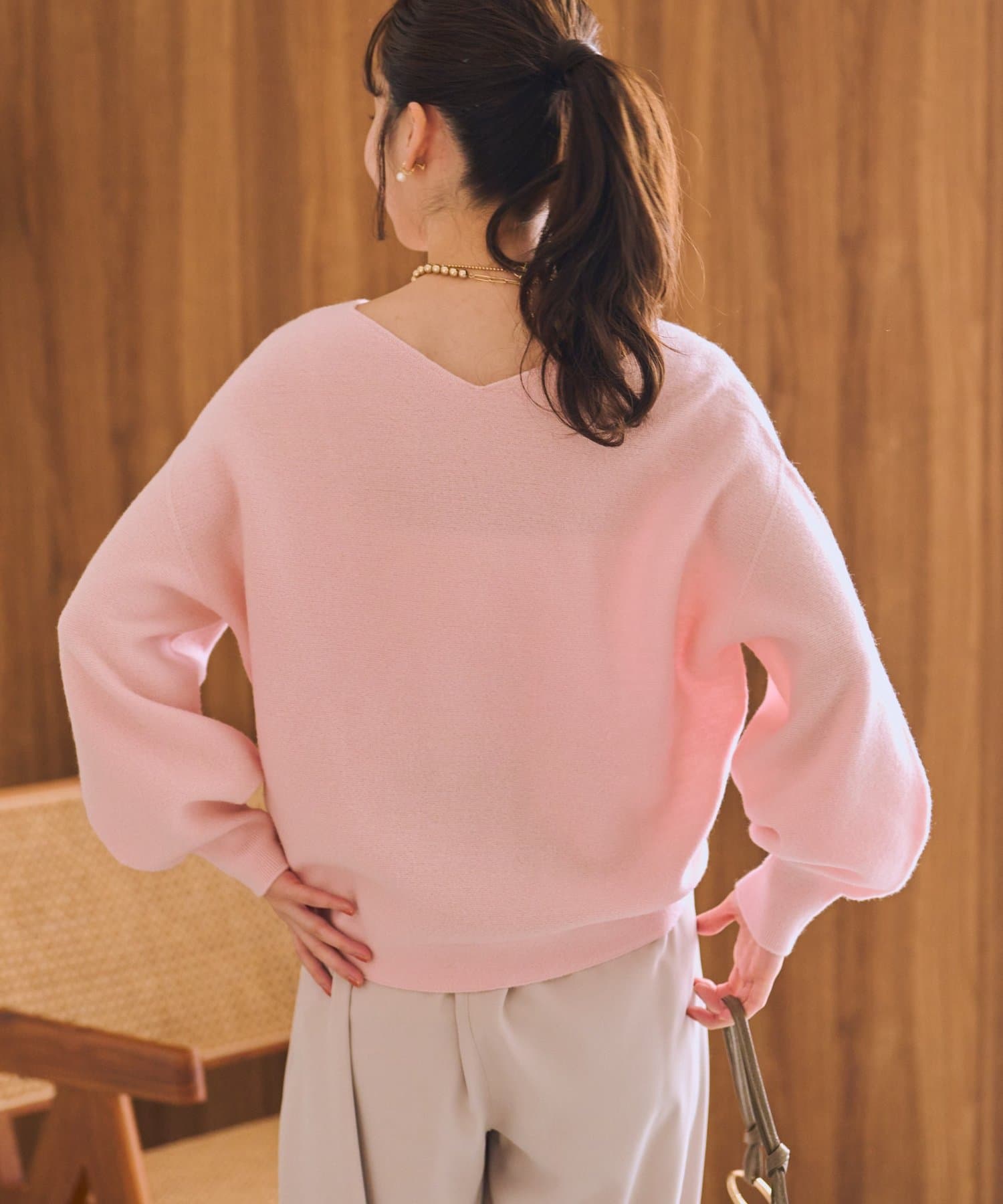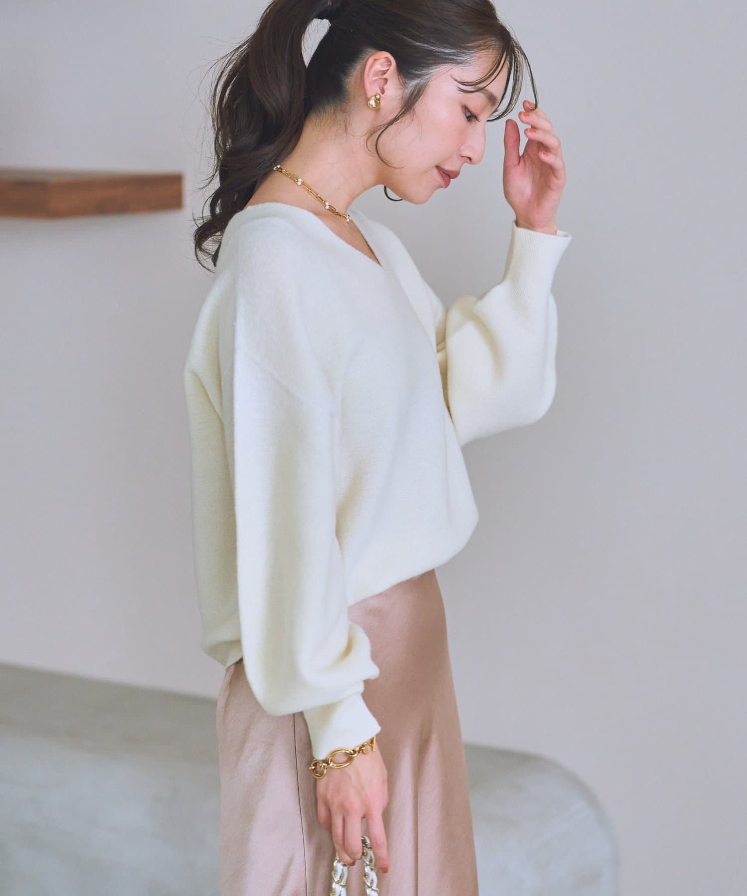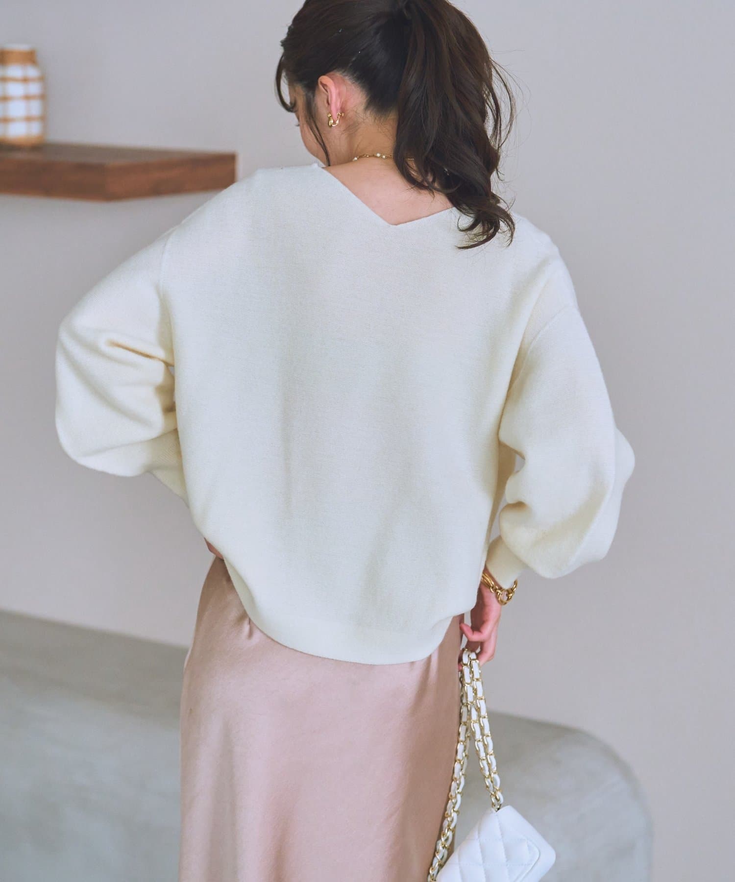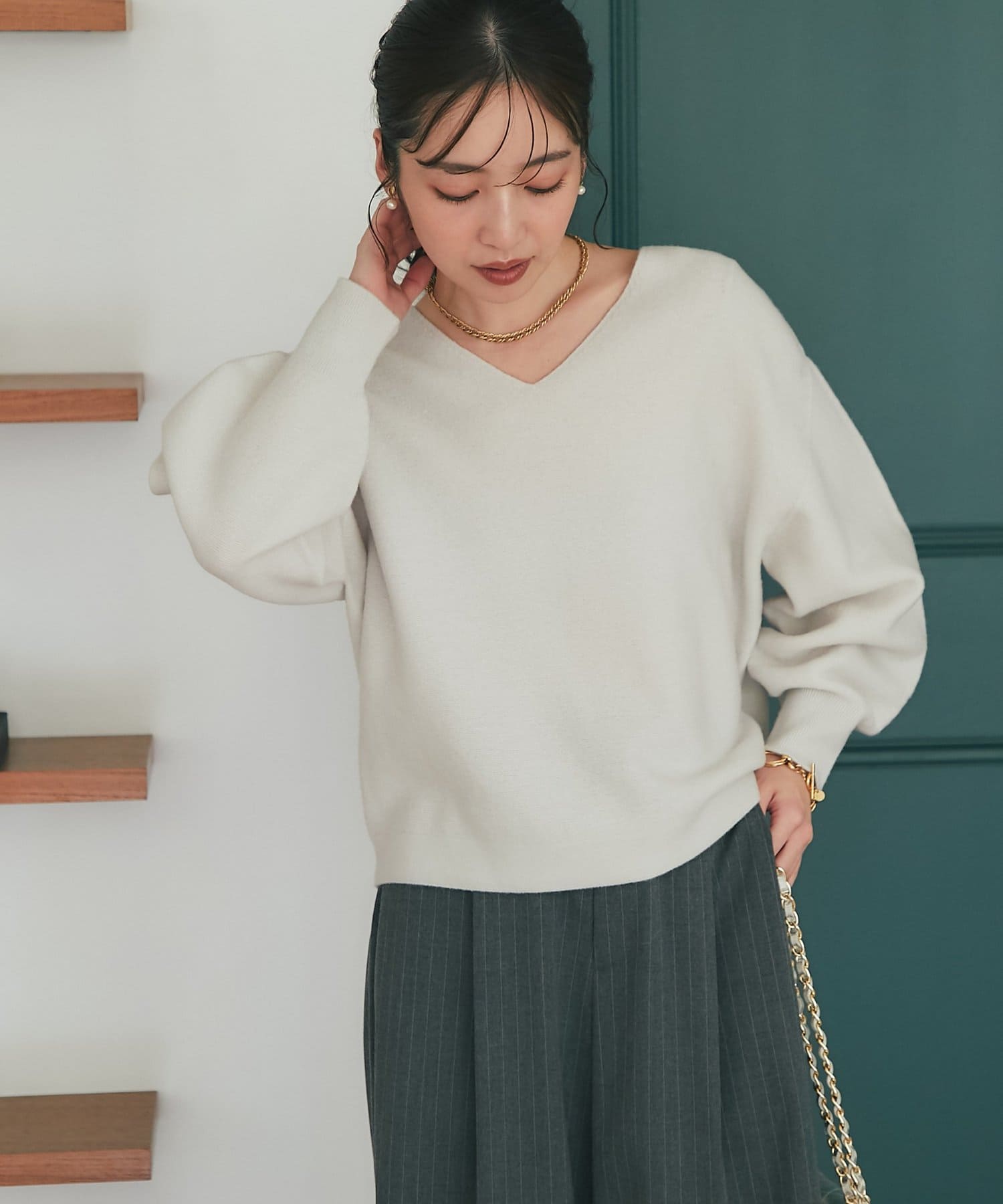深すぎないVネックが首元をすっきりと見せ、ボリュームスリーブが程よいアクセントに。