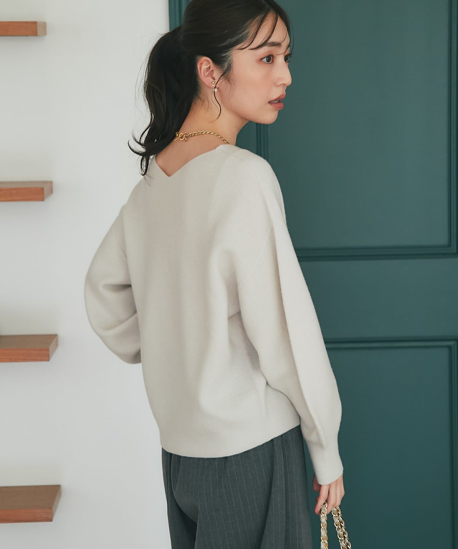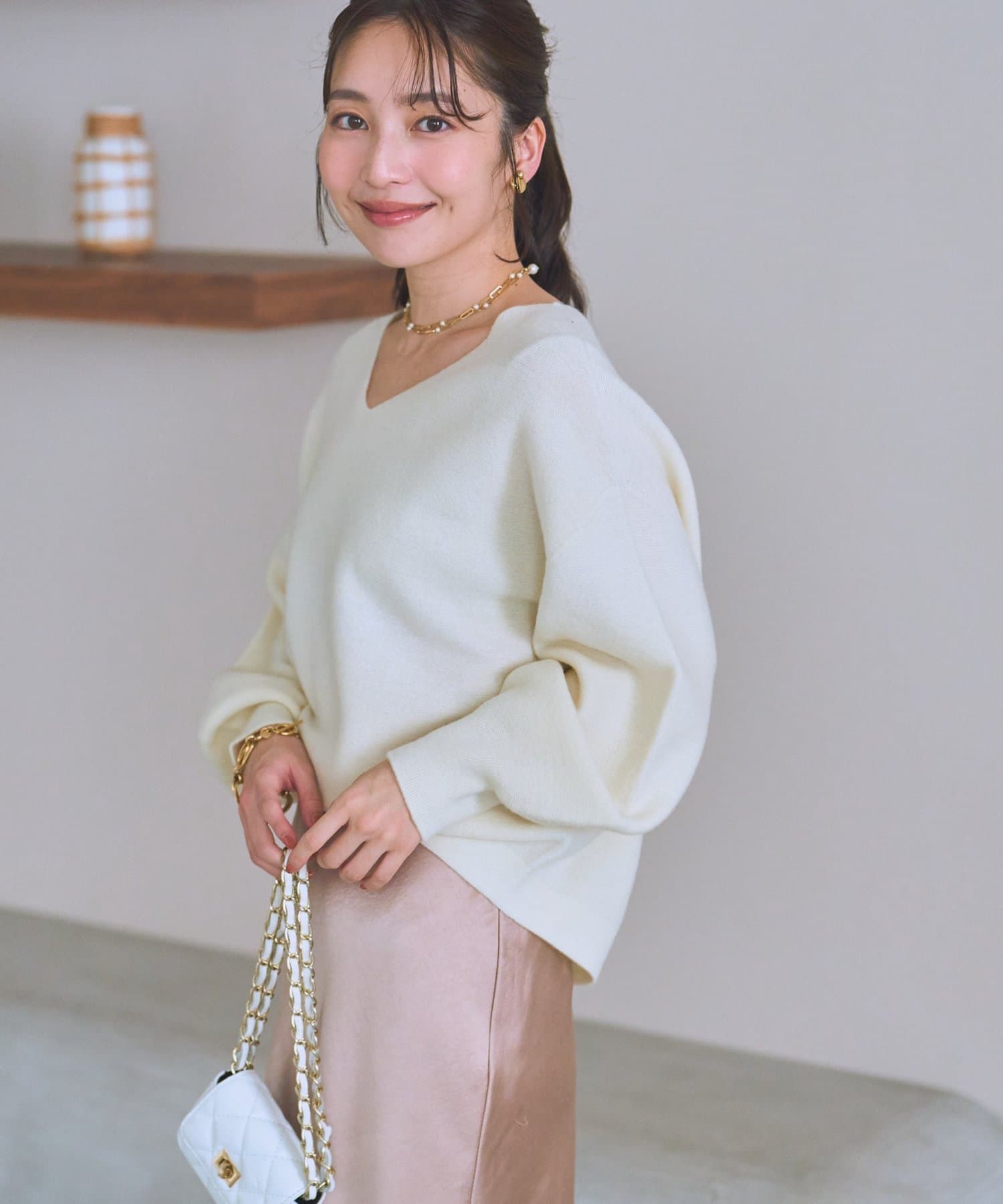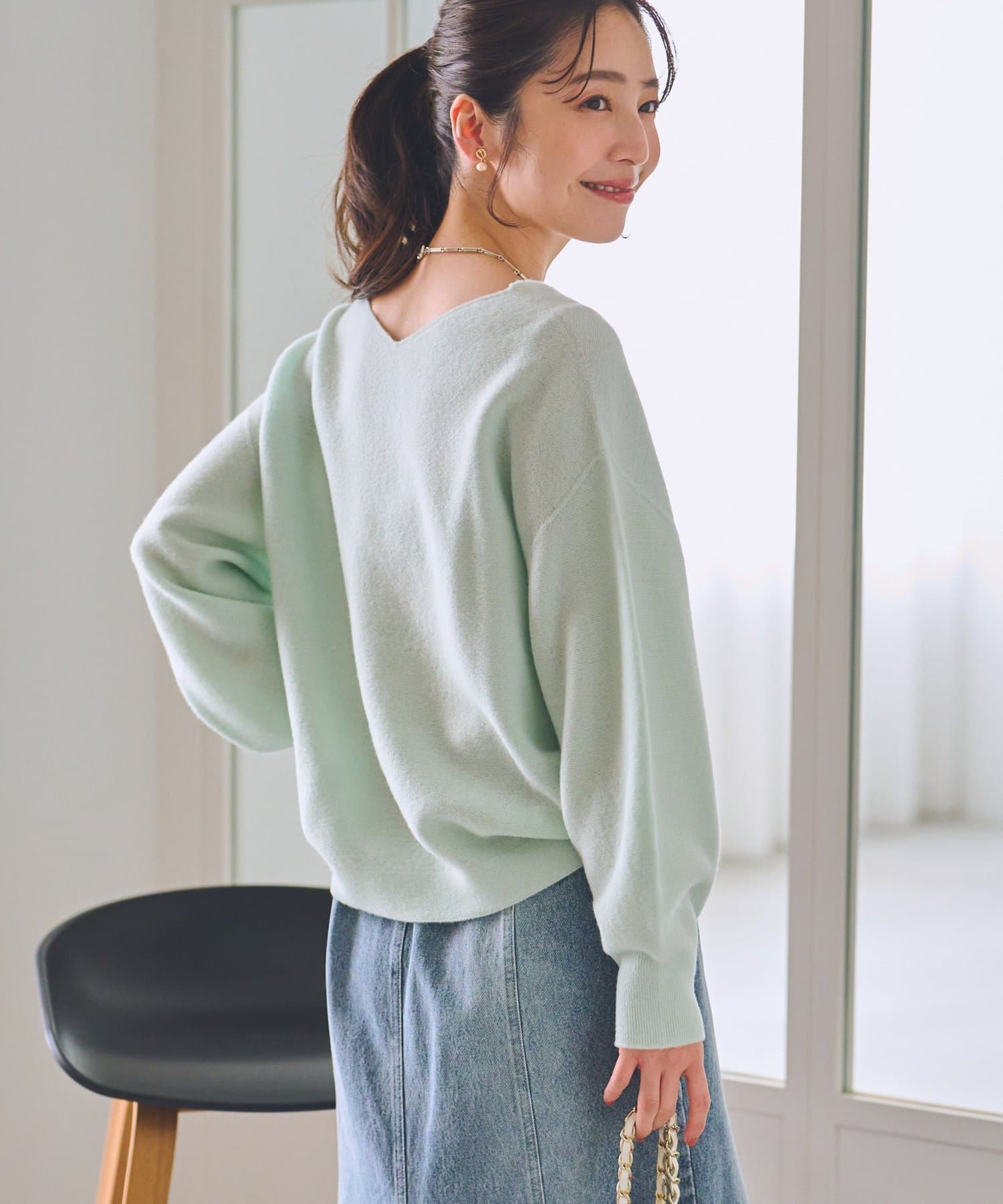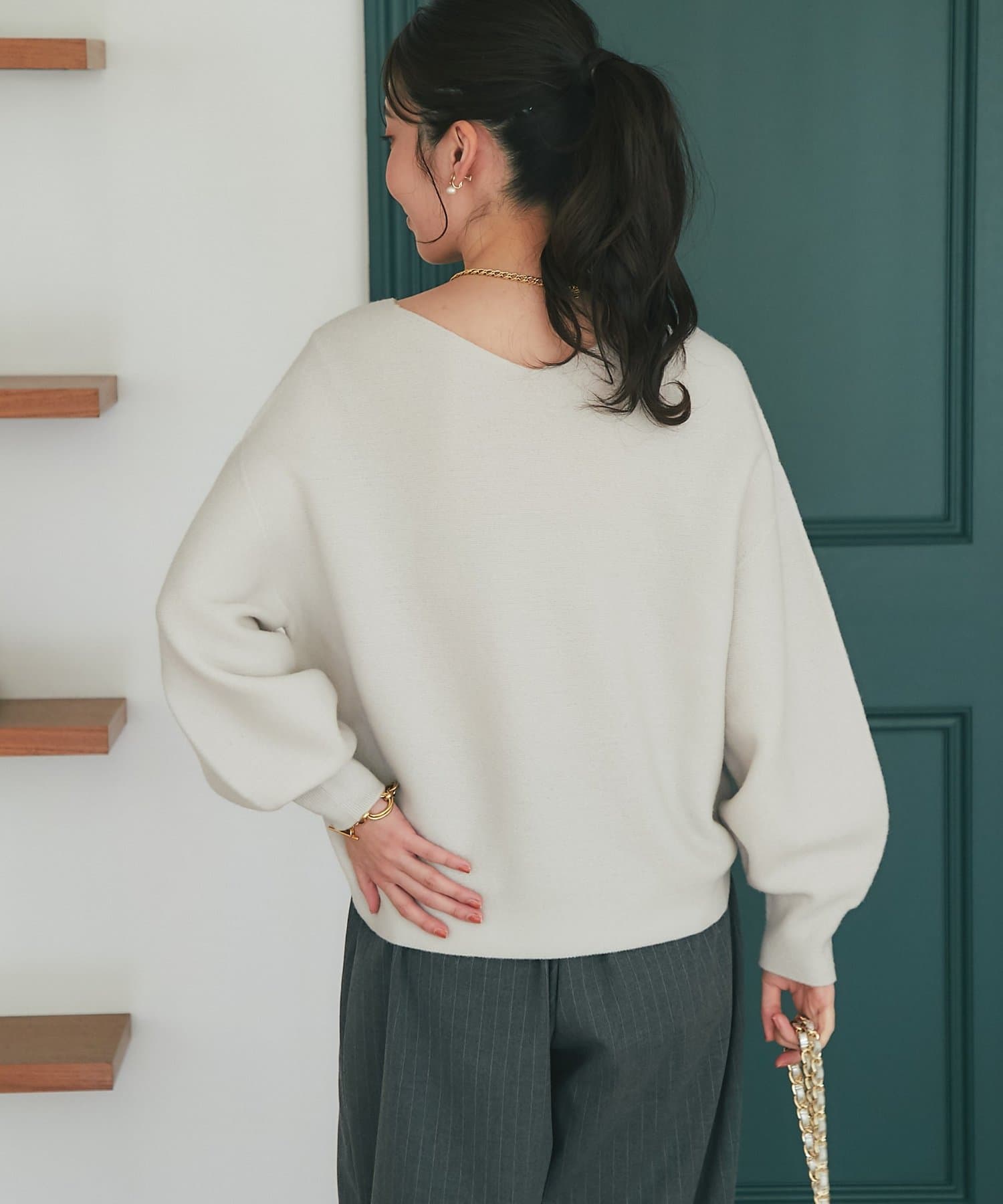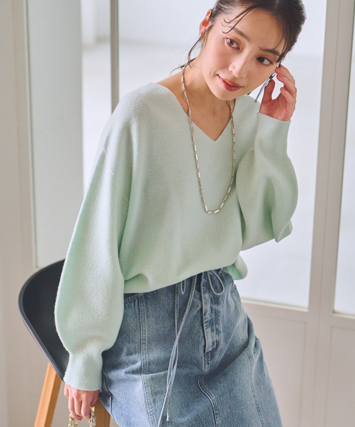深すぎないVネックが首元をすっきりと見せ、ボリュームスリーブが程よいアクセントに。
