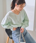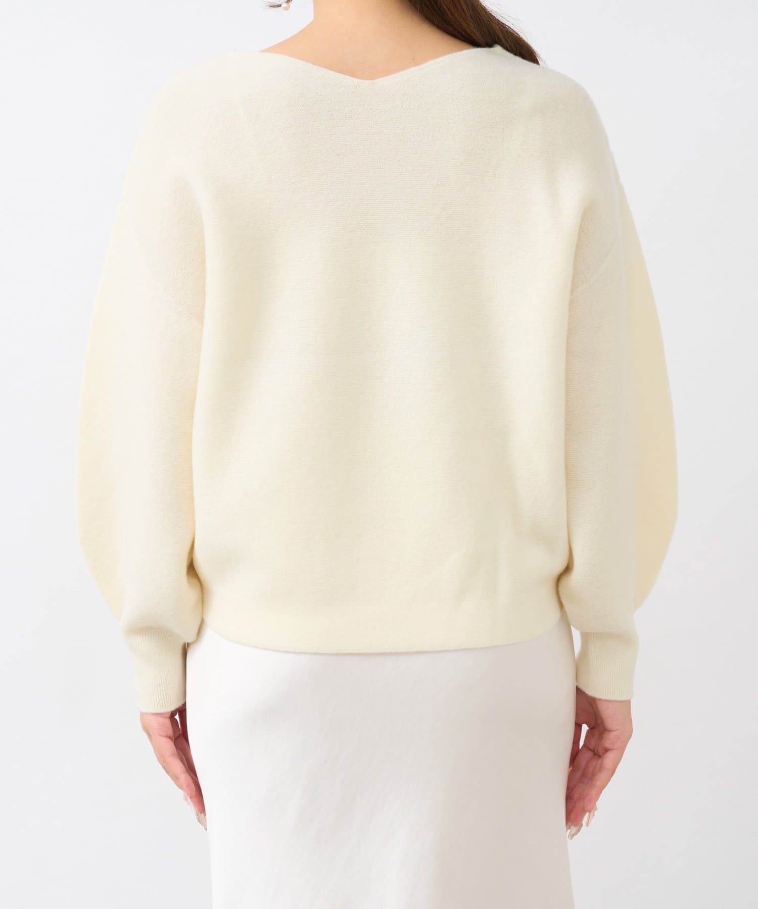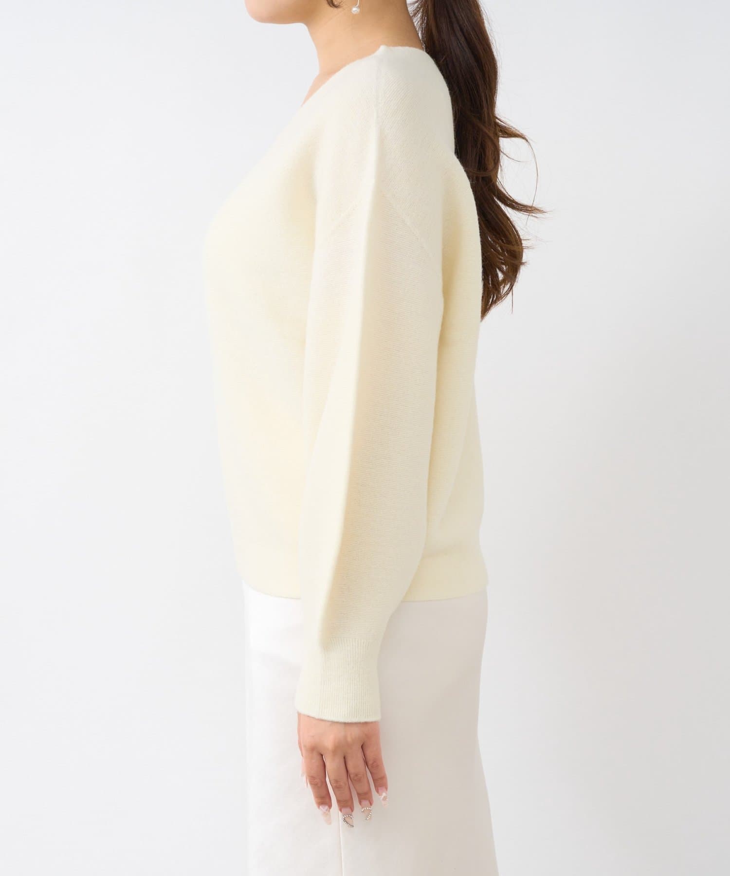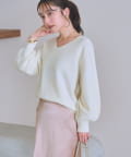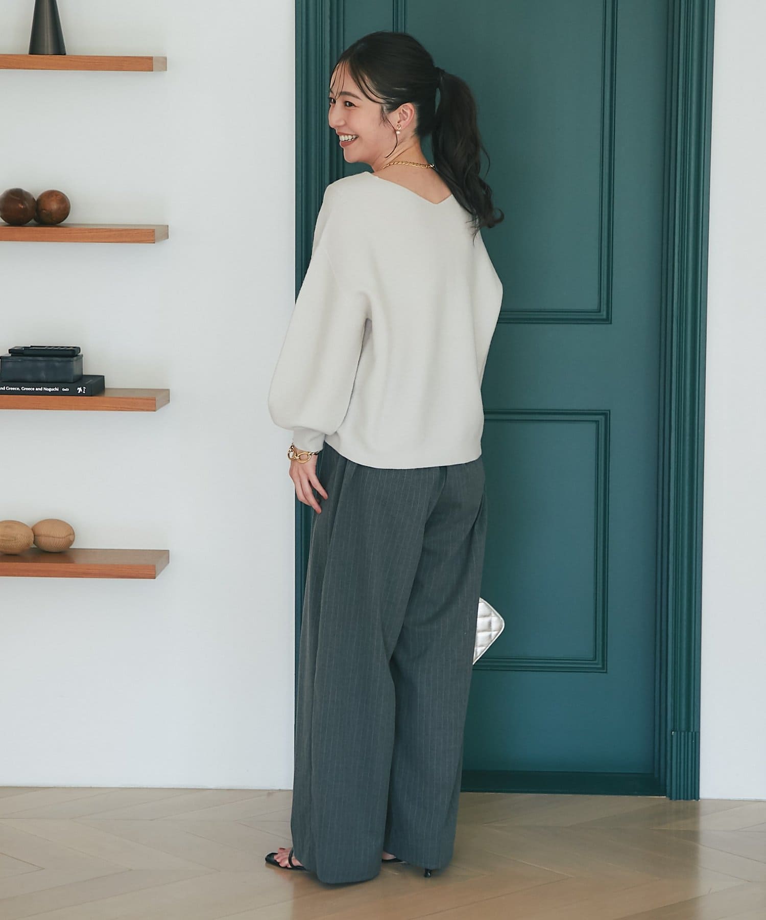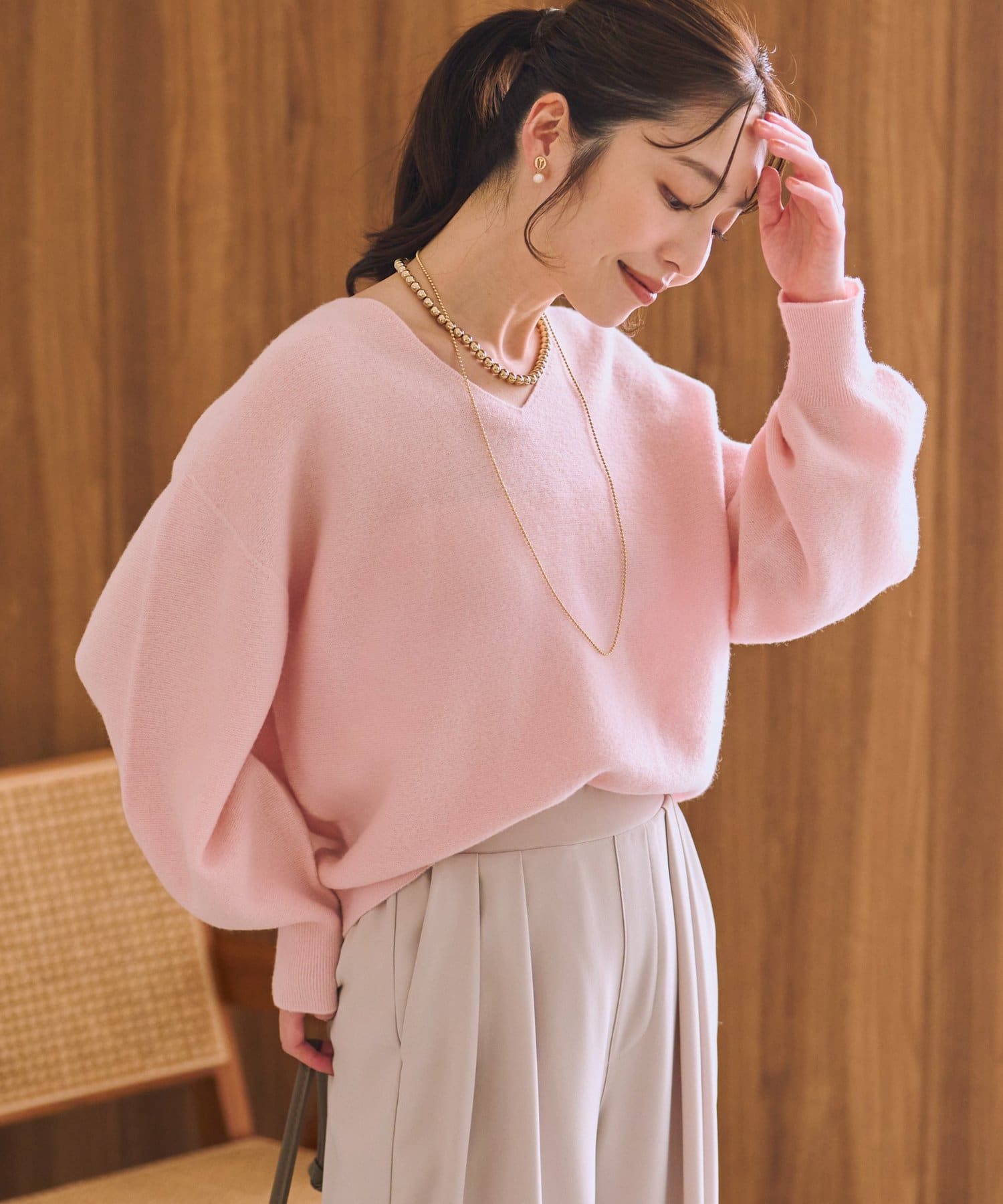 深すぎないVネックが首元をすっきりと見せ、ボリュームスリーブが程よいアクセントに。