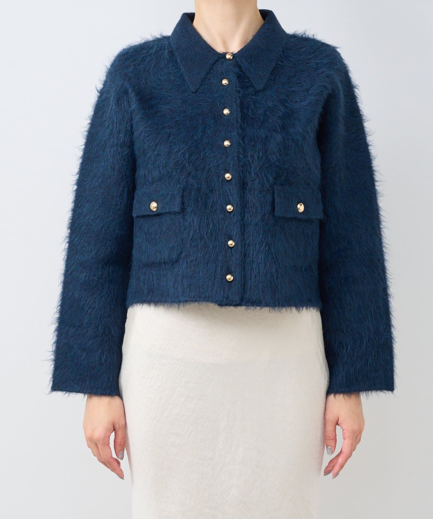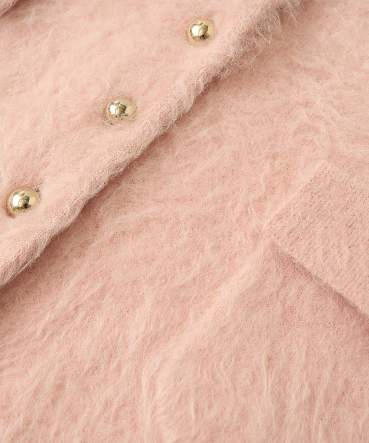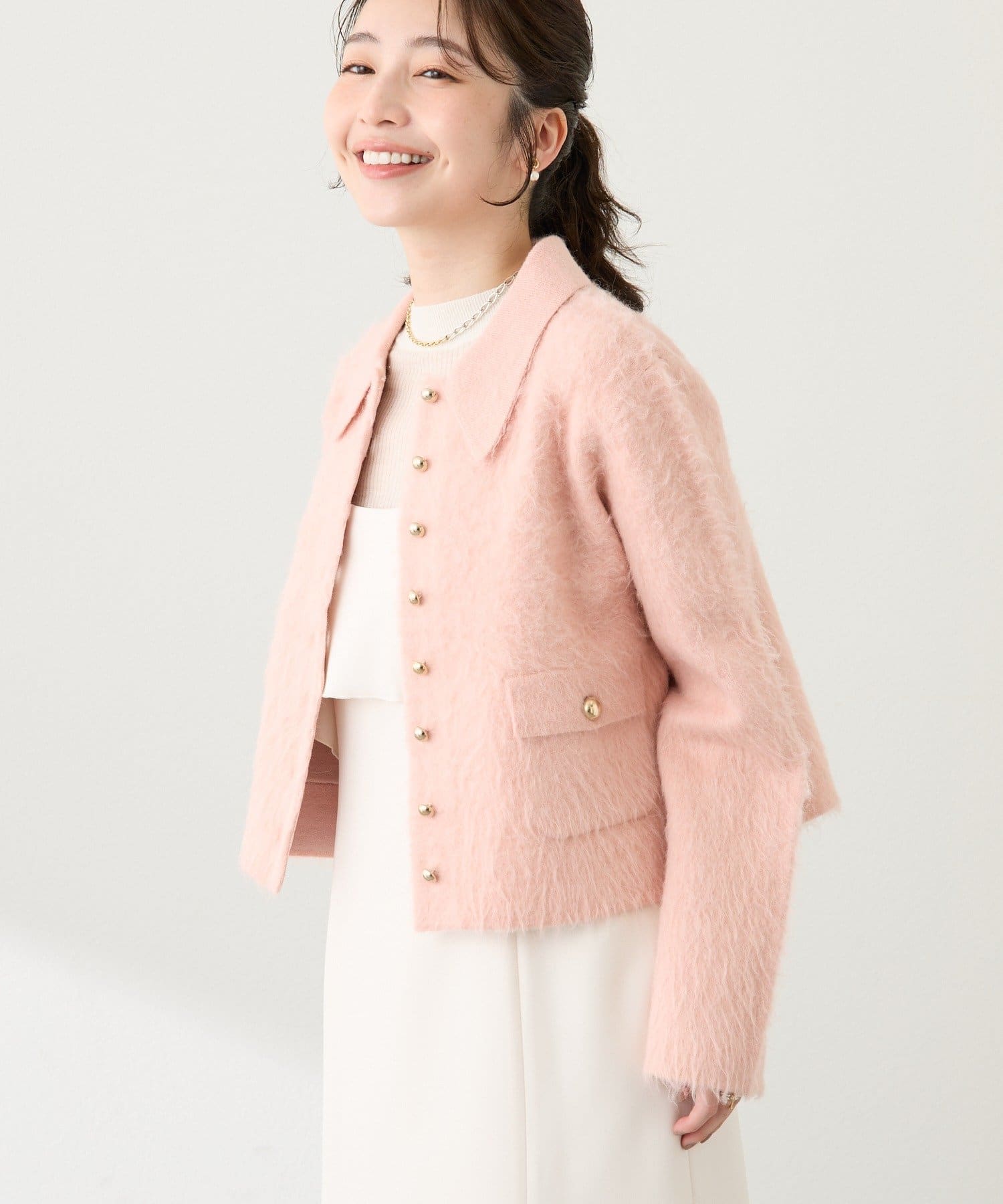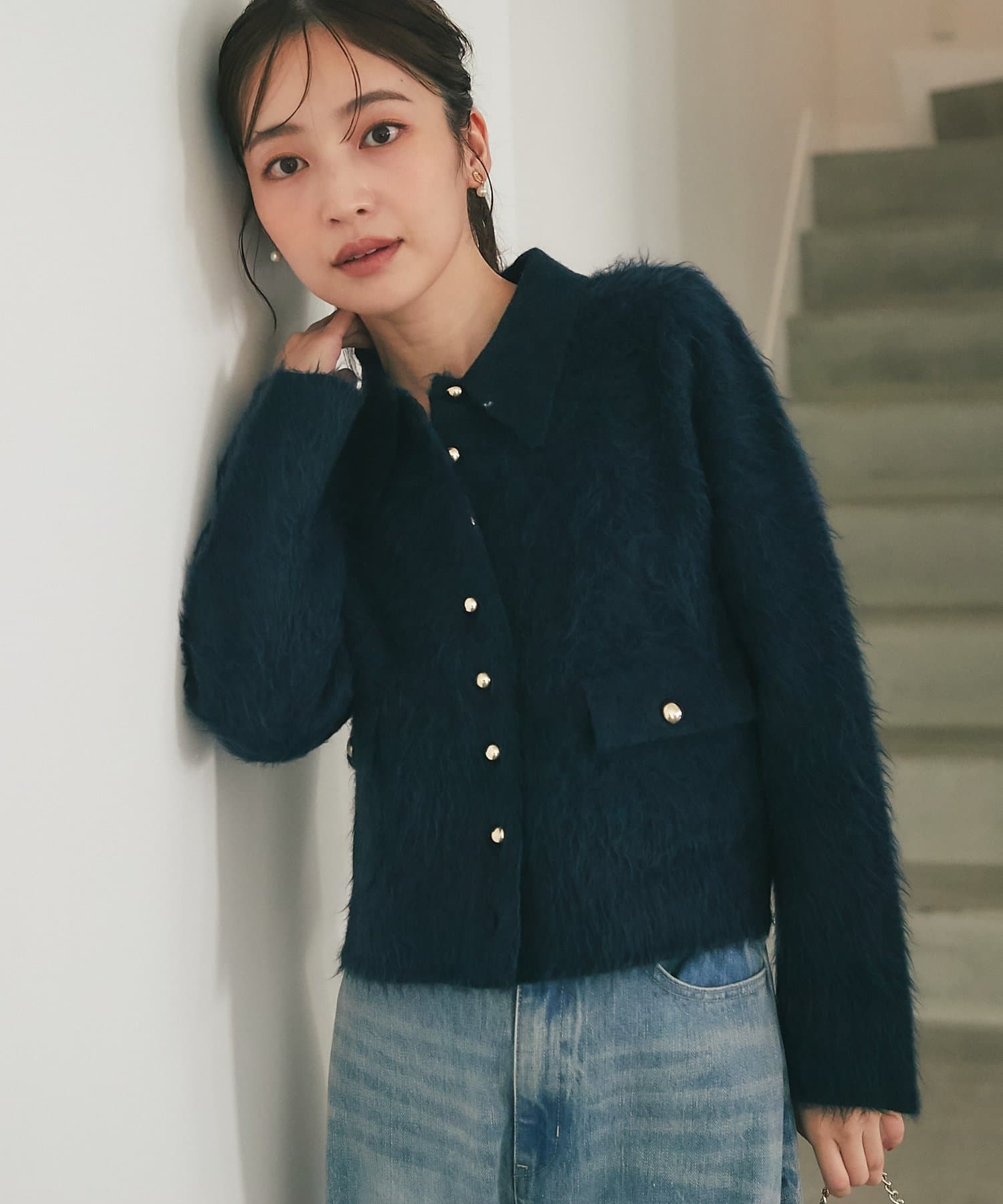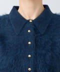 高級感のある素材とゴールド釦が上品な印象の、襟付きニットカーディガン。