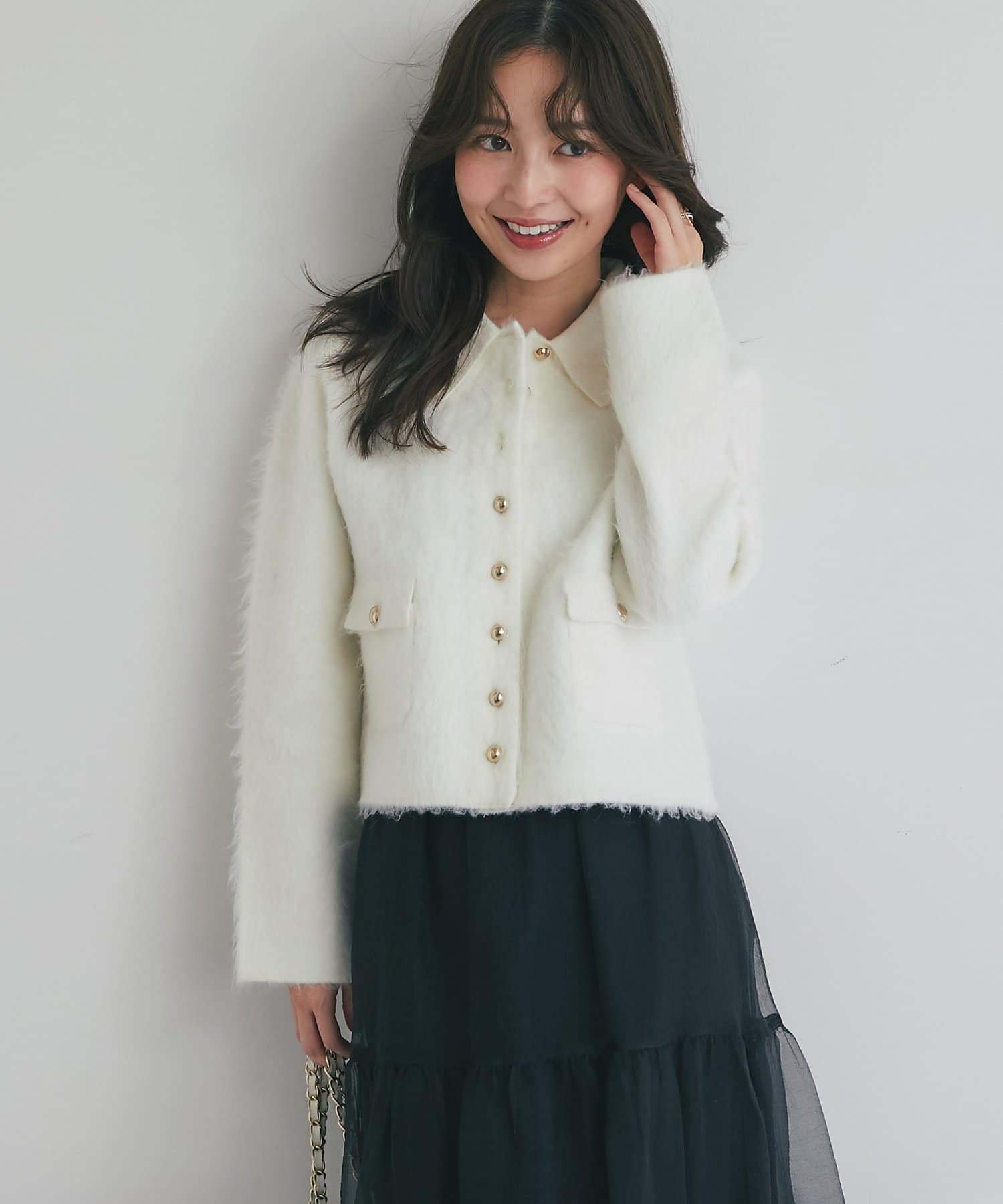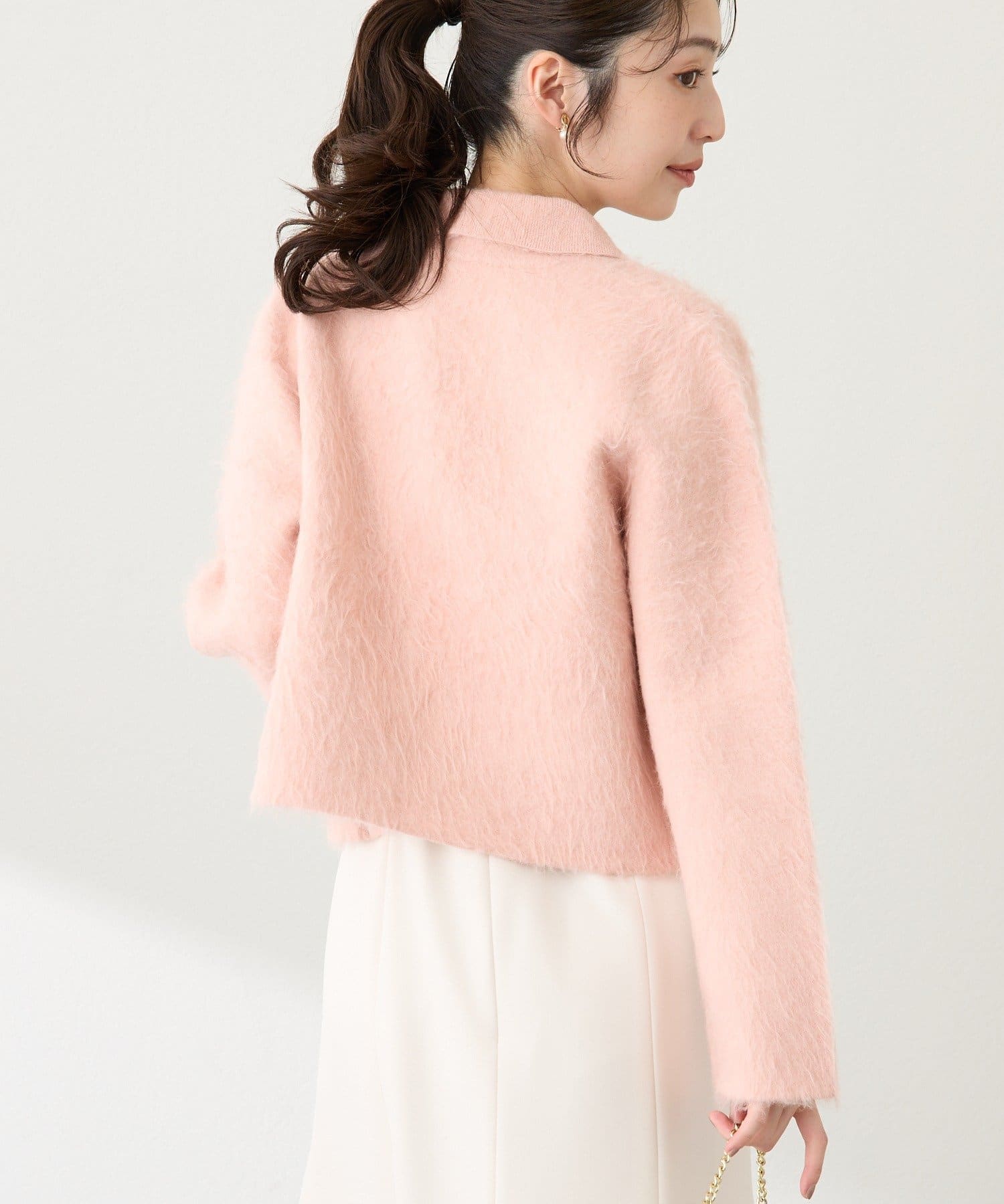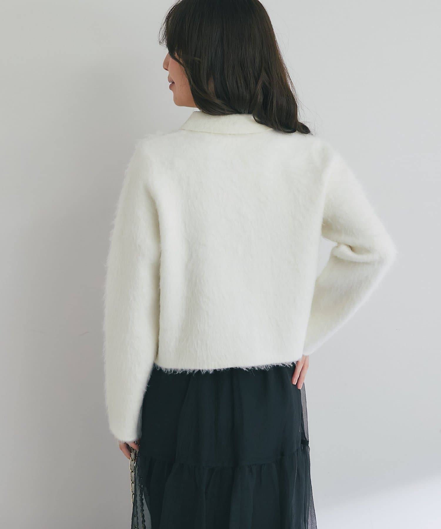 高級感のある素材とゴールド釦が上品な印象の、襟付きニットカーディガン。