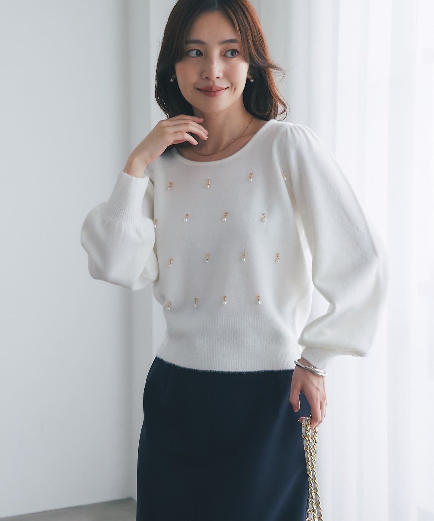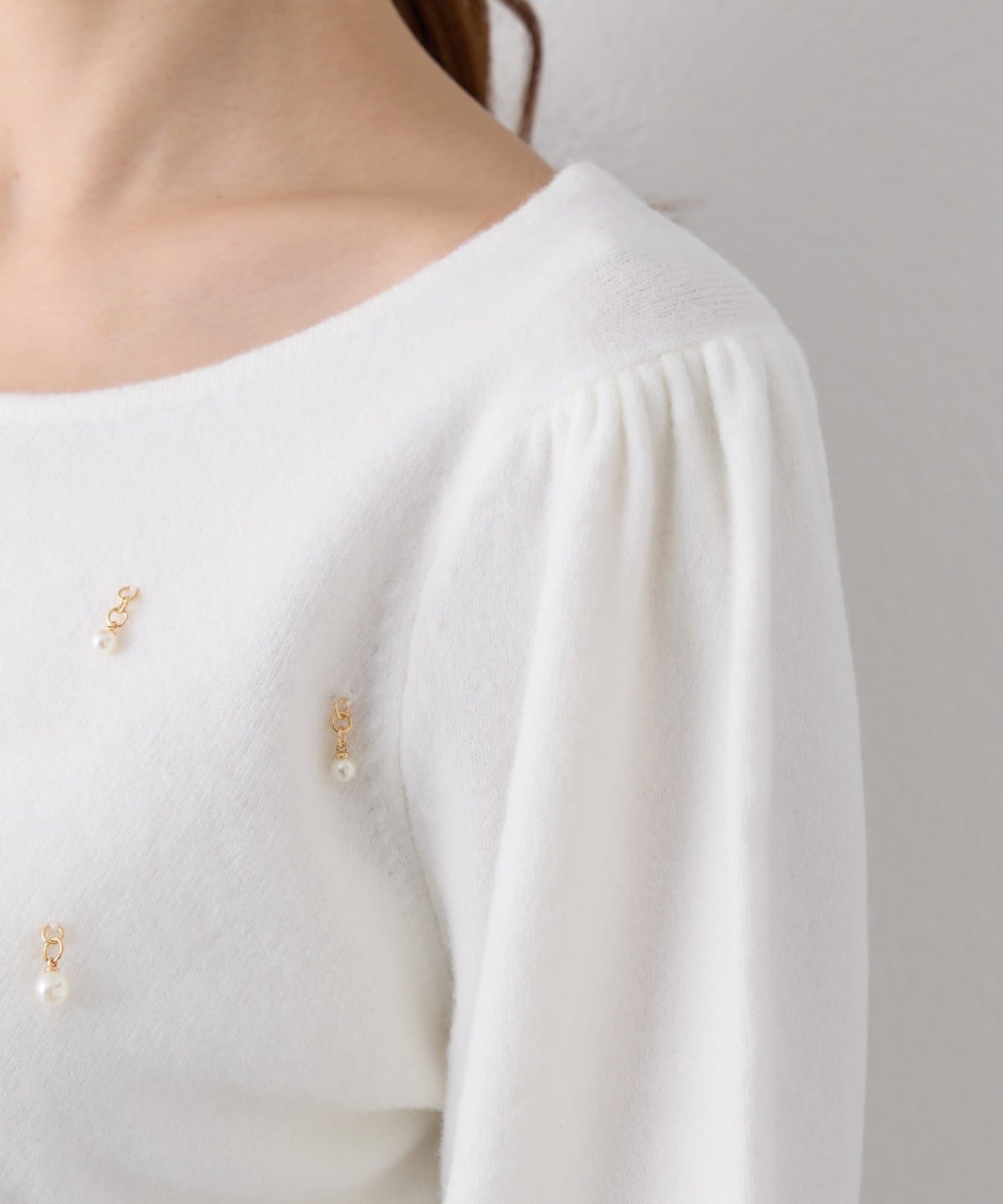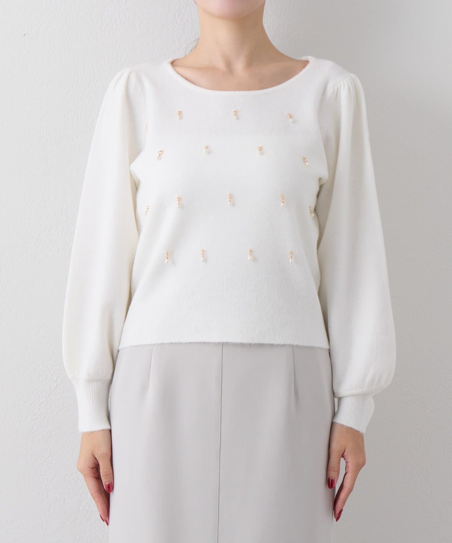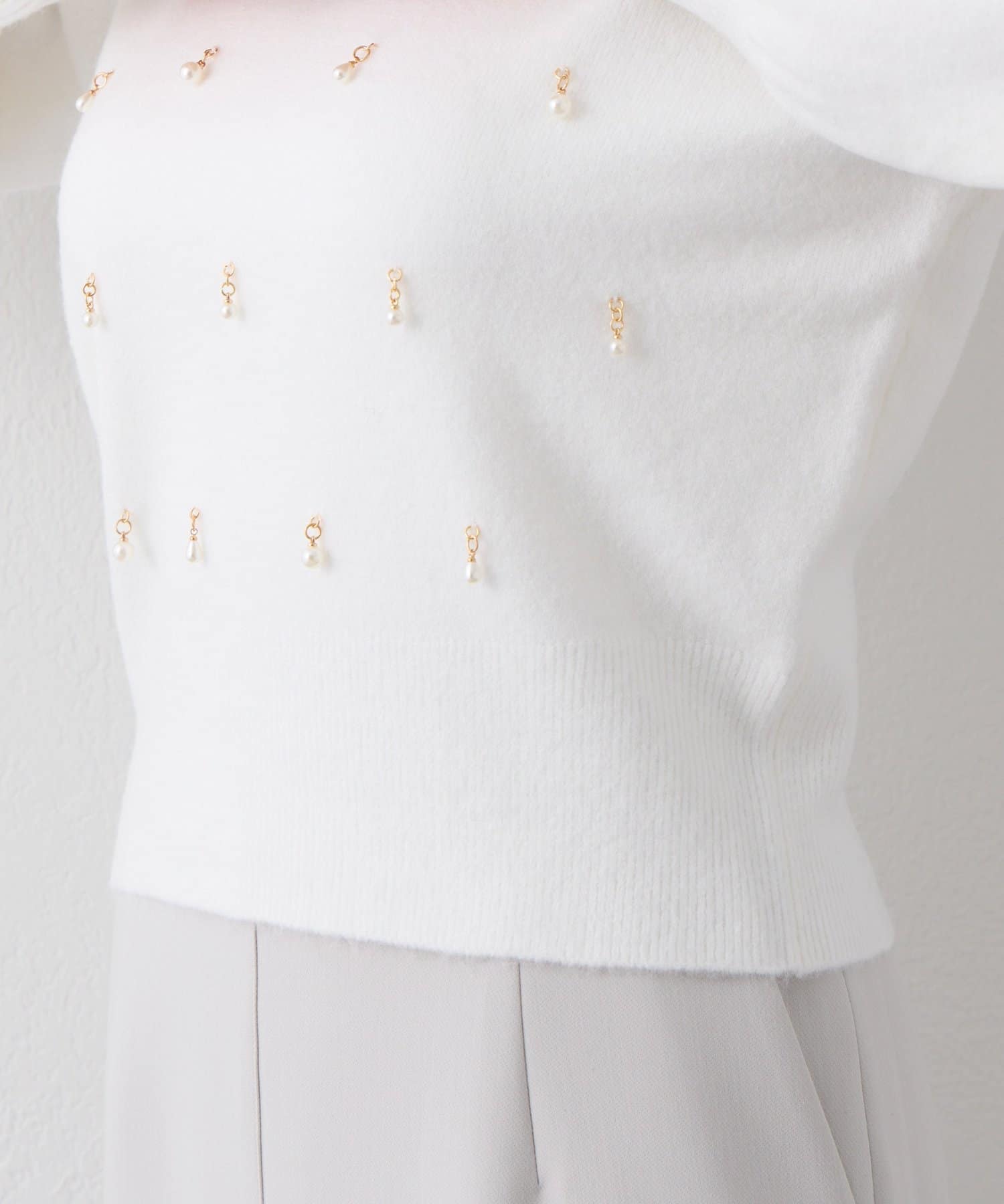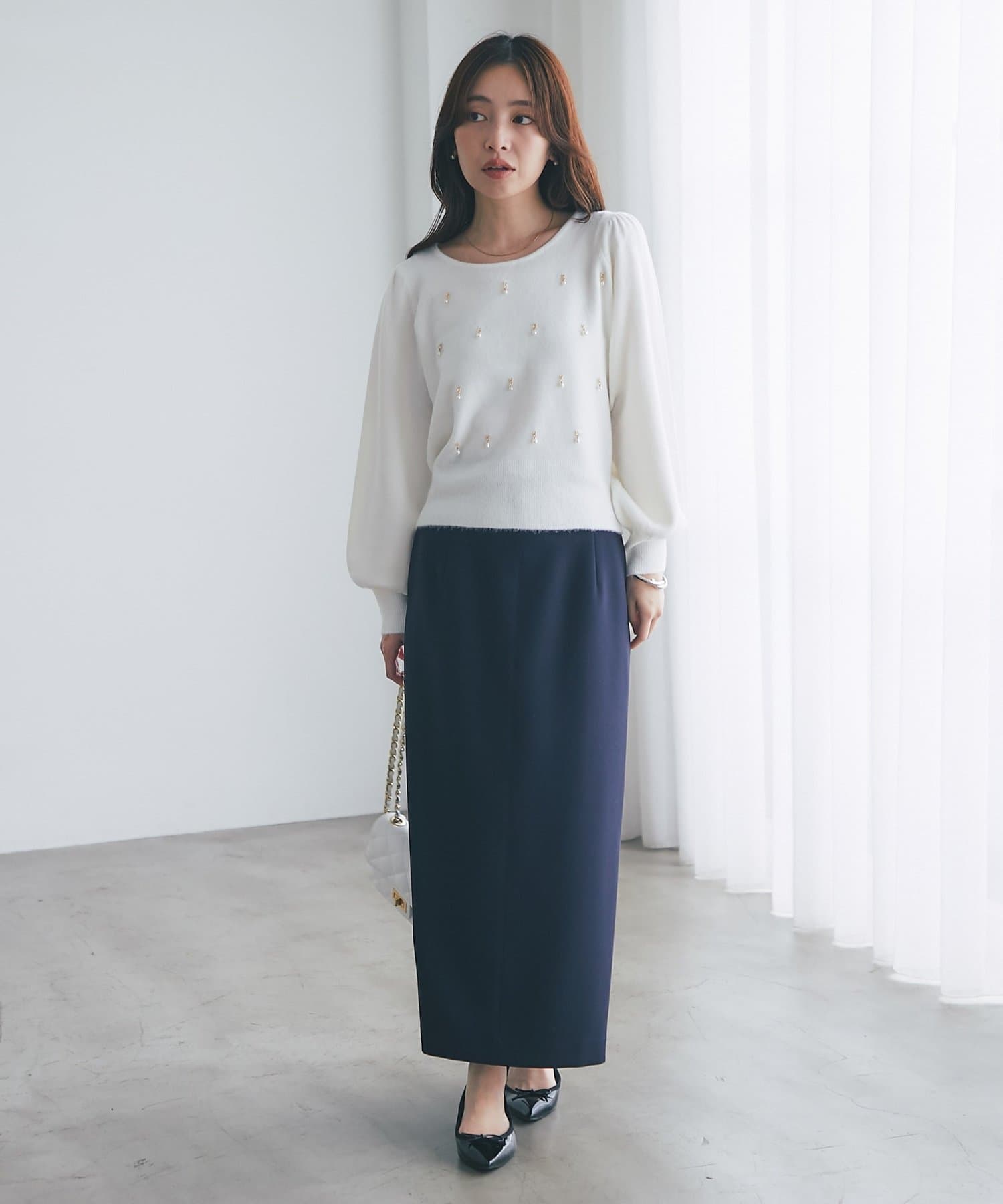 繊細な輝きを放つパールが上品で、華やかな印象を与えてくれるニット。