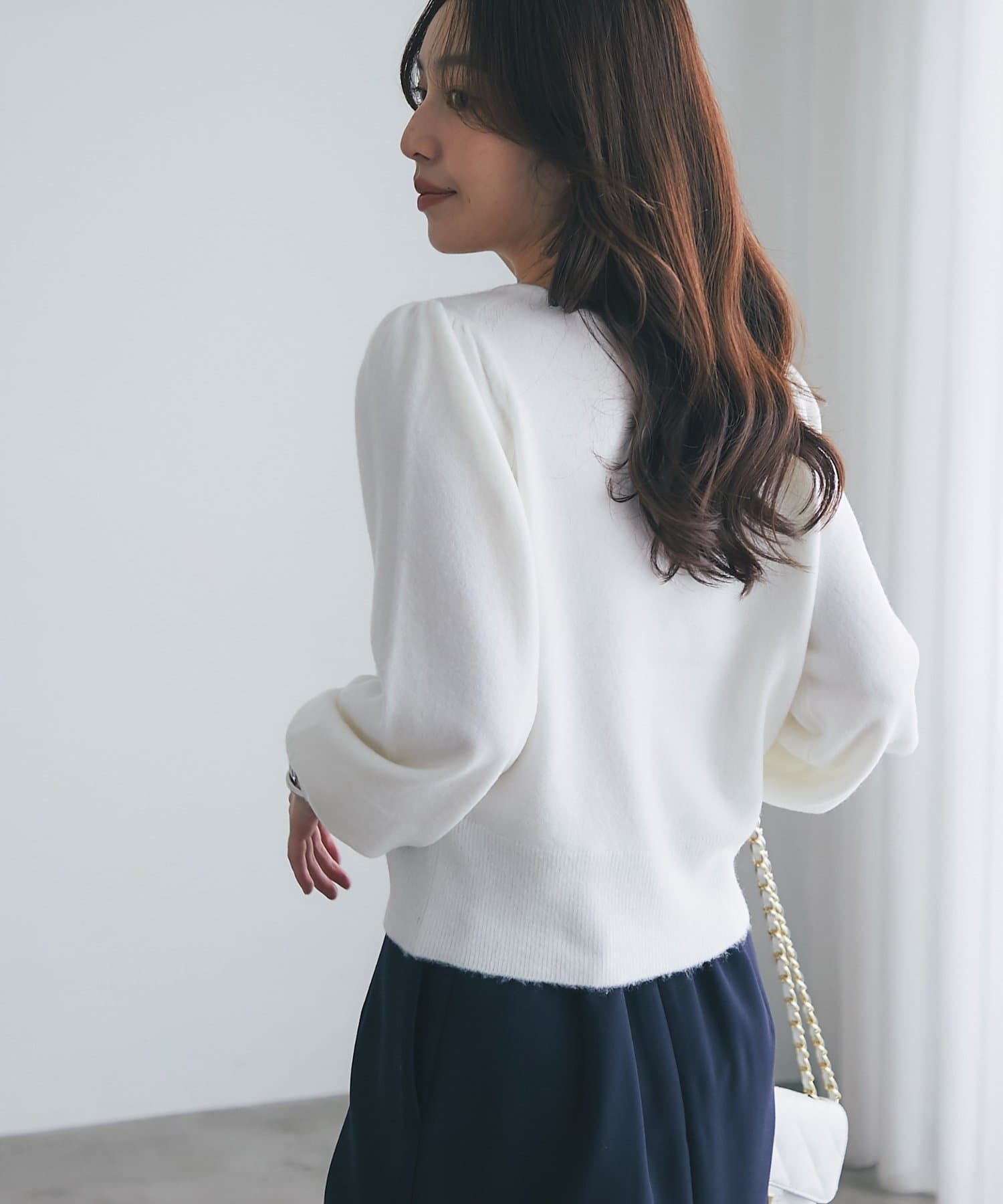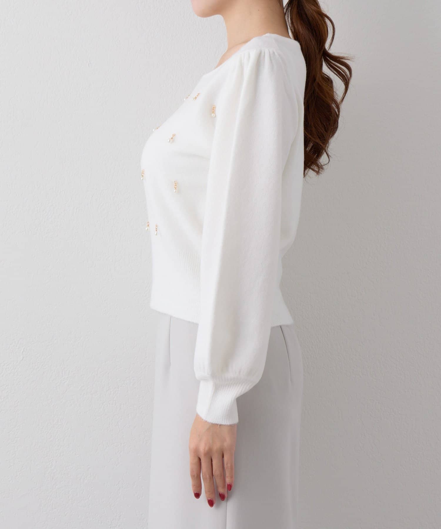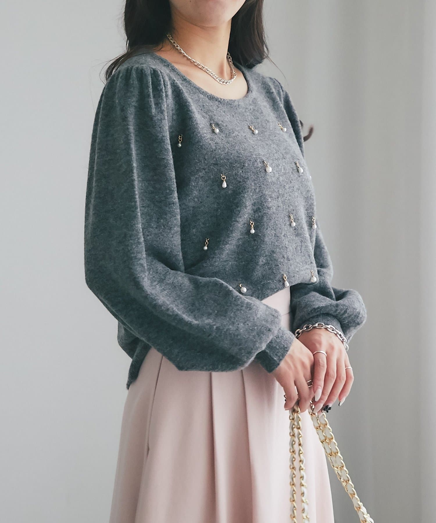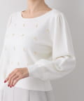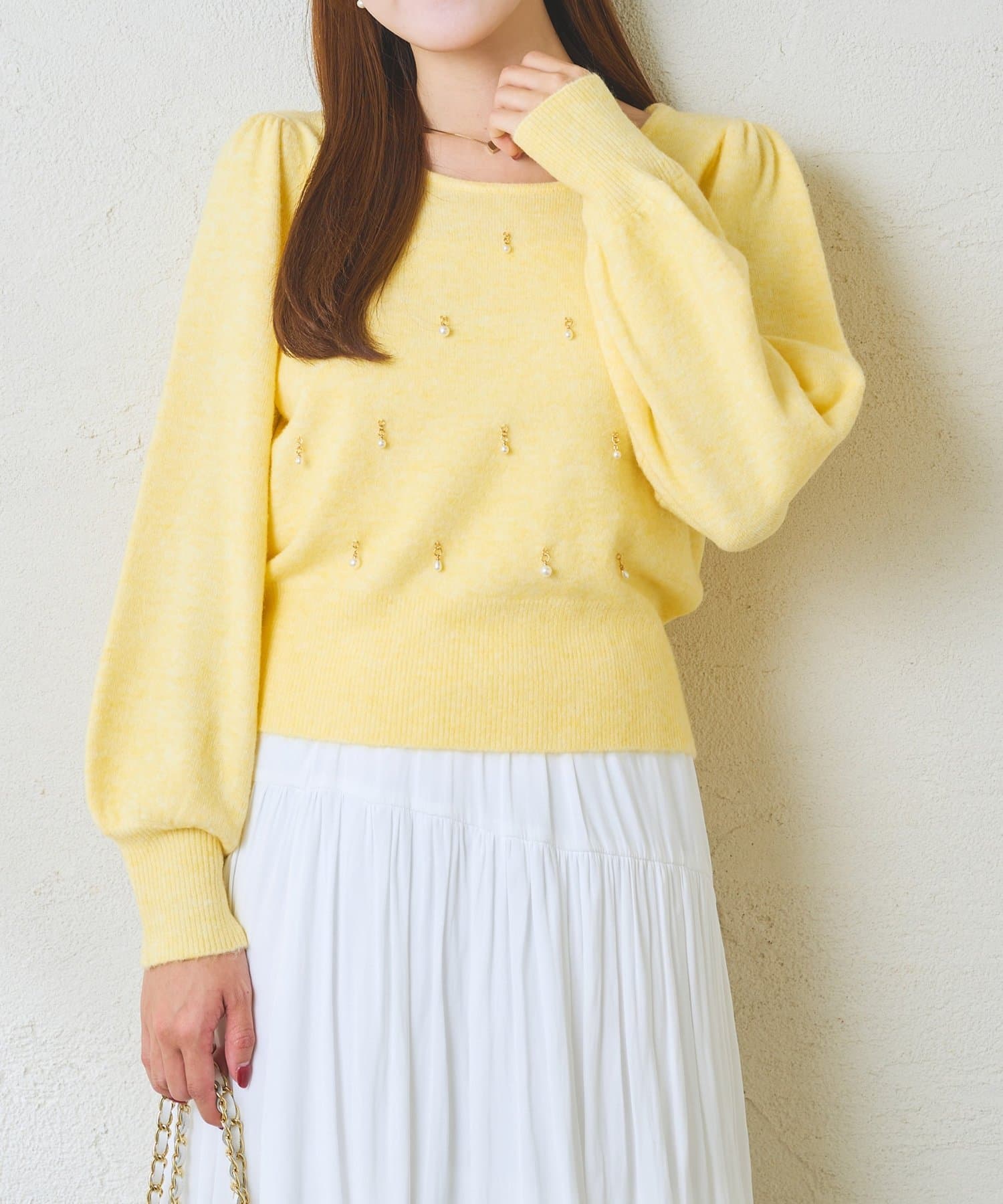 繊細な輝きを放つパールが上品で、華やかな印象を与えてくれるニット。