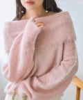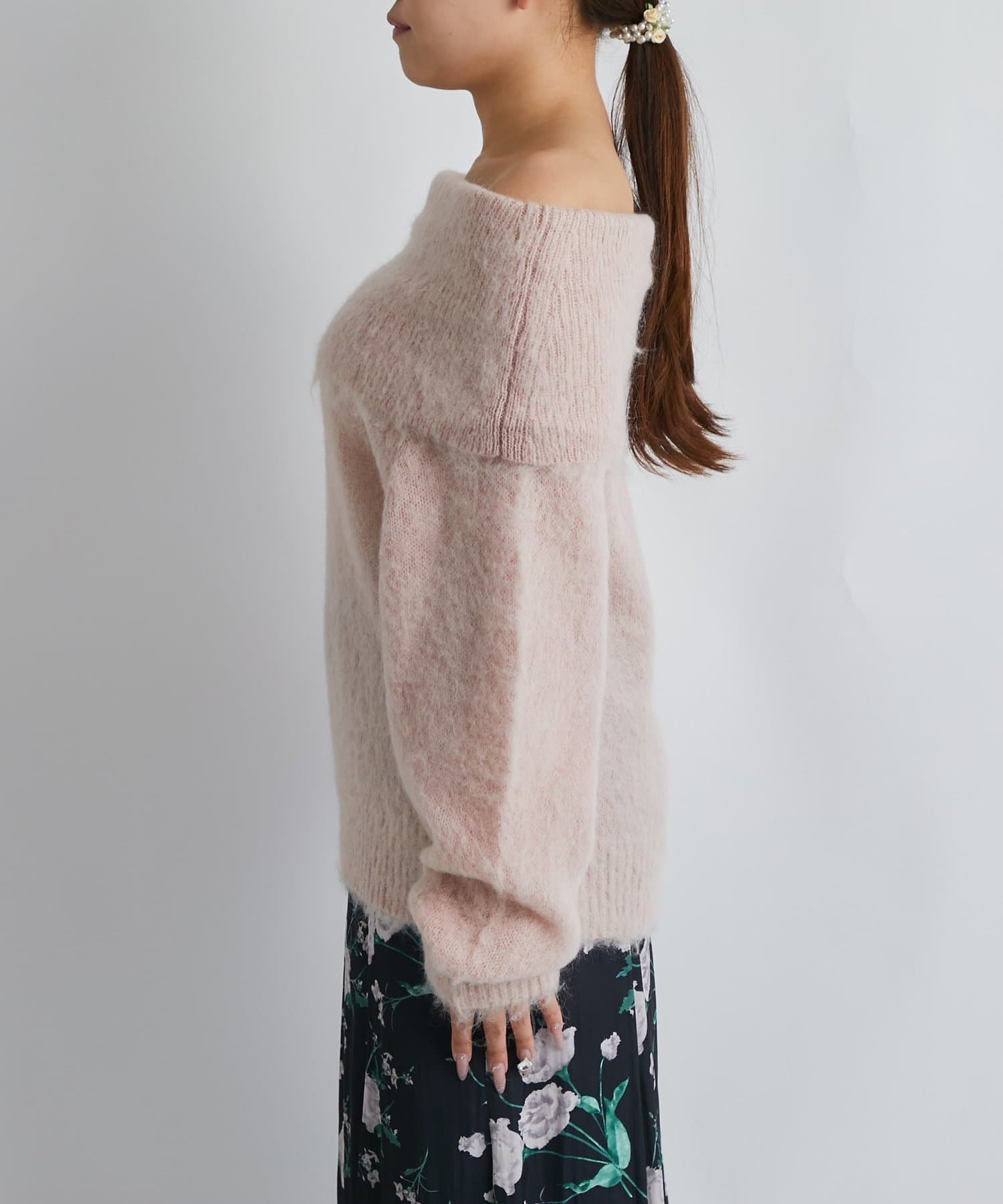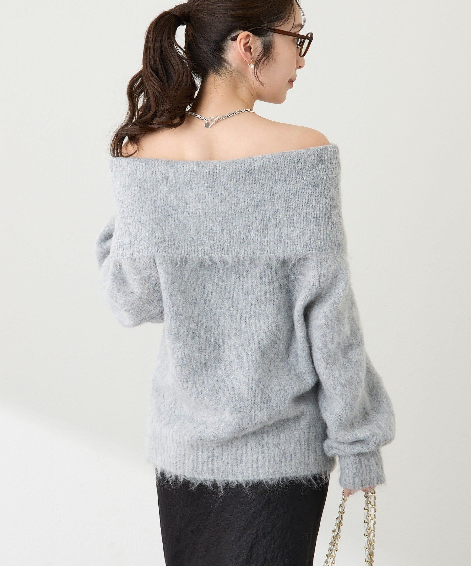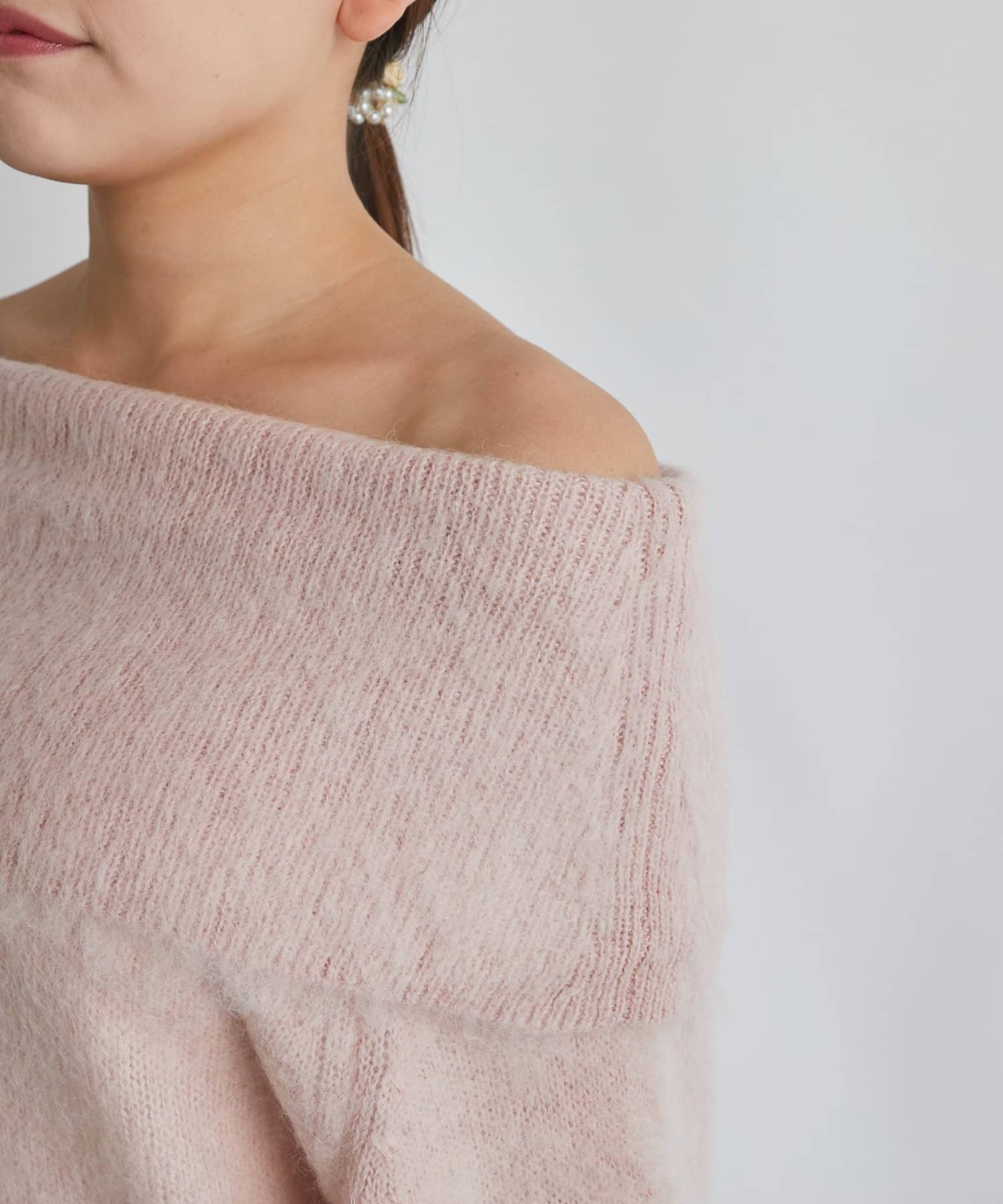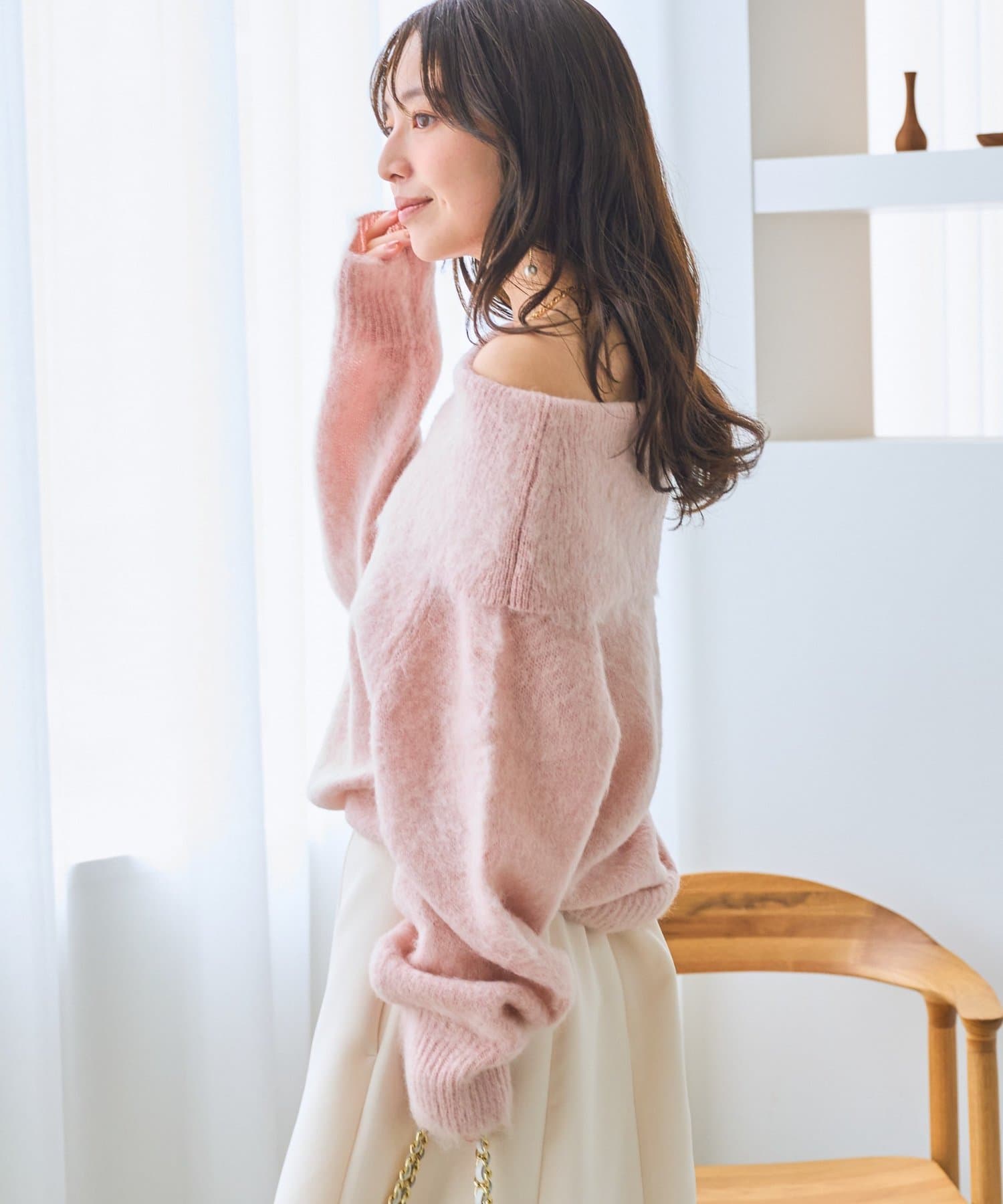 女性らしさが詰まった、毛足長めのふんわりオフショルニット。