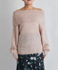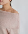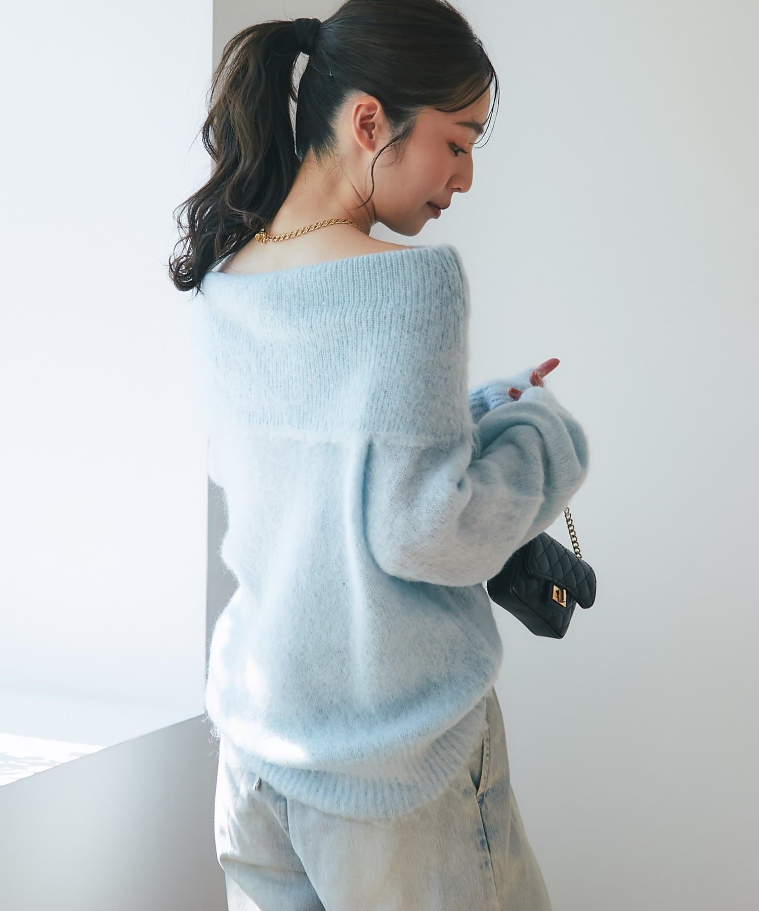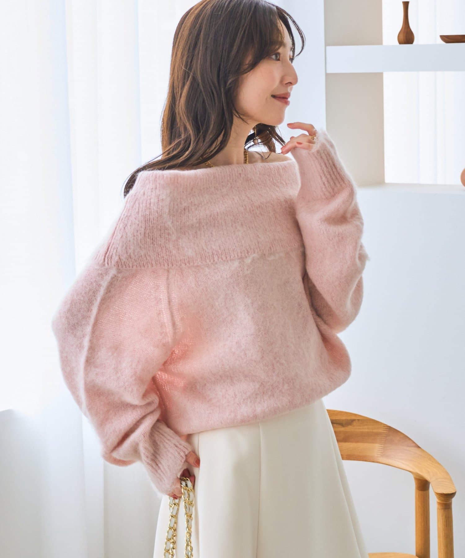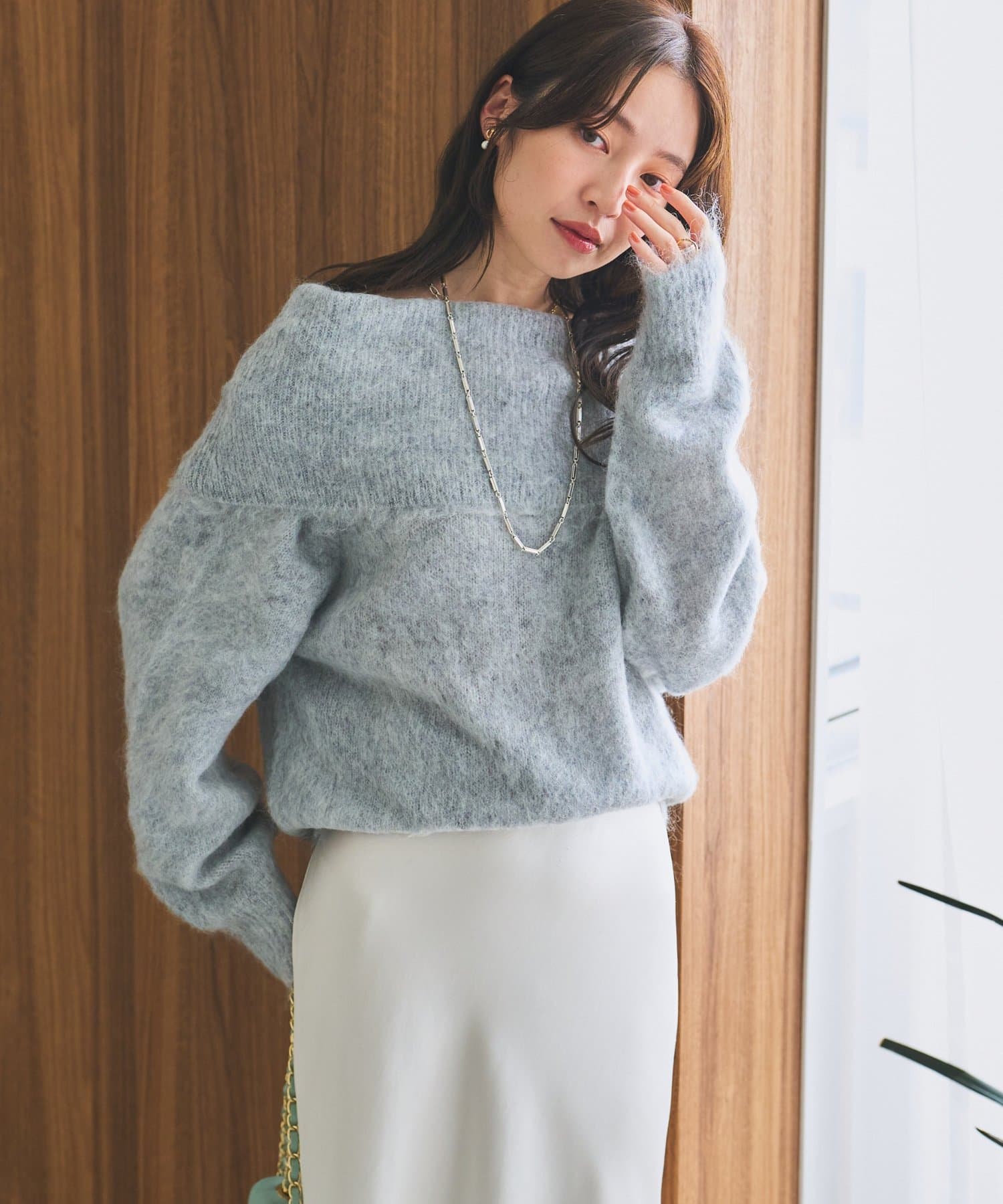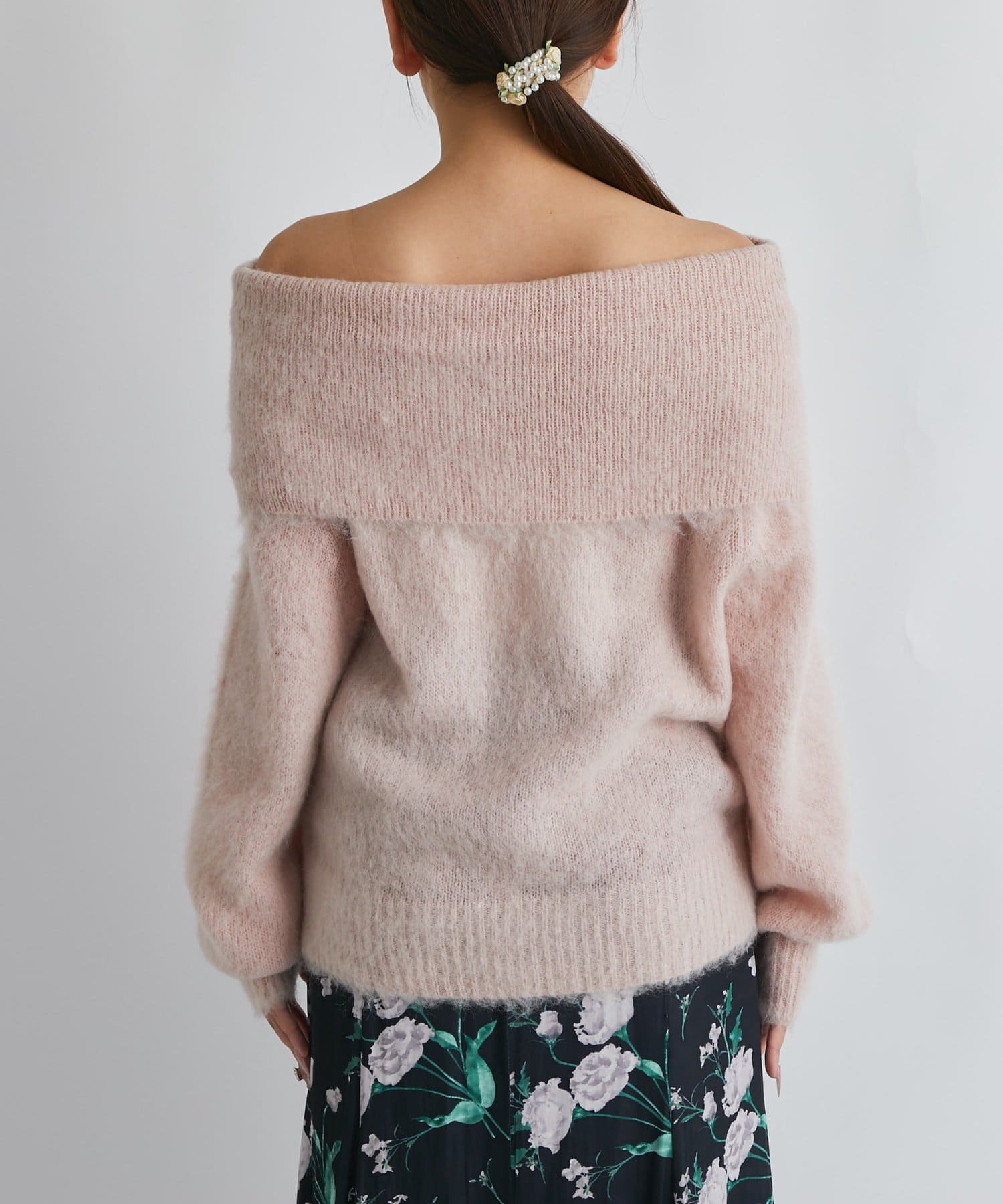 女性らしさが詰まった、毛足長めのふんわりオフショルニット。