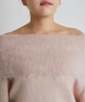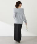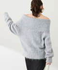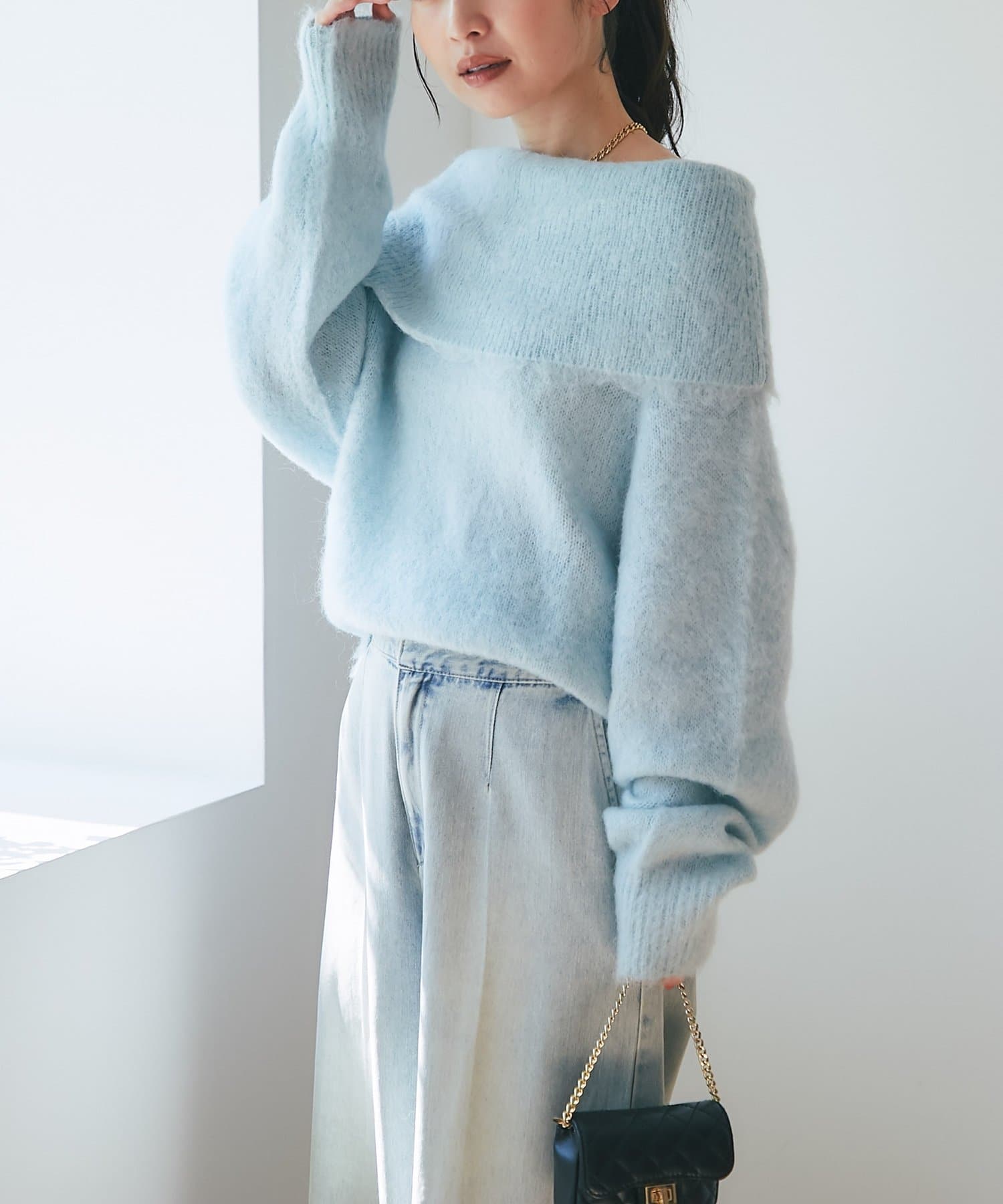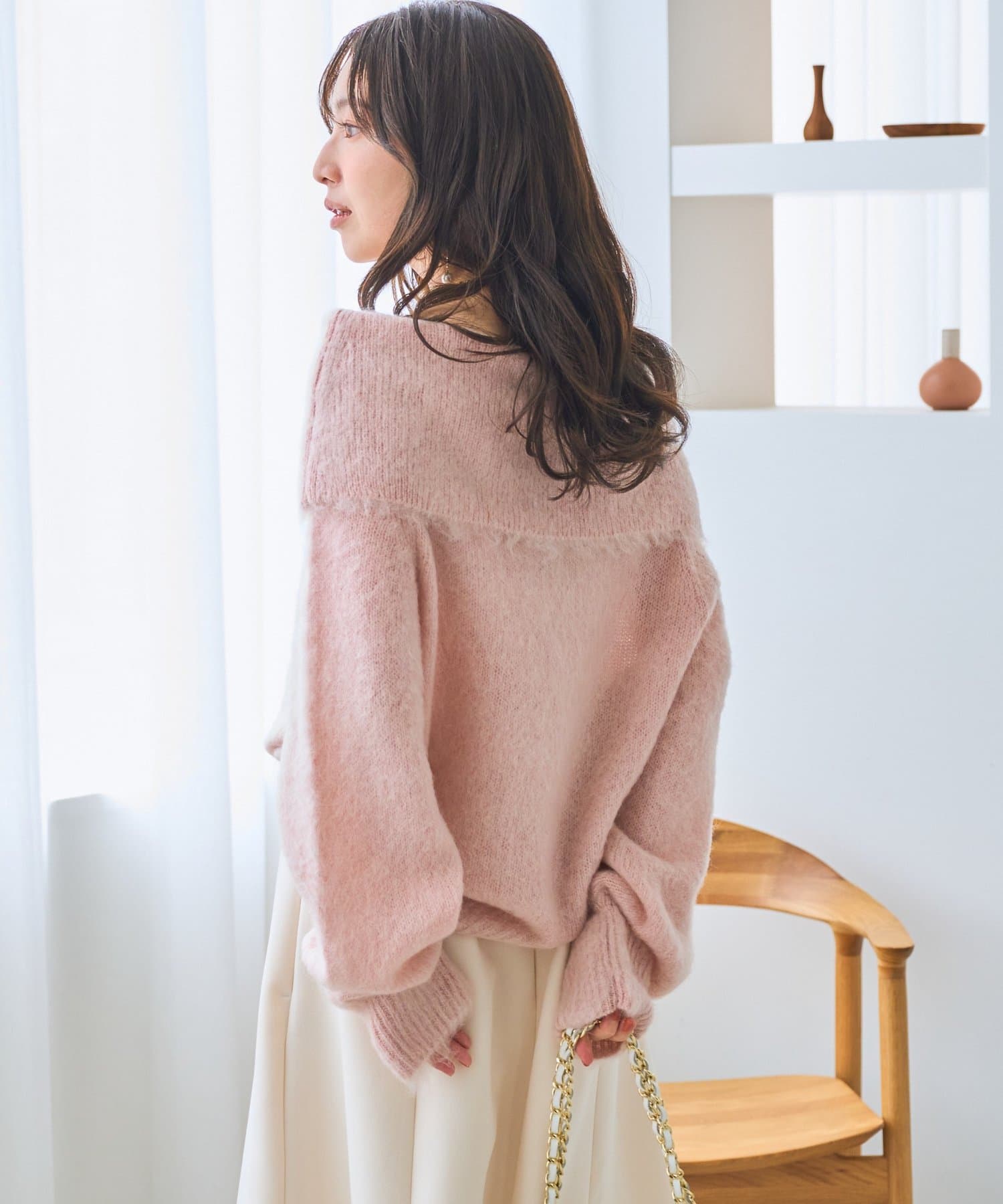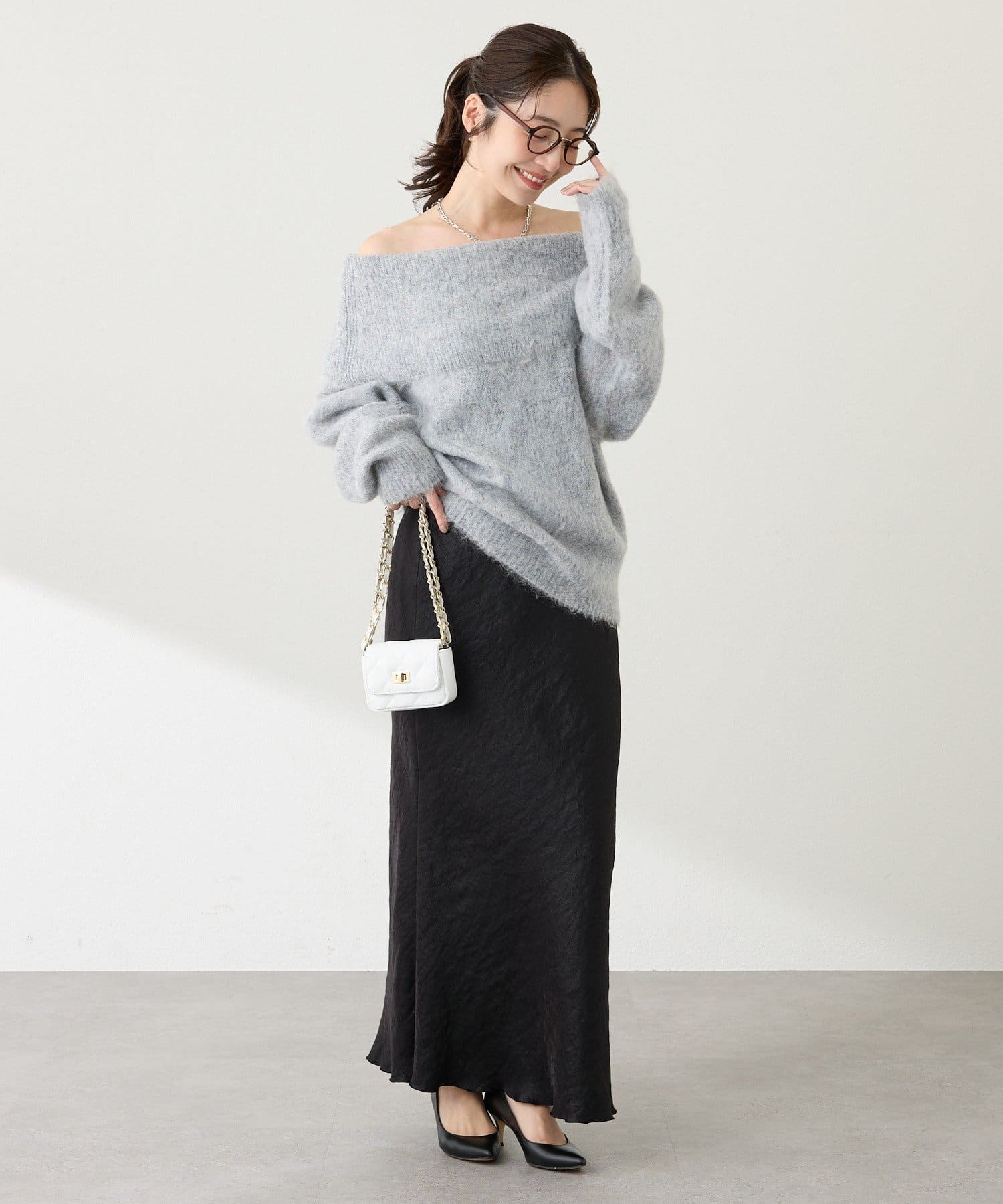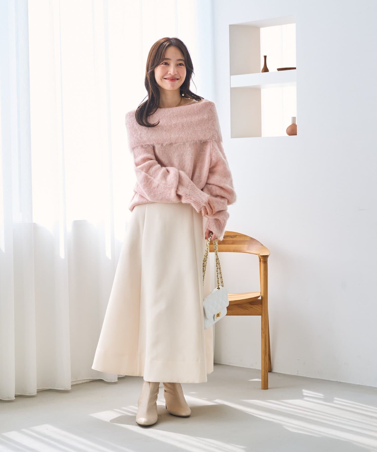 女性らしさが詰まった、毛足長めのふんわりオフショルニット。