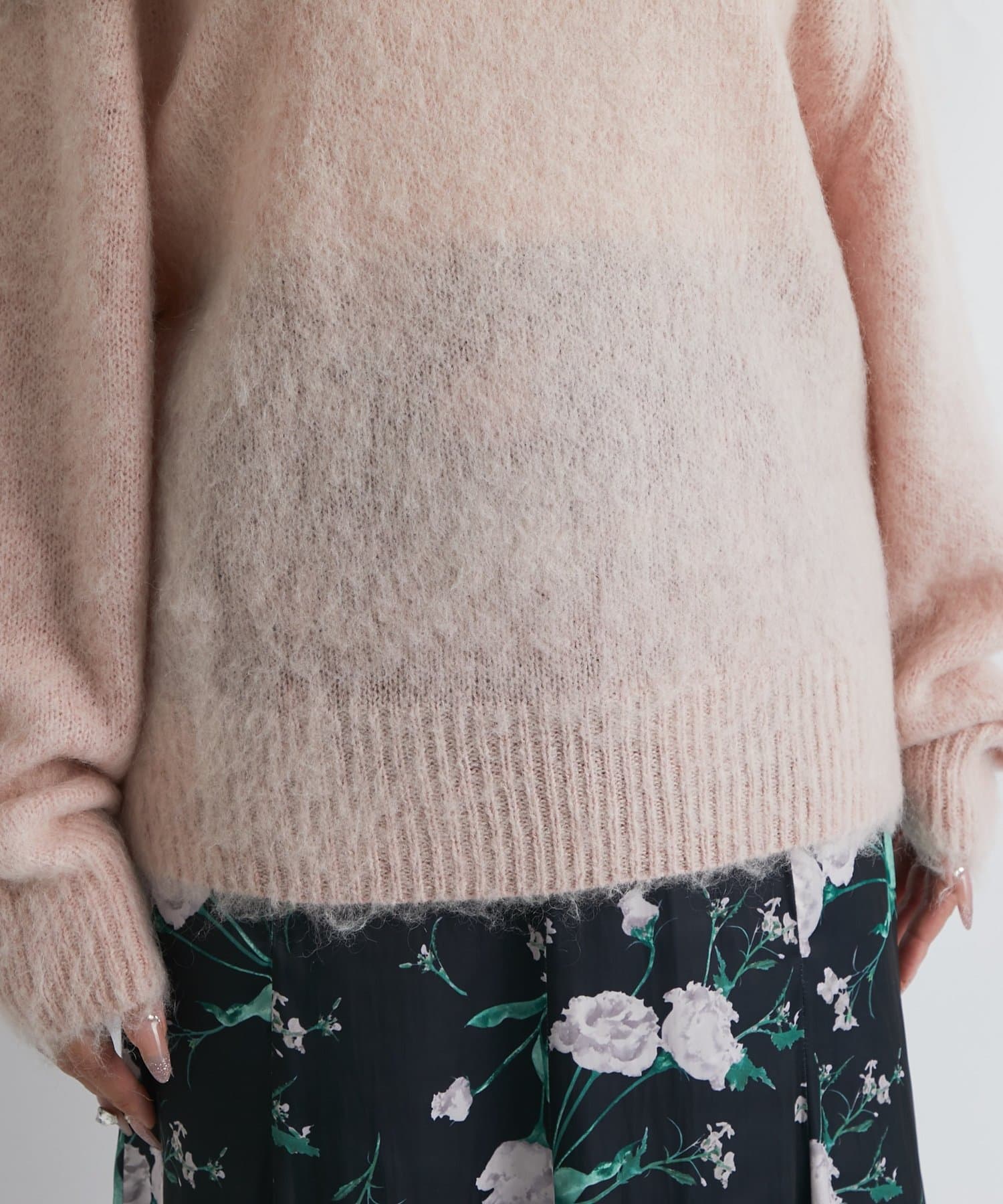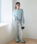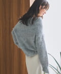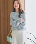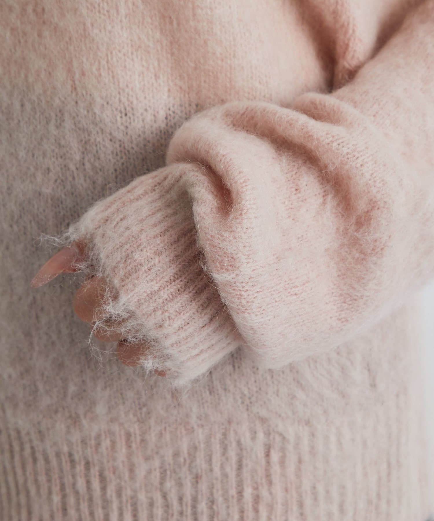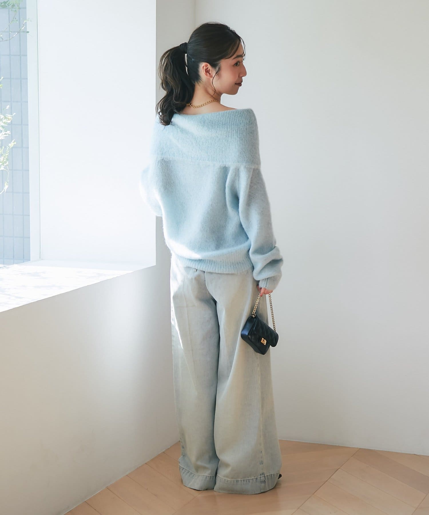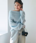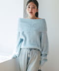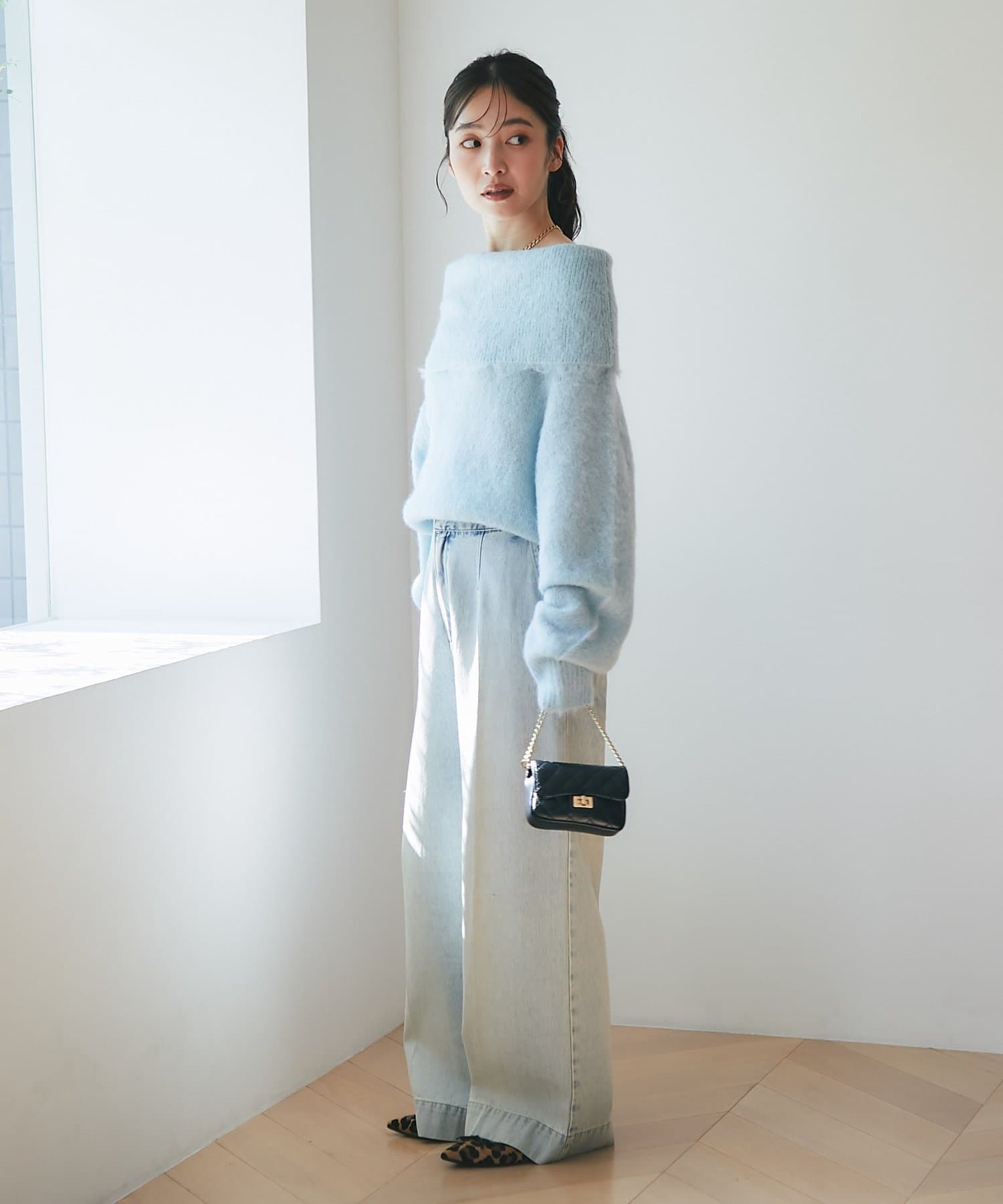 女性らしさが詰まった、毛足長めのふんわりオフショルニット。