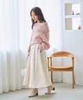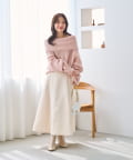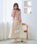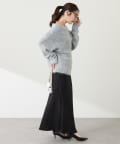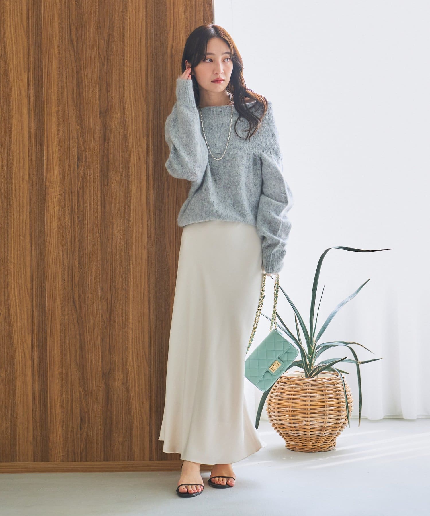 光沢のあるスカートなど素材感のあるボトムスと合わせると、ふわふわ素材が際立ちます。