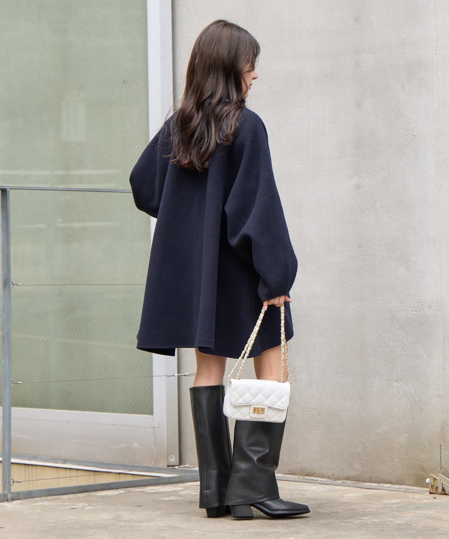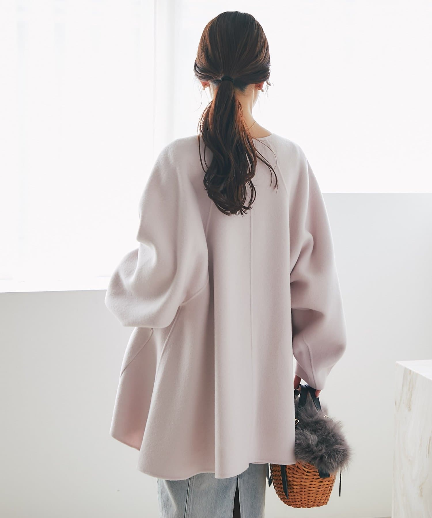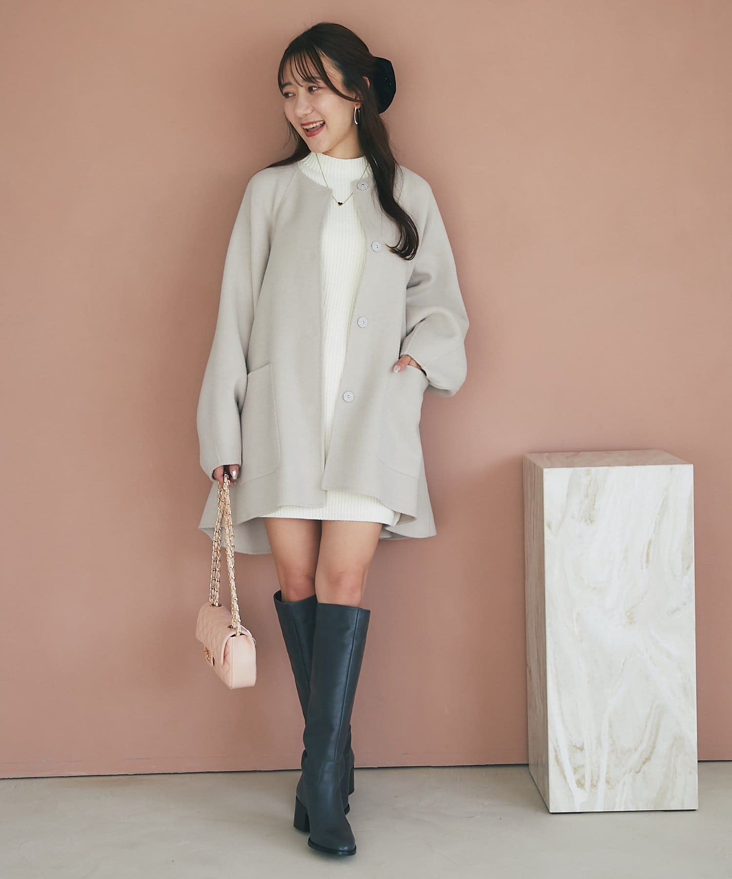 ノーカラーのクルーネックにゆったりシルエットのフレアラインコート。