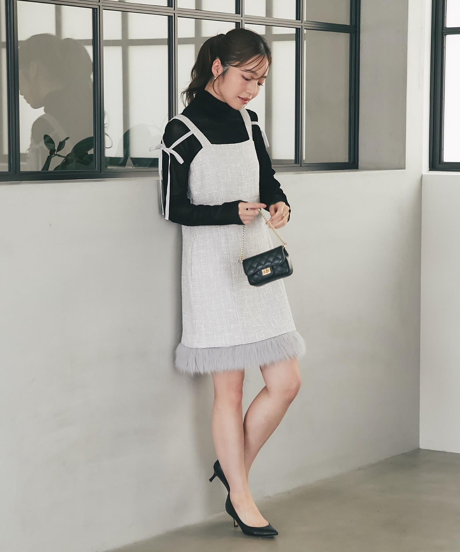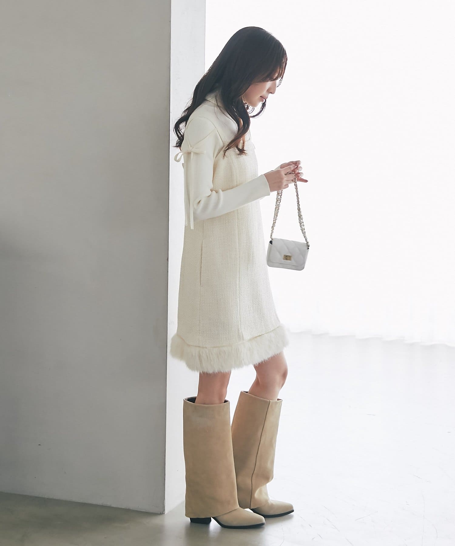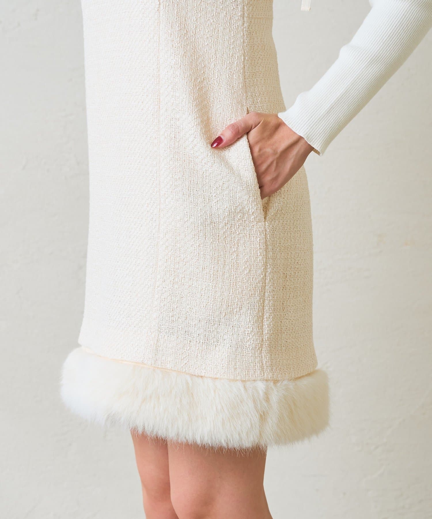 裾にファーをあしらったツイードの華やかジャンドレ。