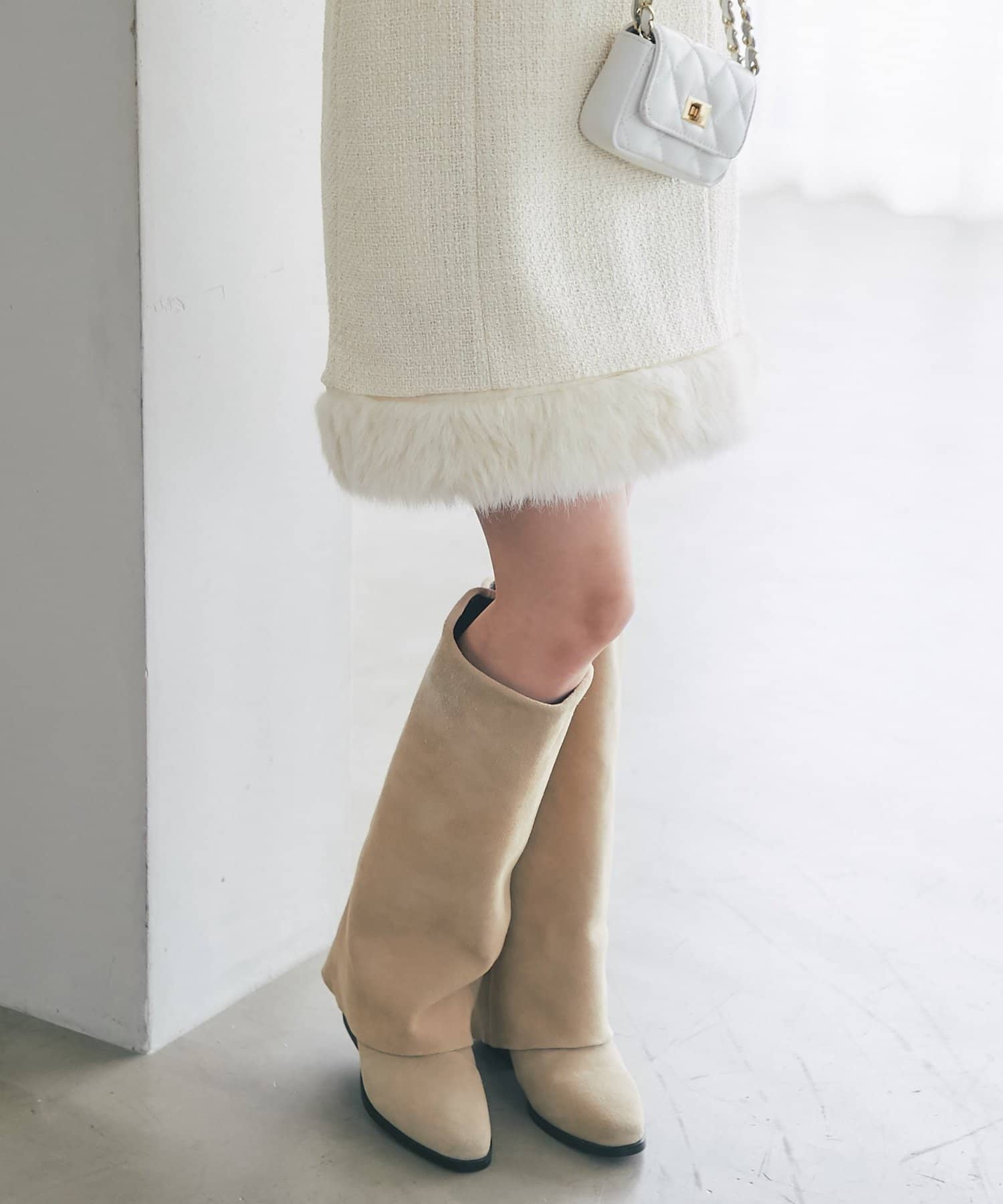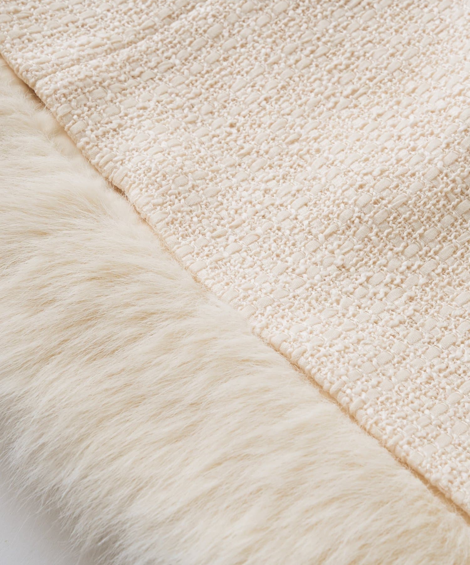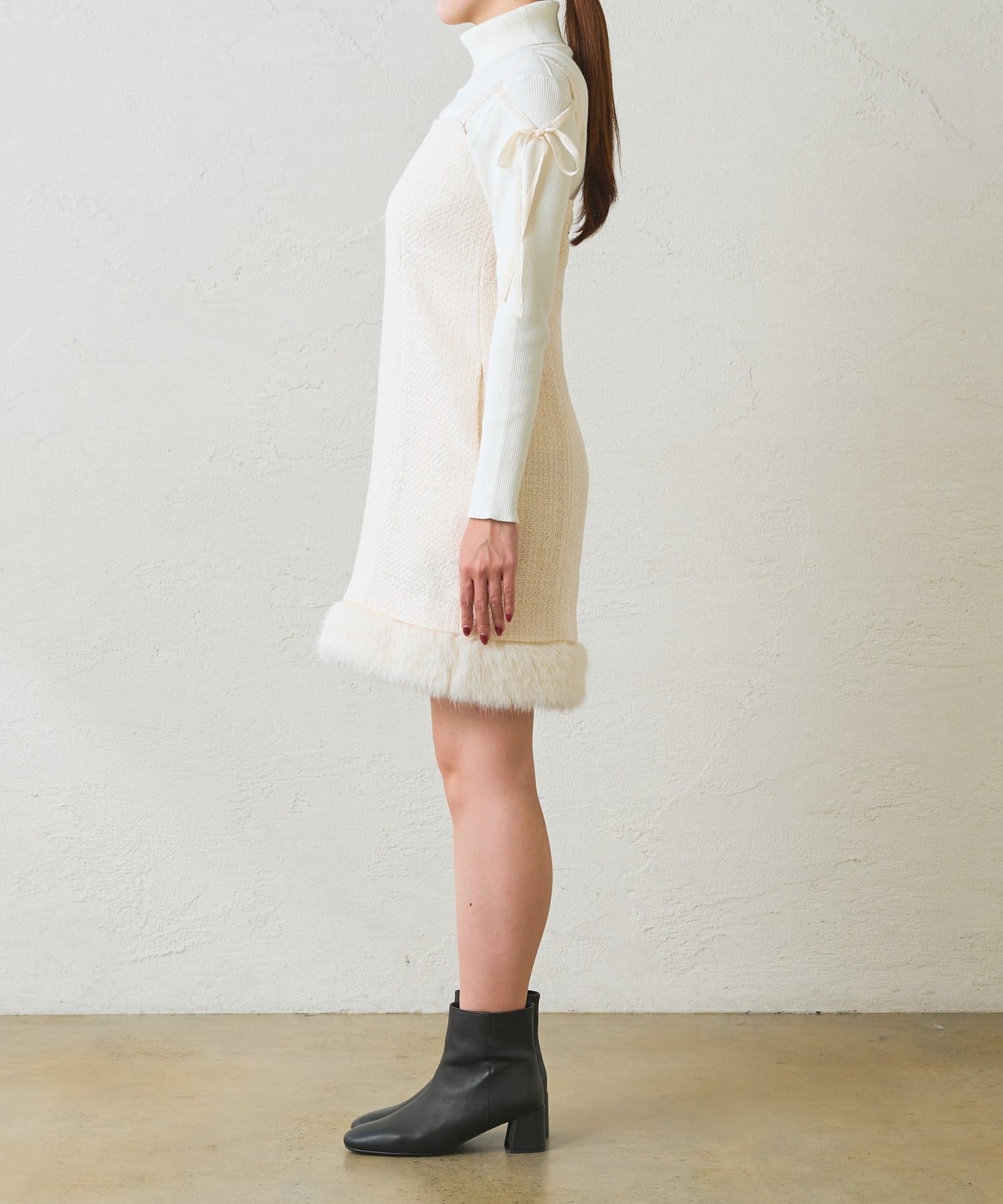 裾にファーをあしらったツイードの華やかジャンドレ。
