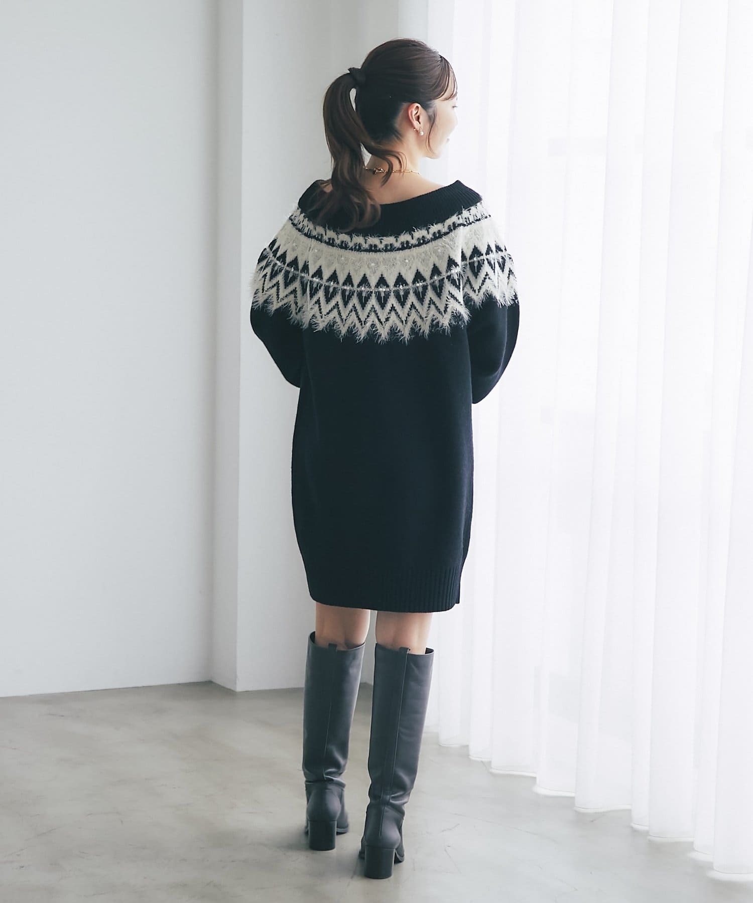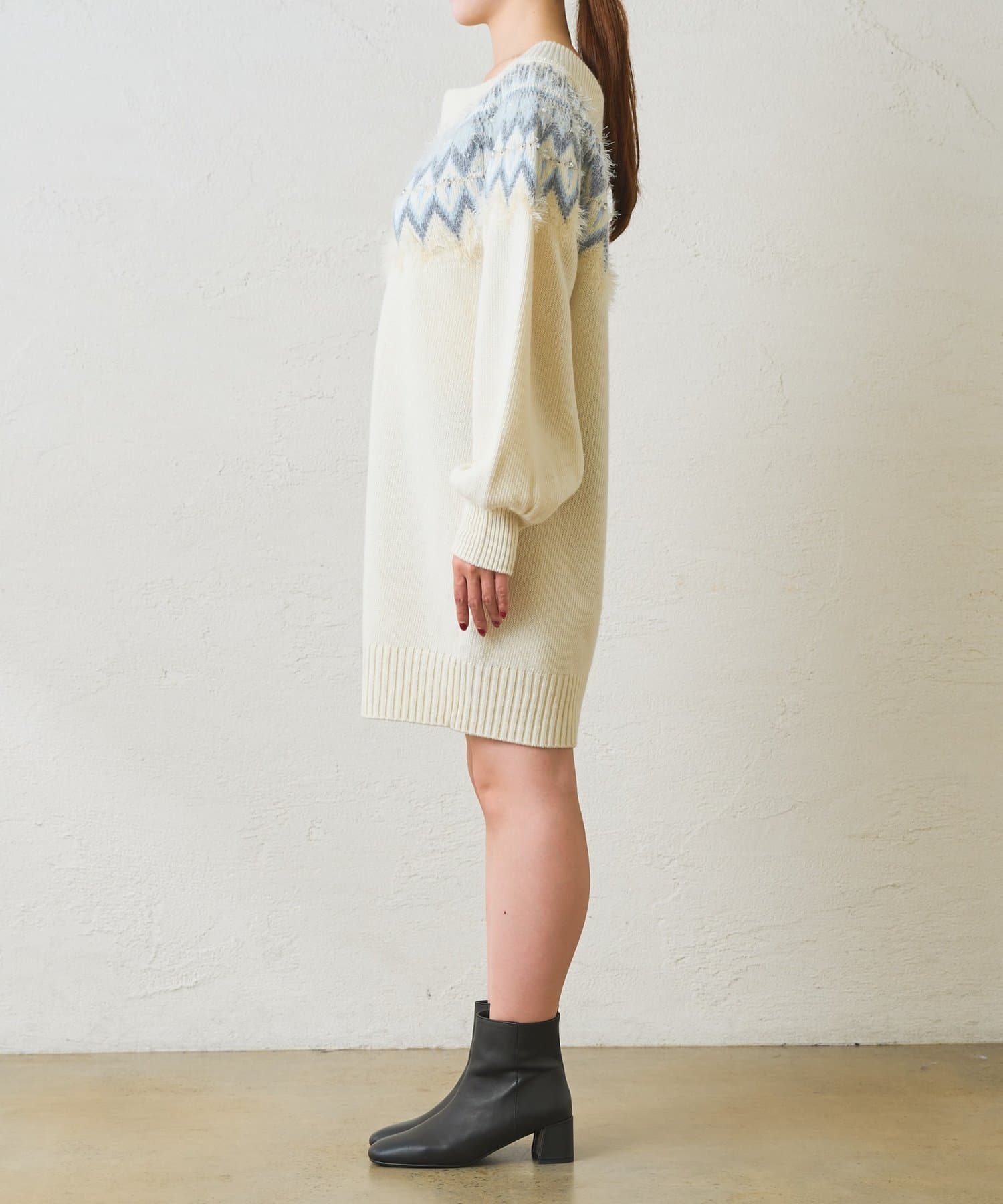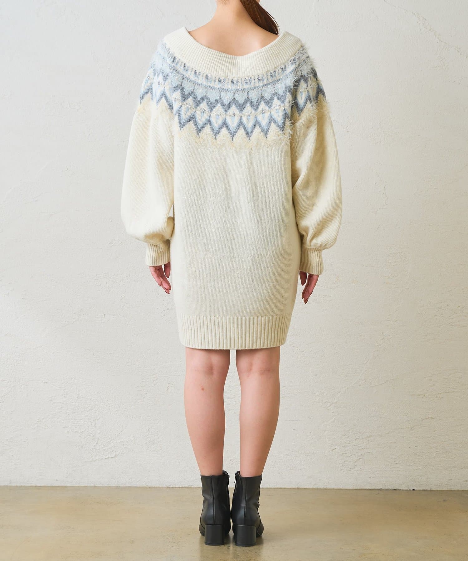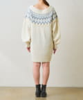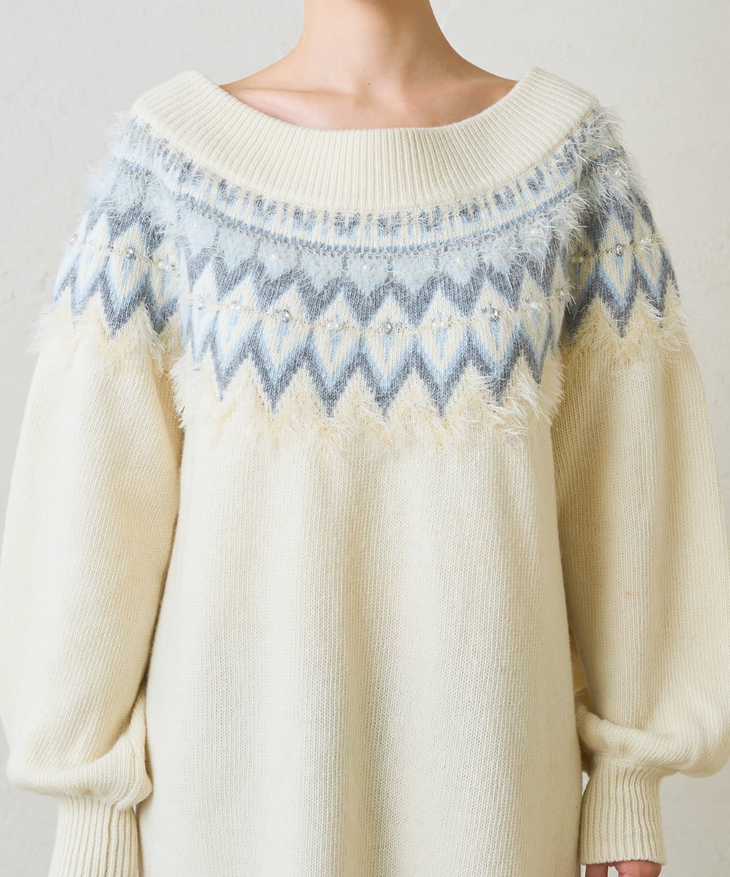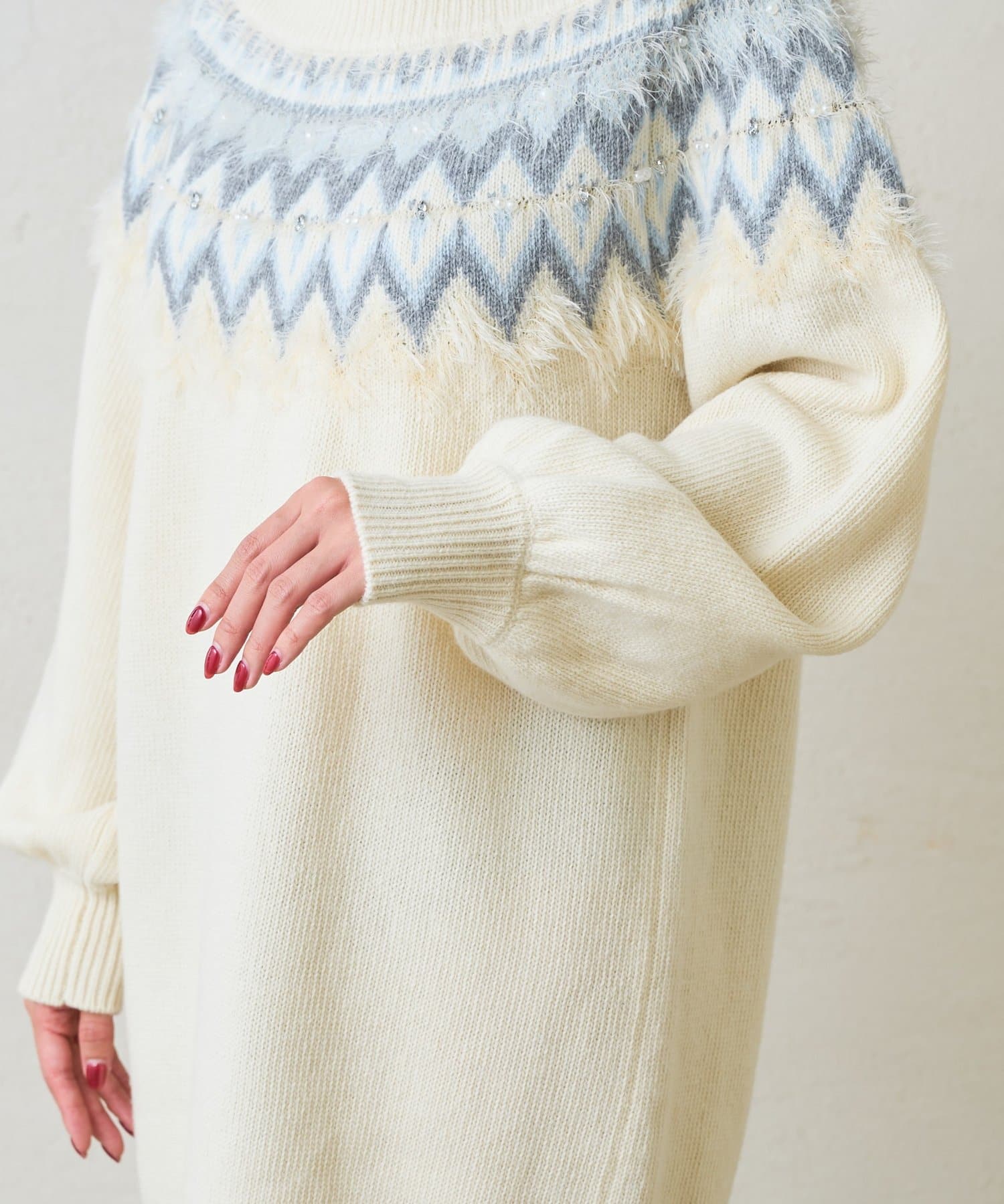 ビジューやパールをあしらったフェアアイルニットのミニワンピース。