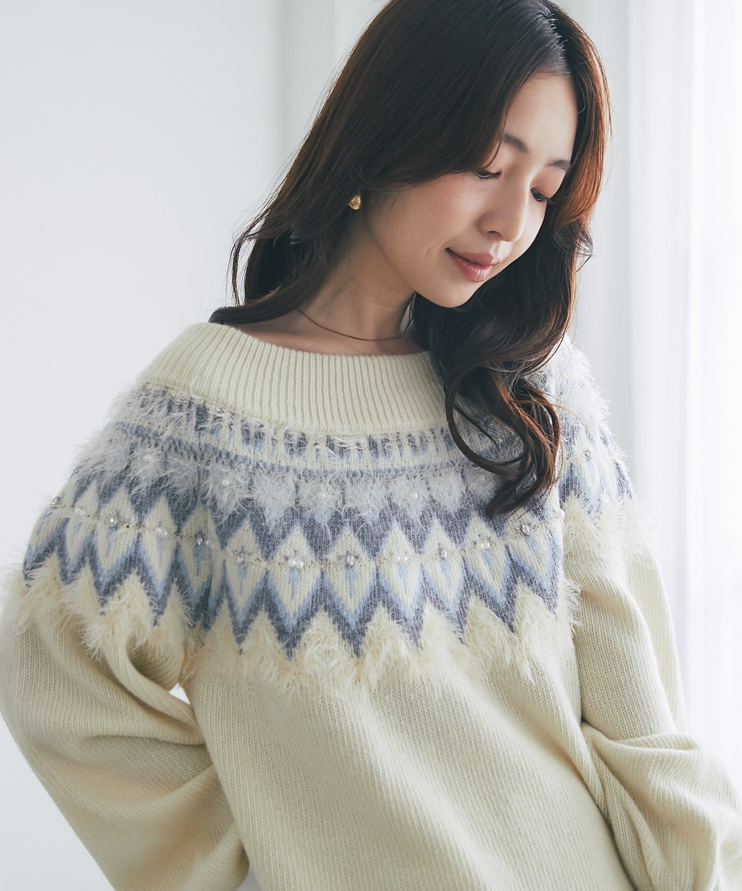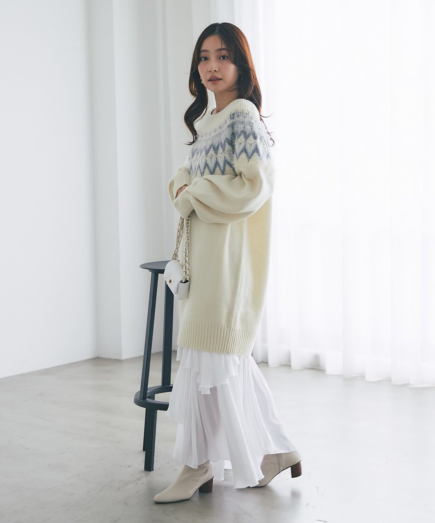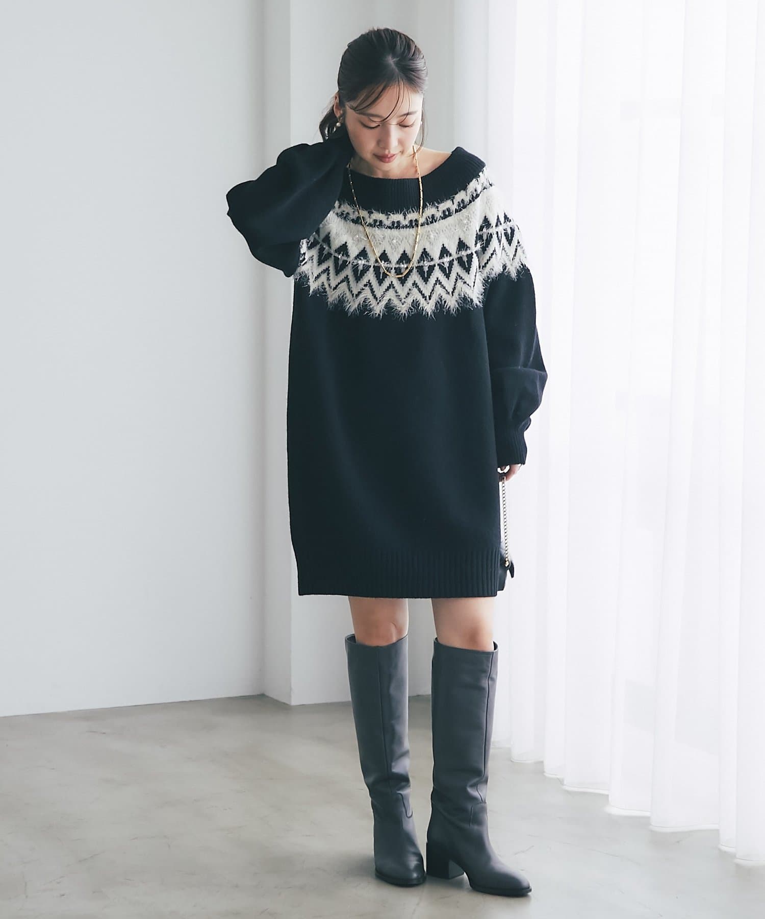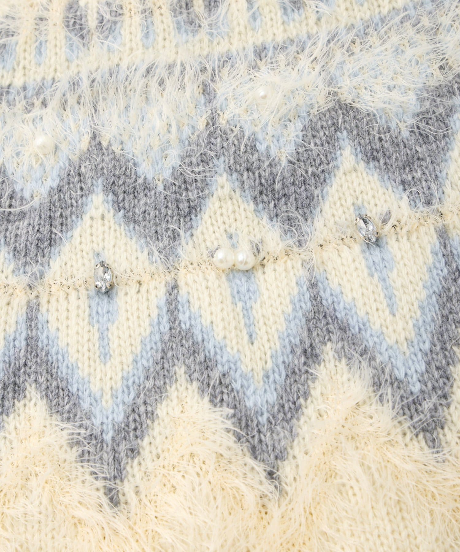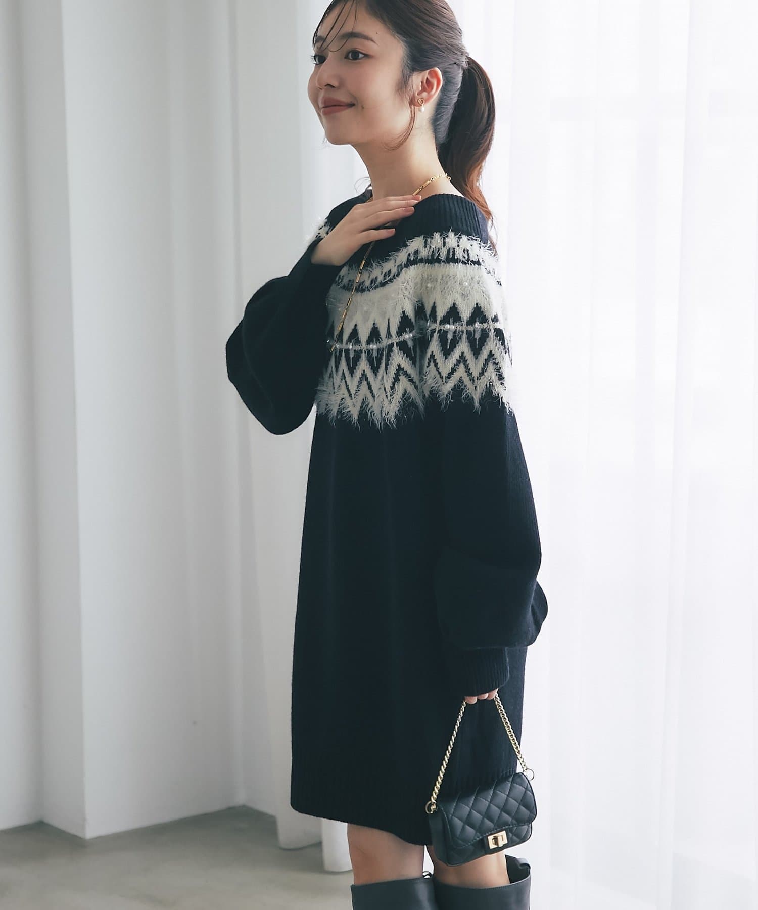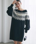 ビジューやパールをあしらったフェアアイルニットのミニワンピース。