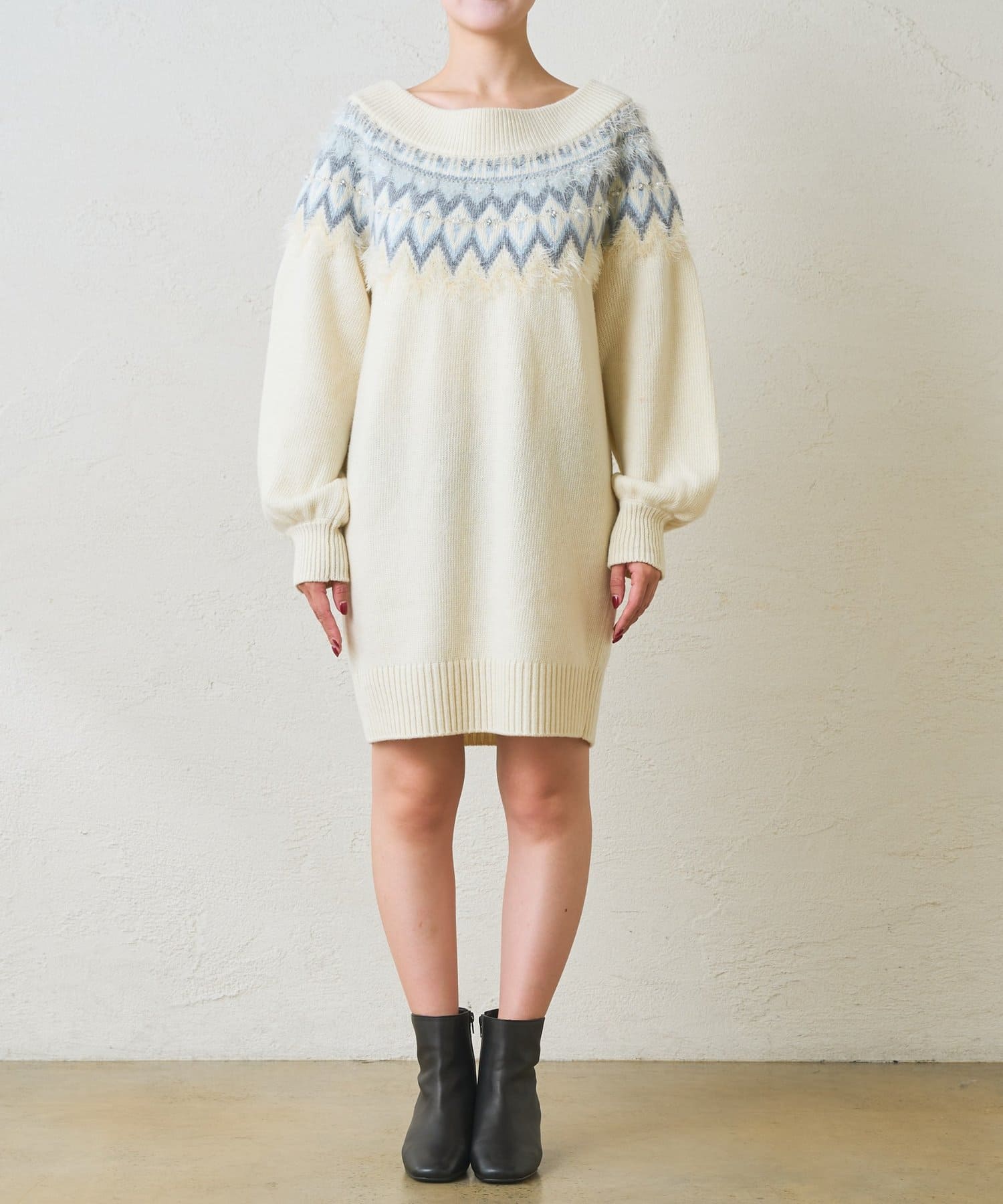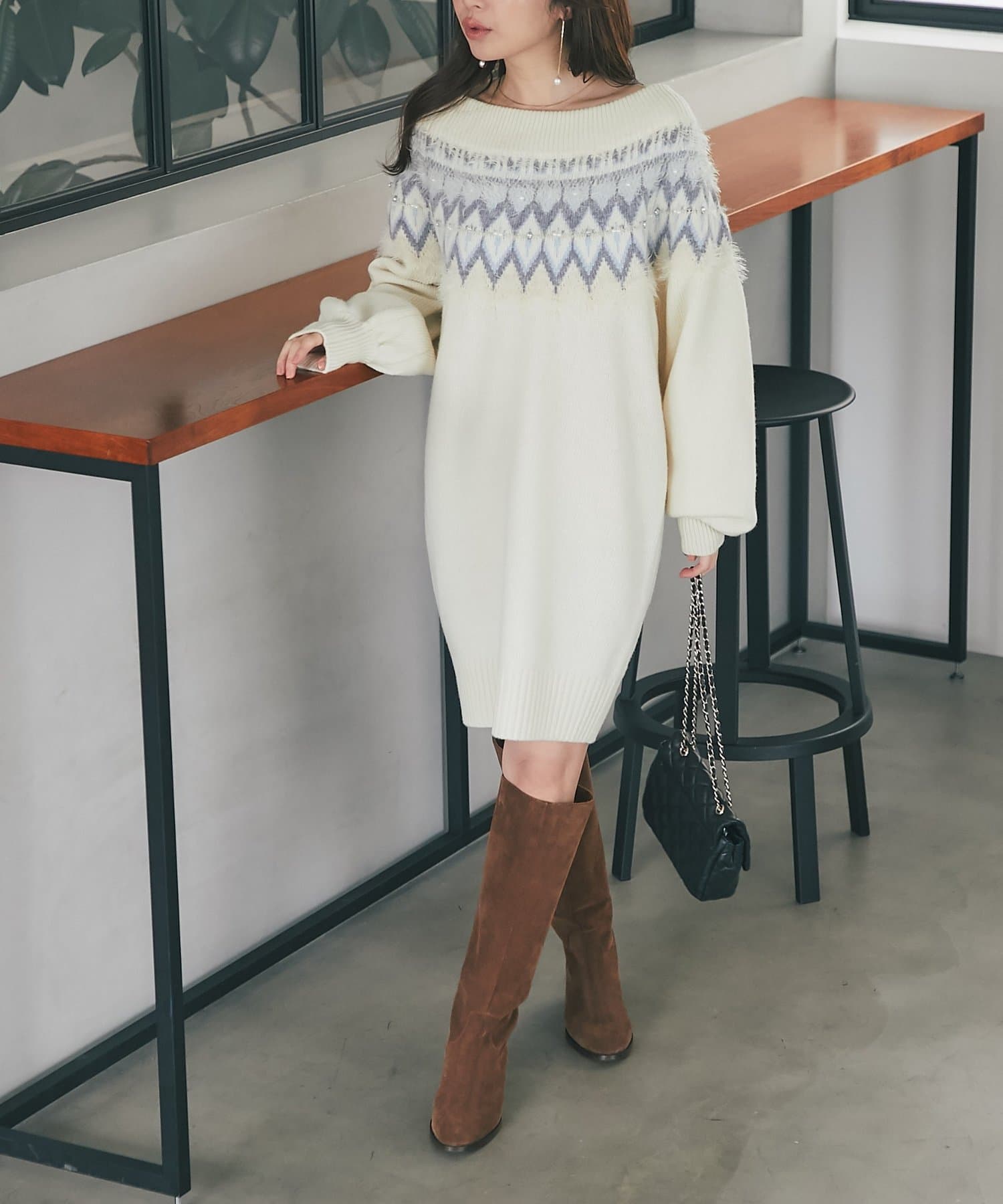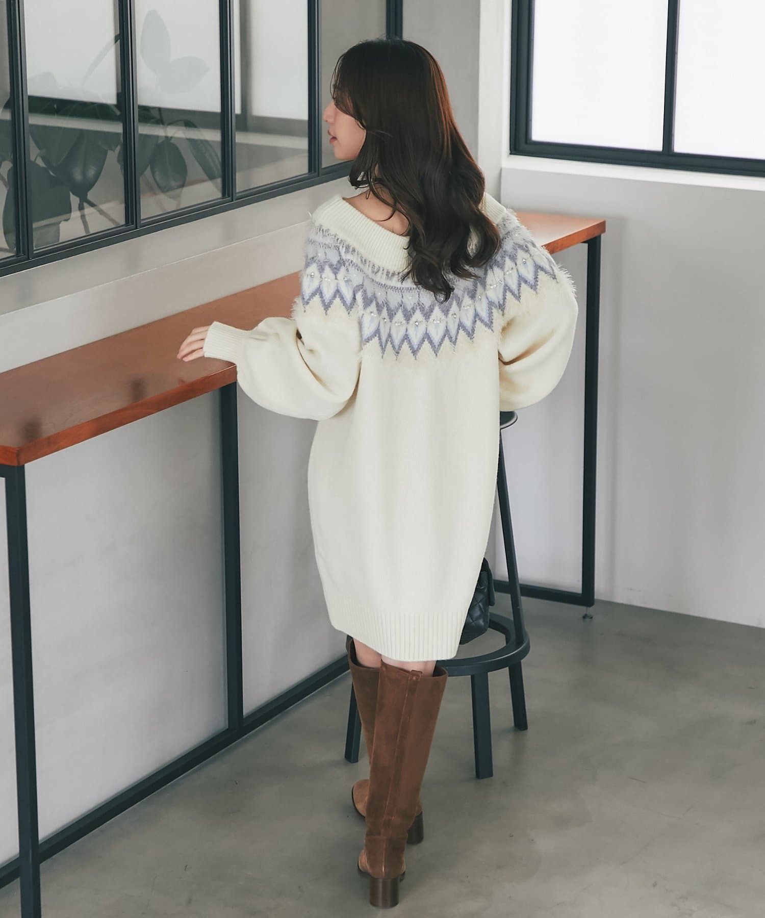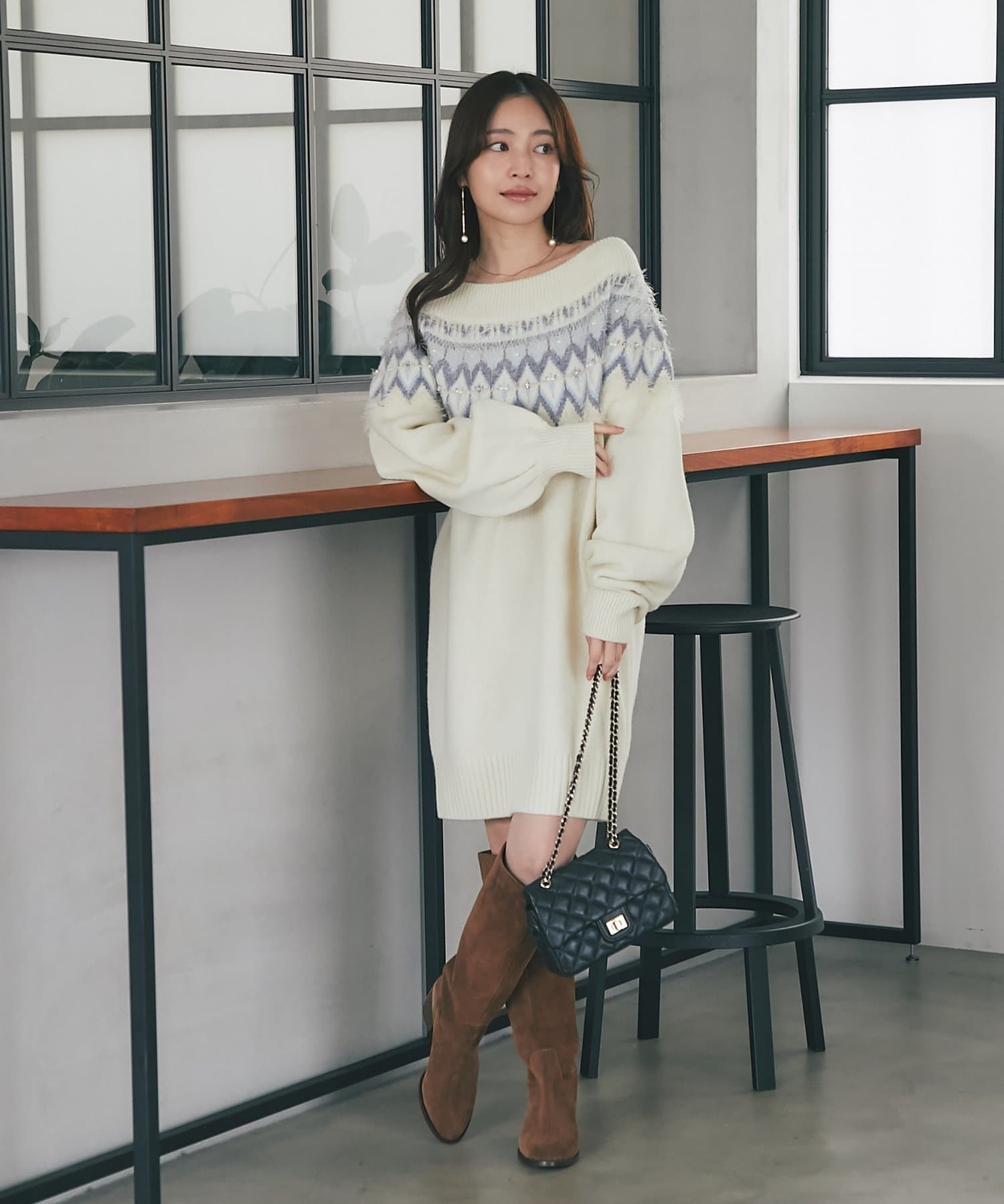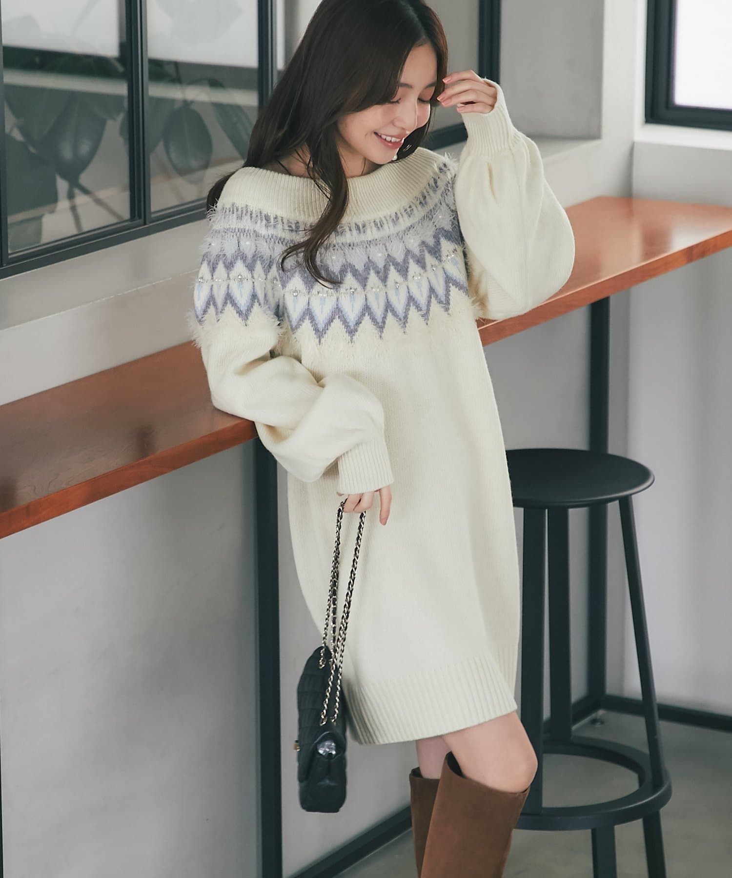【女っぽカジュアル】フェアアイルオフショルニットワンピース