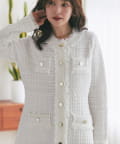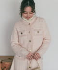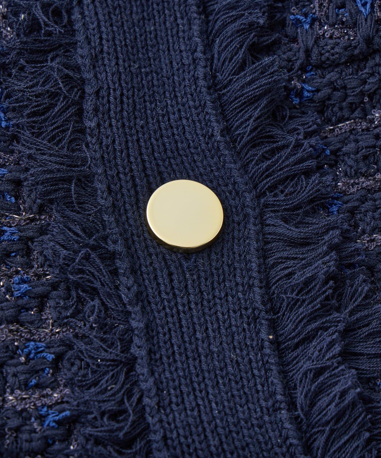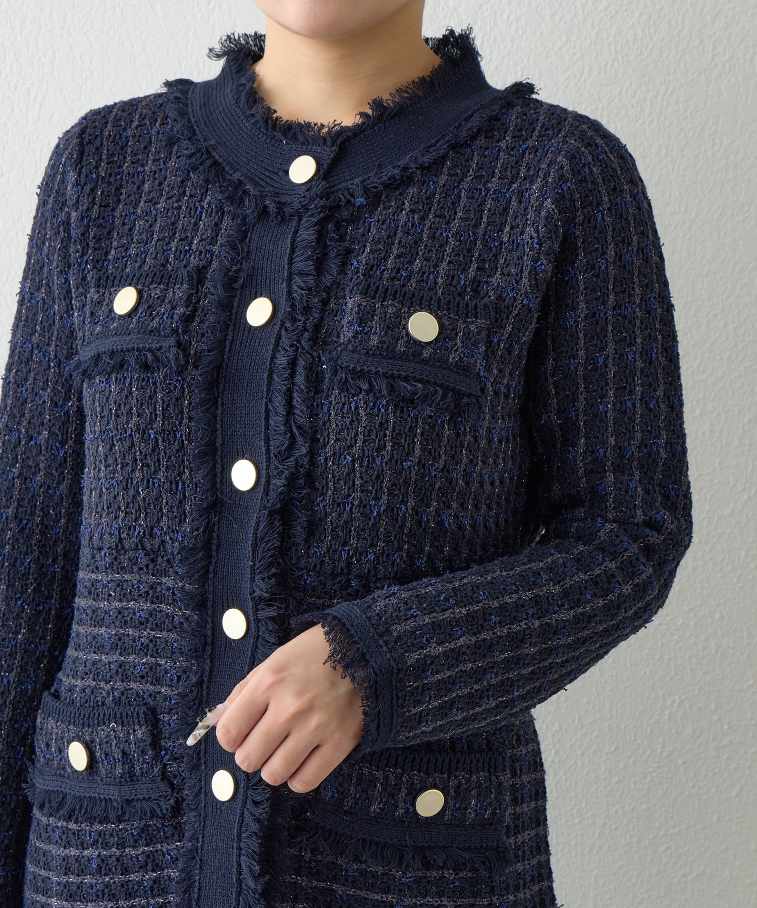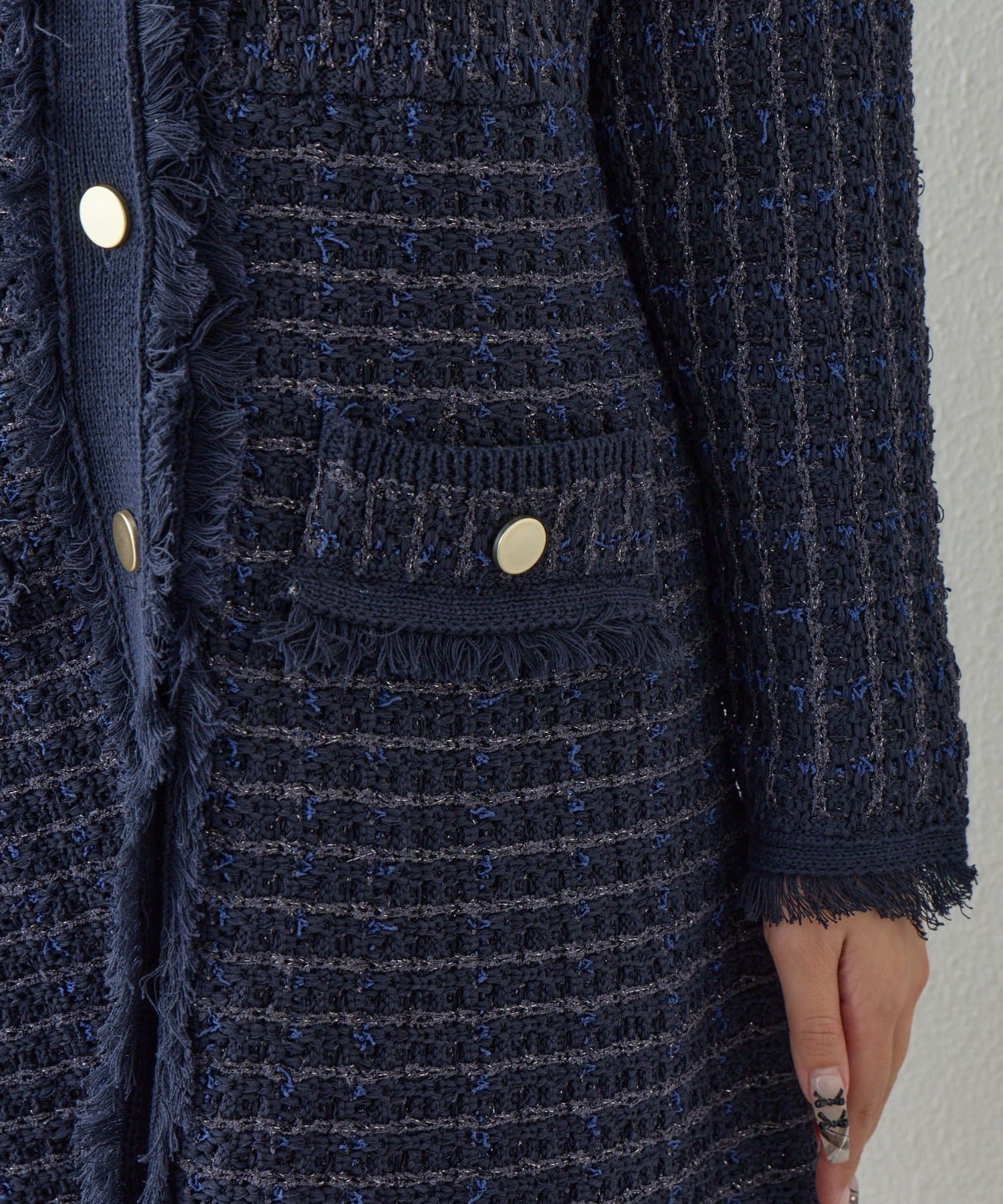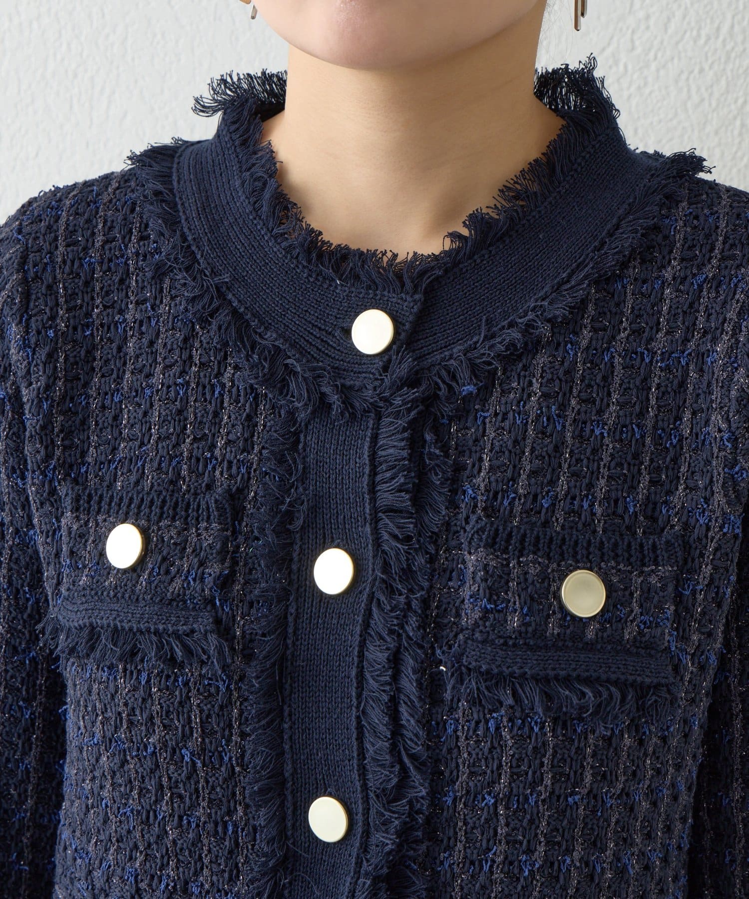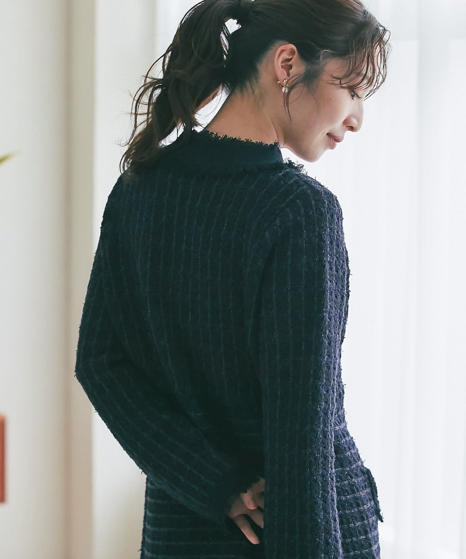 ラメ糸や意匠糸を組み合わせてファンシーツイードのような編地に仕上げました。