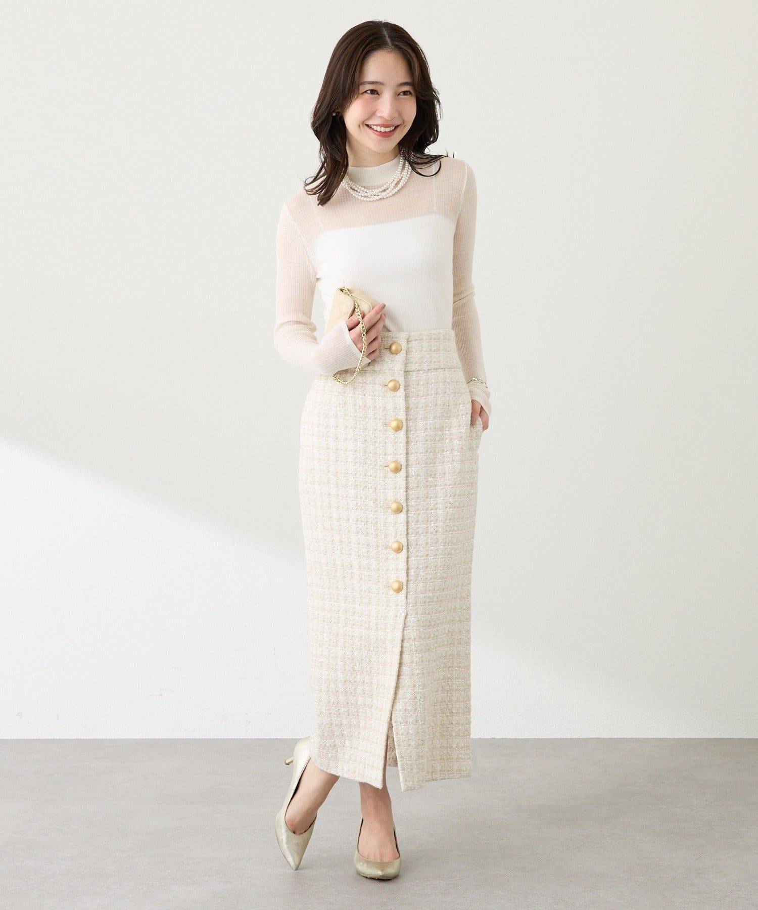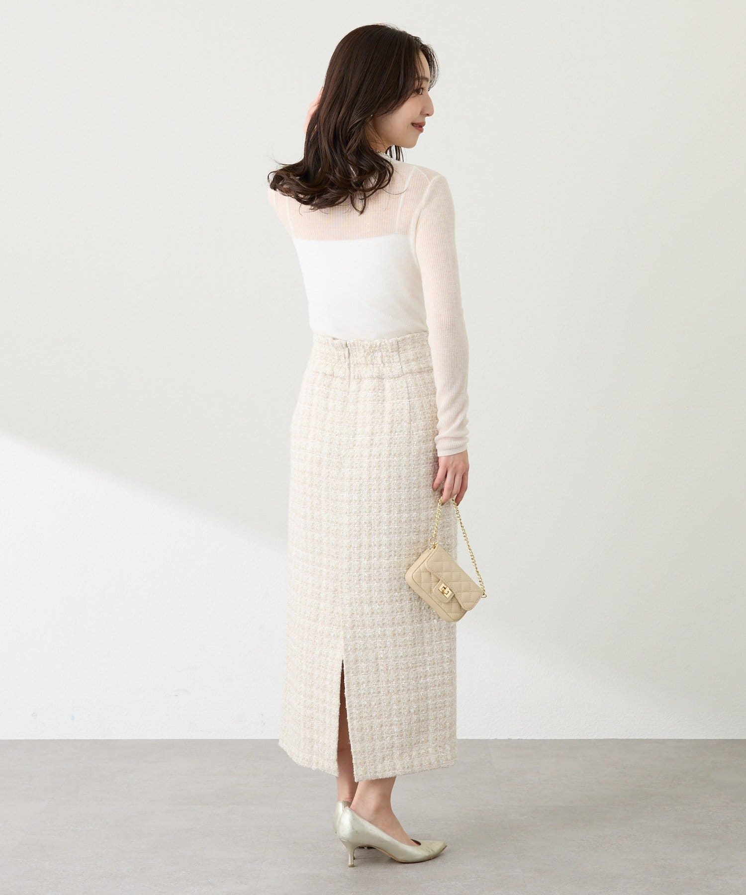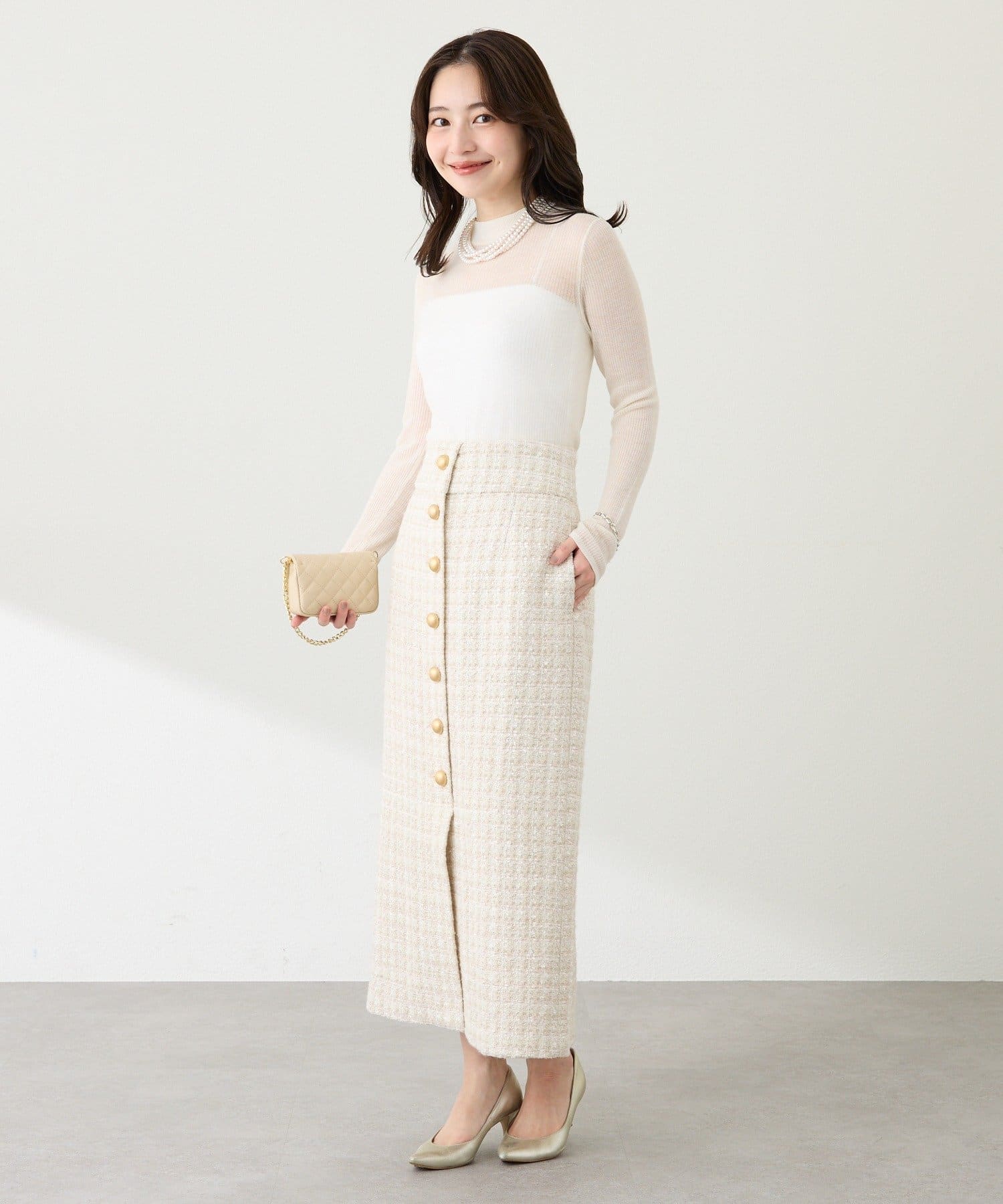 首元を美しく見せるハイネックは、上品で洗練された印象に。