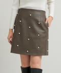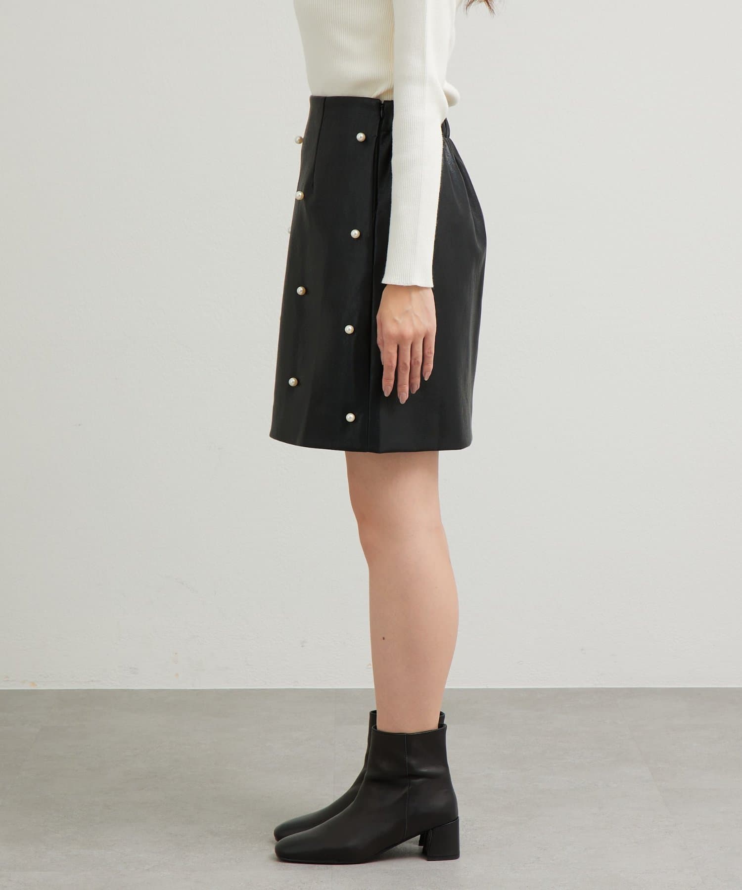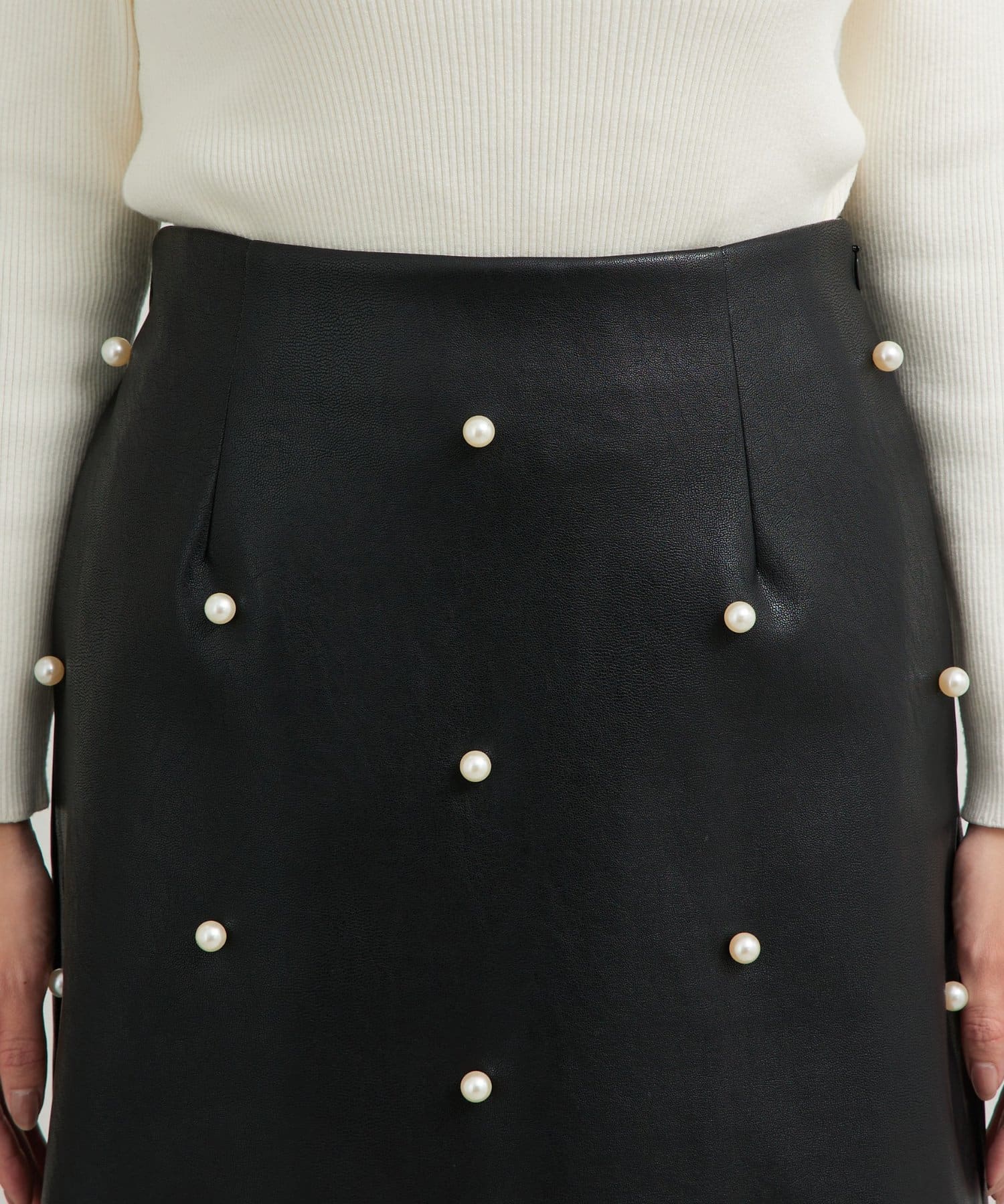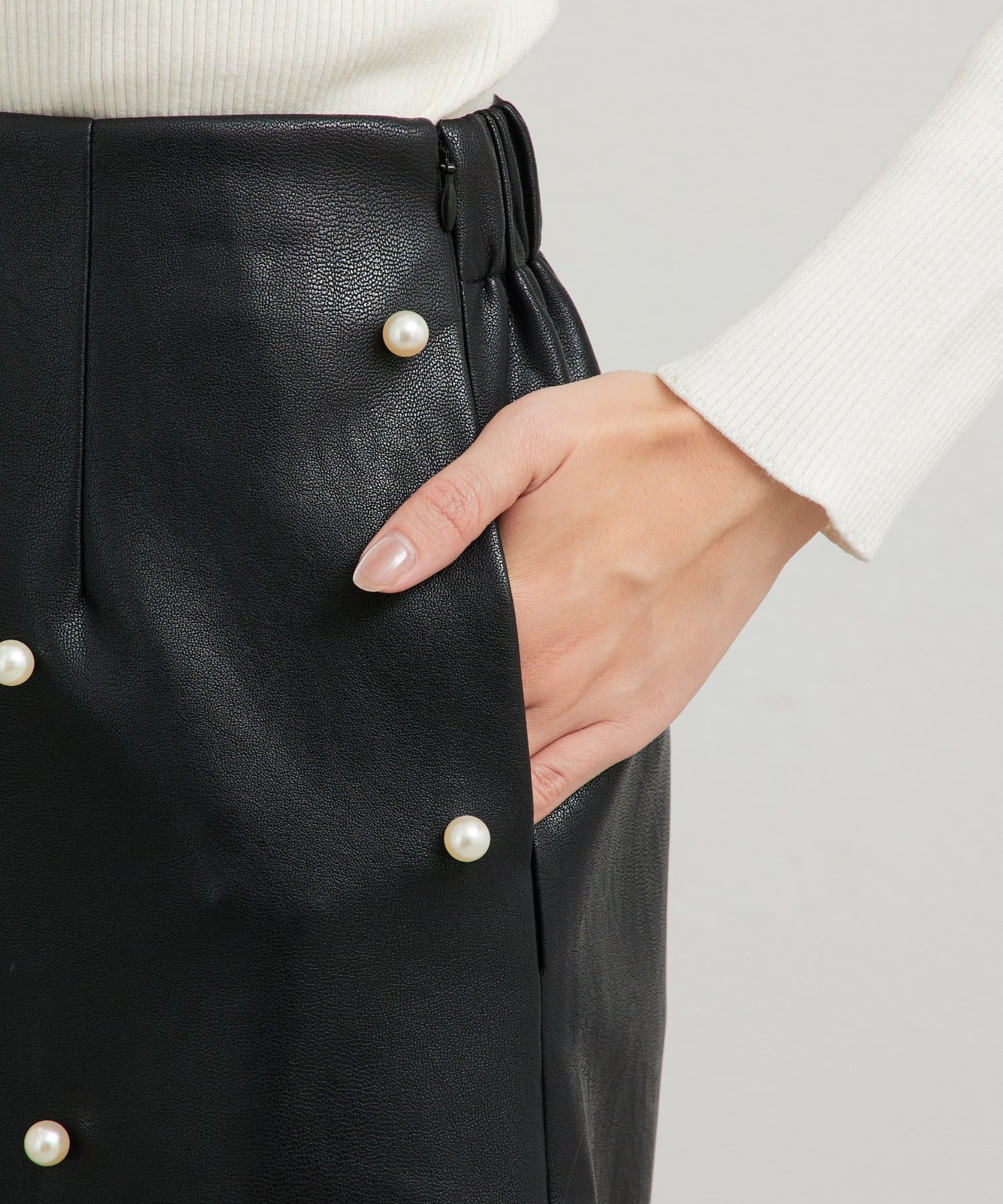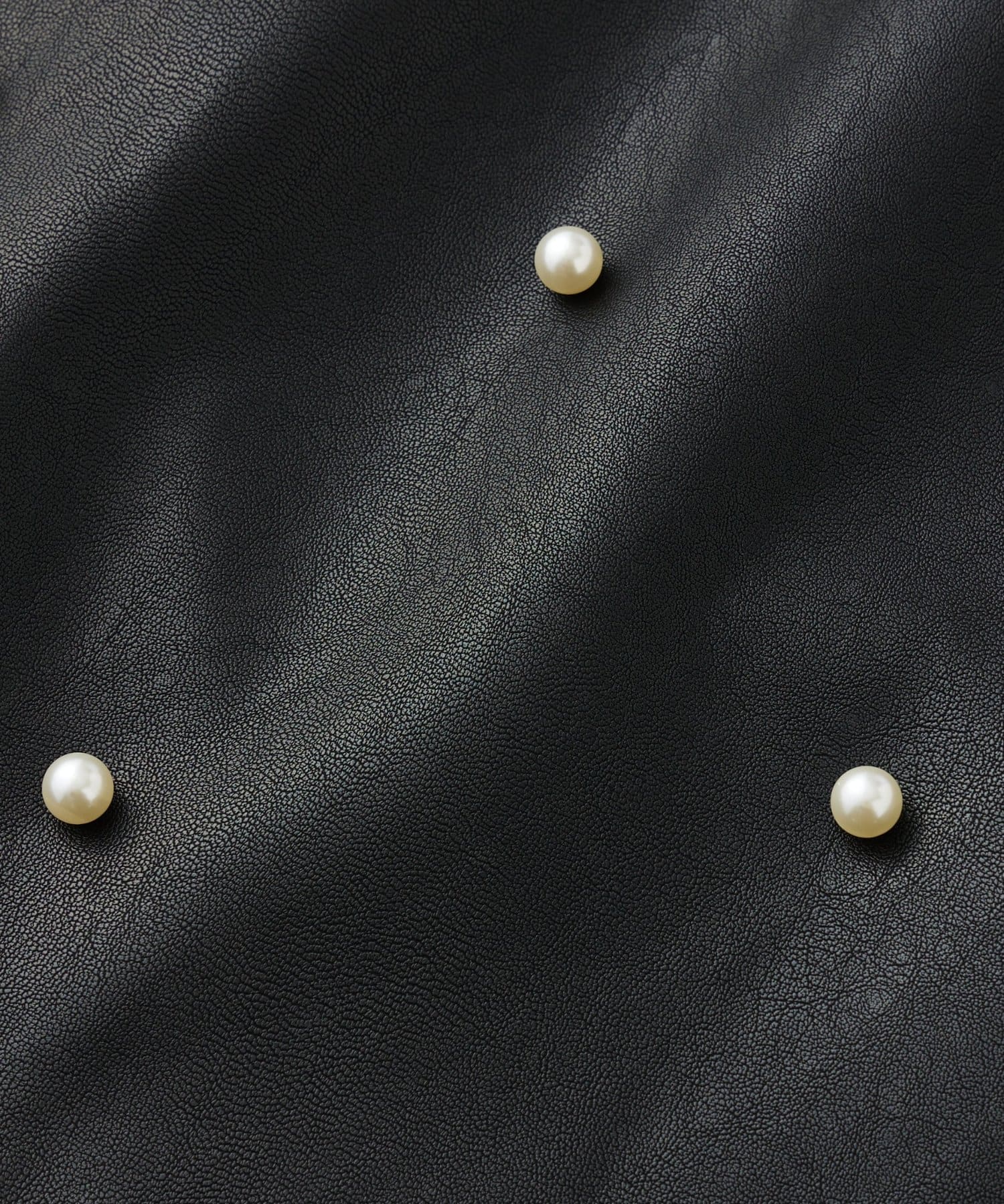 ハードになりがちな合成皮革のスカートに、あえてパールをあしらうことで