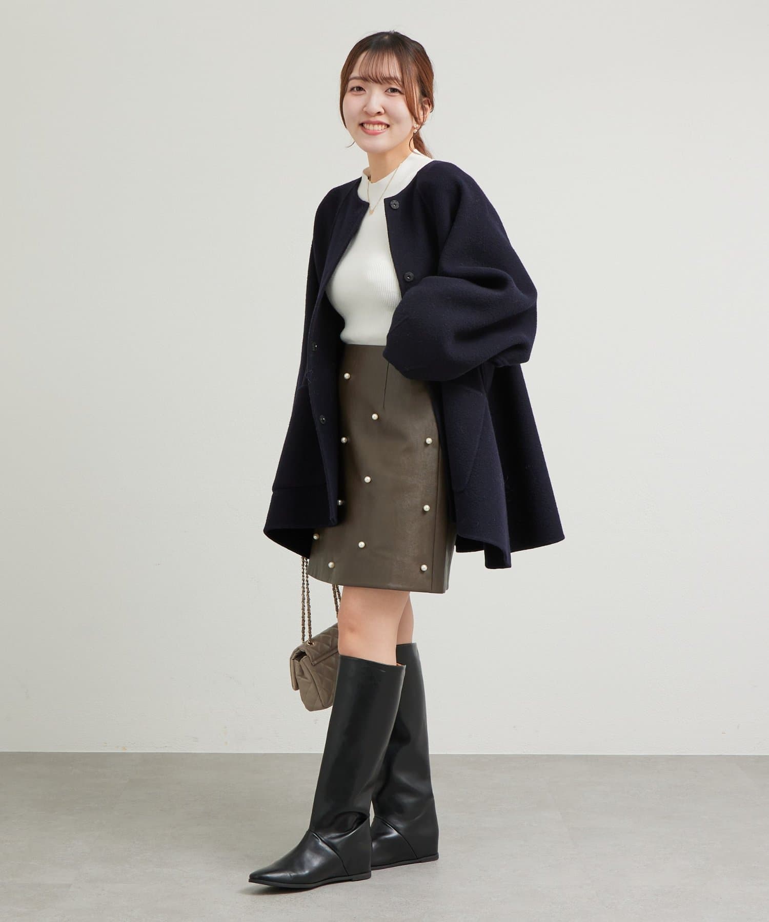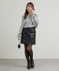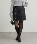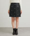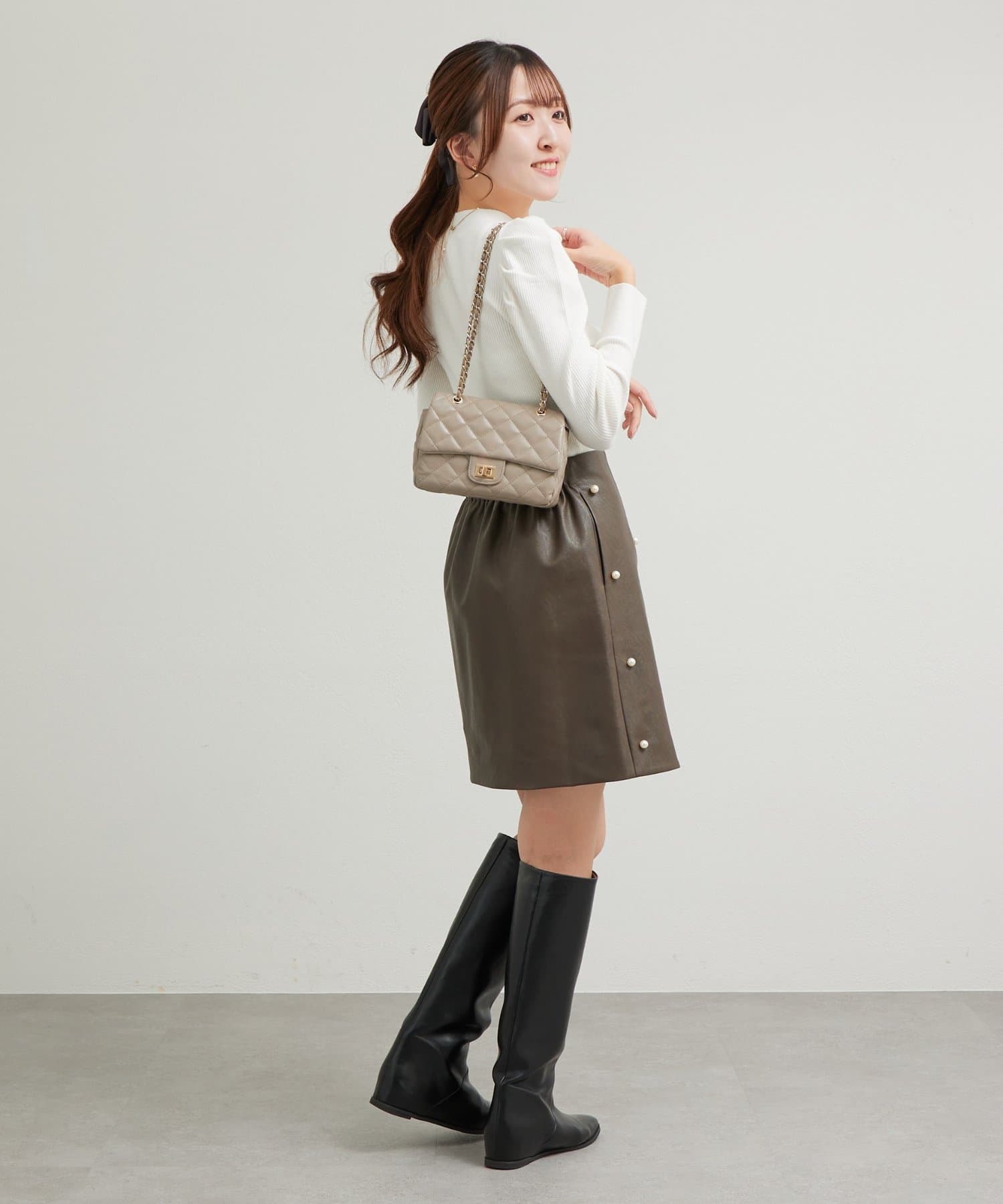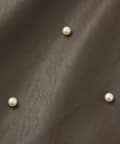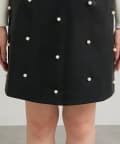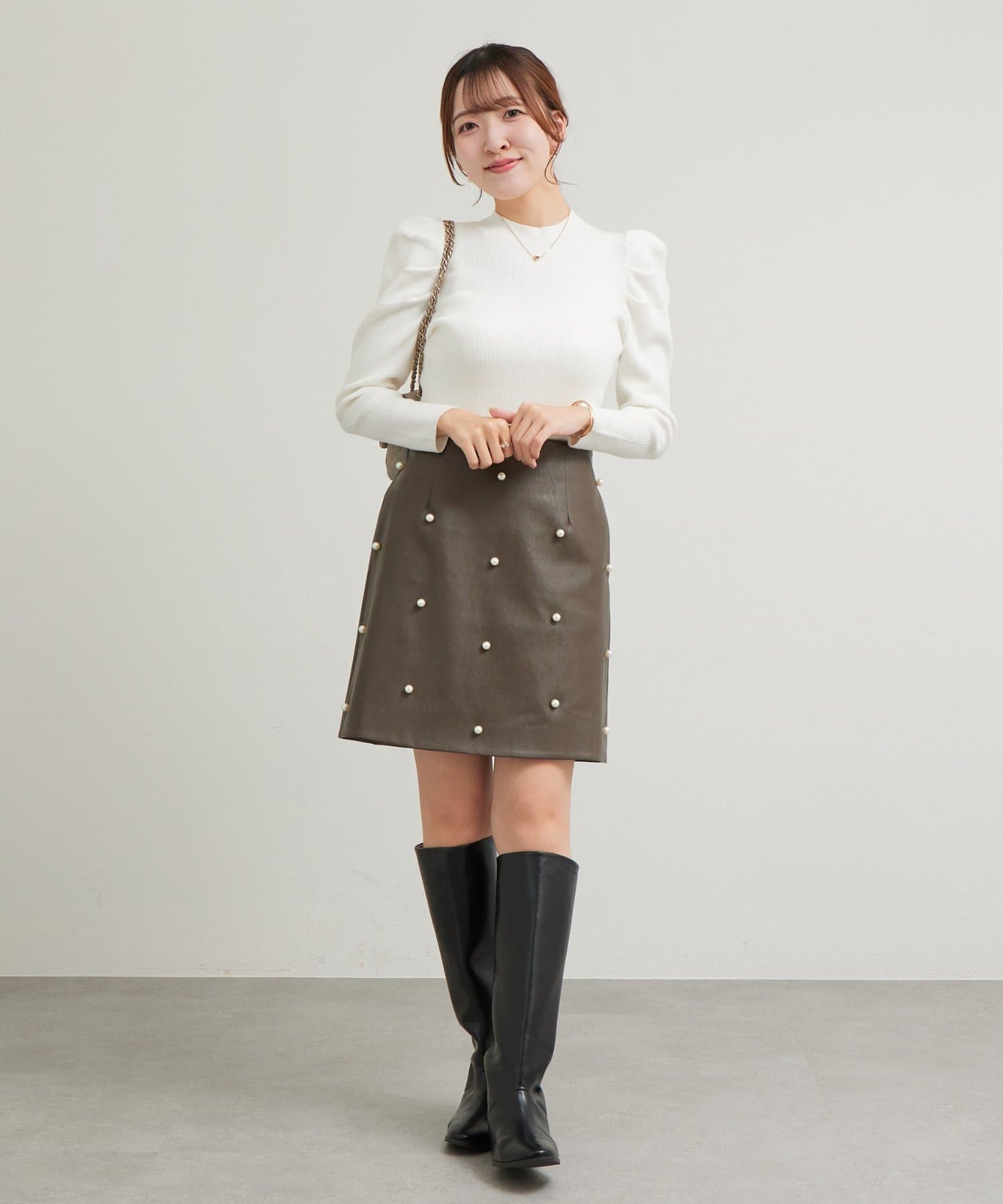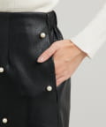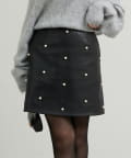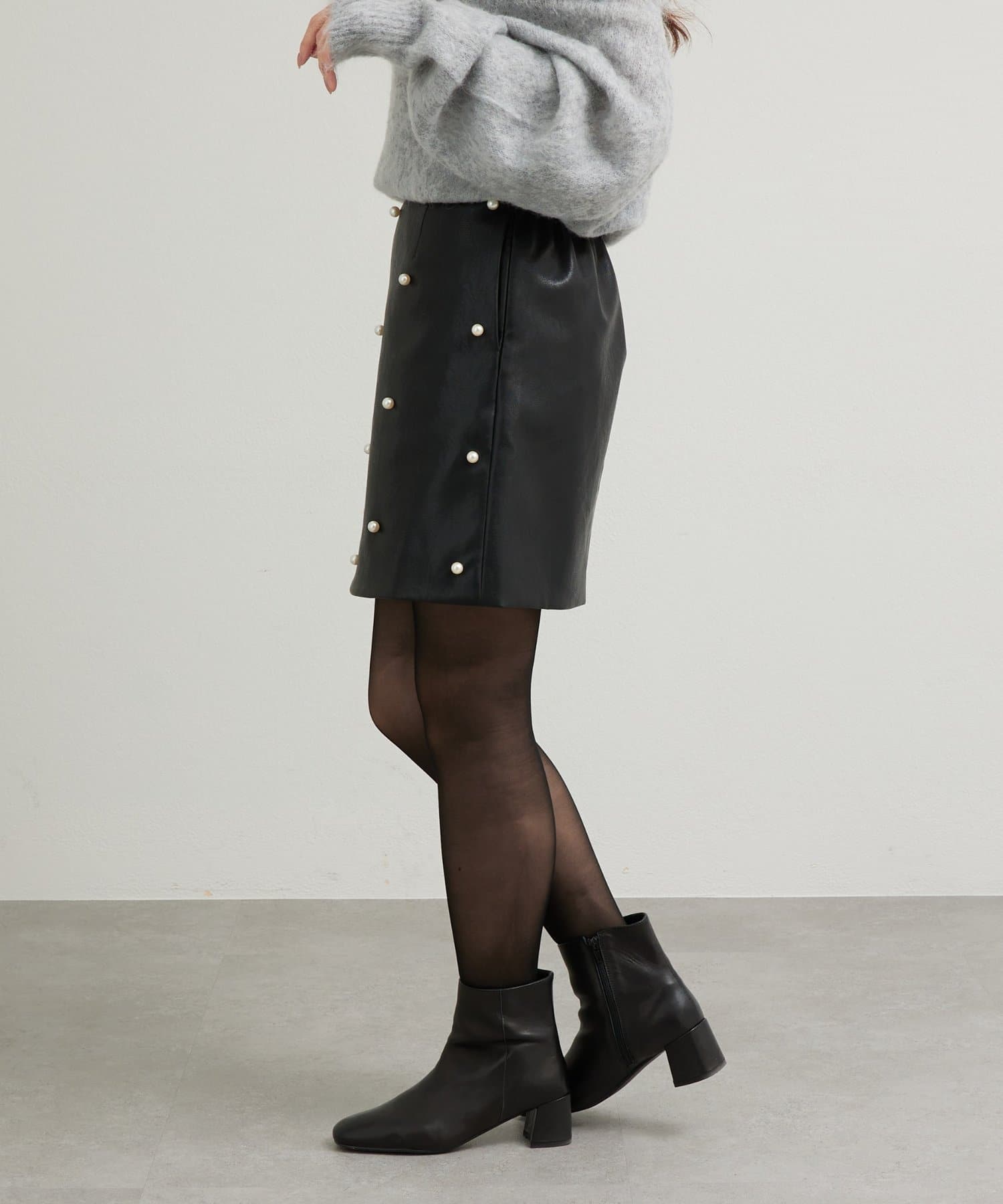 ハードになりがちな合成皮革のスカートに、あえてパールをあしらうことで