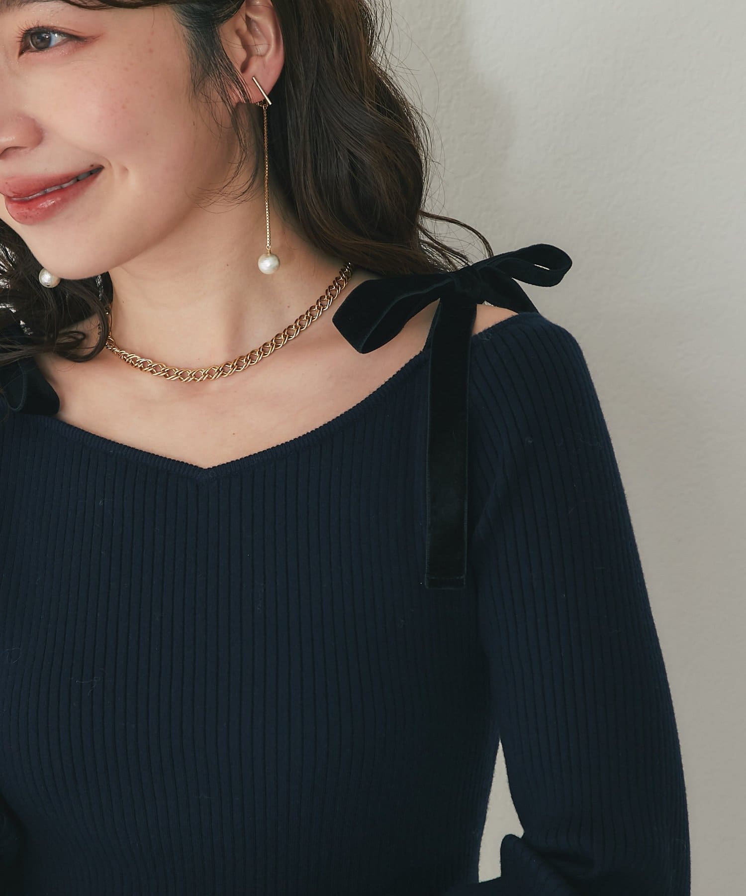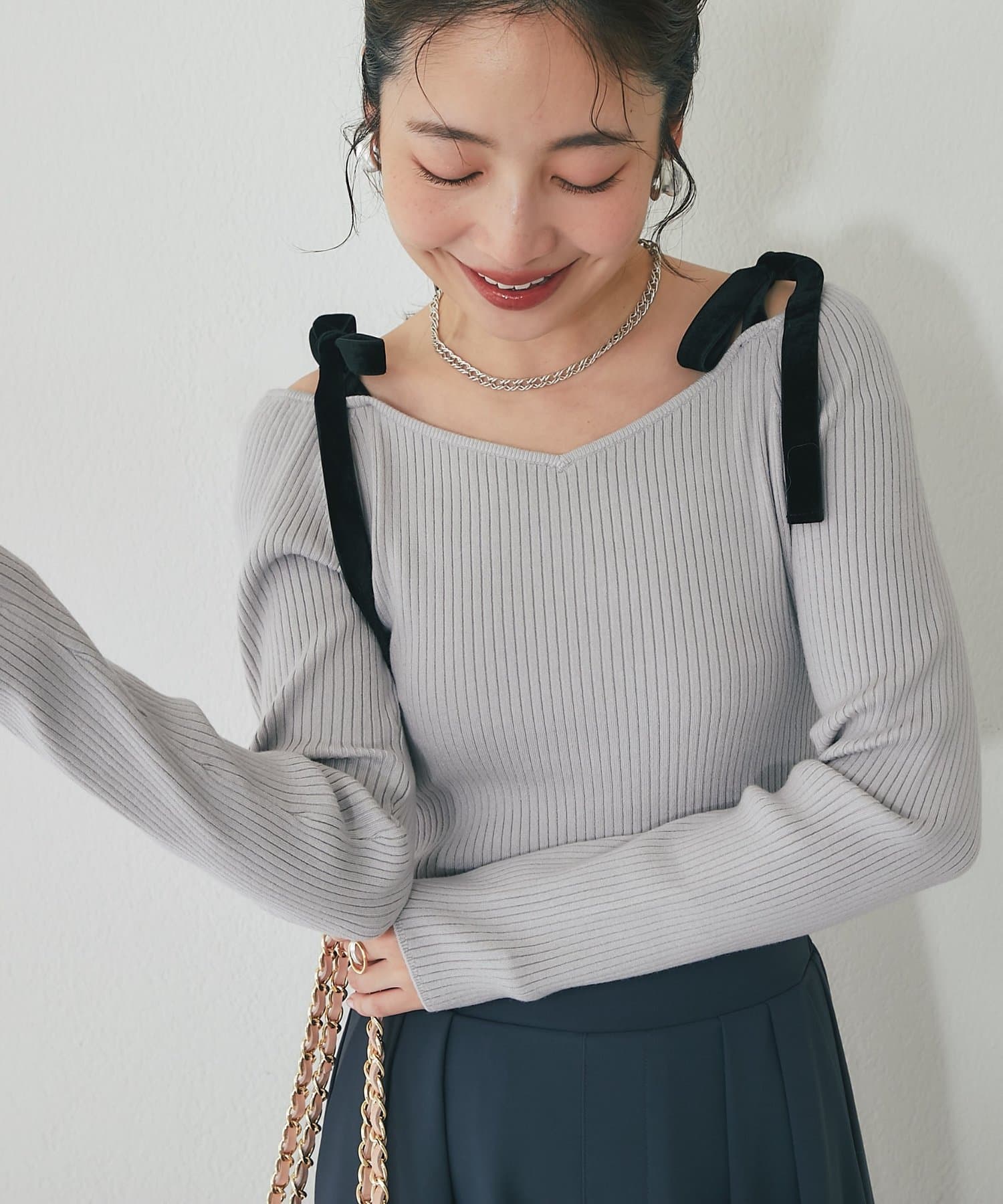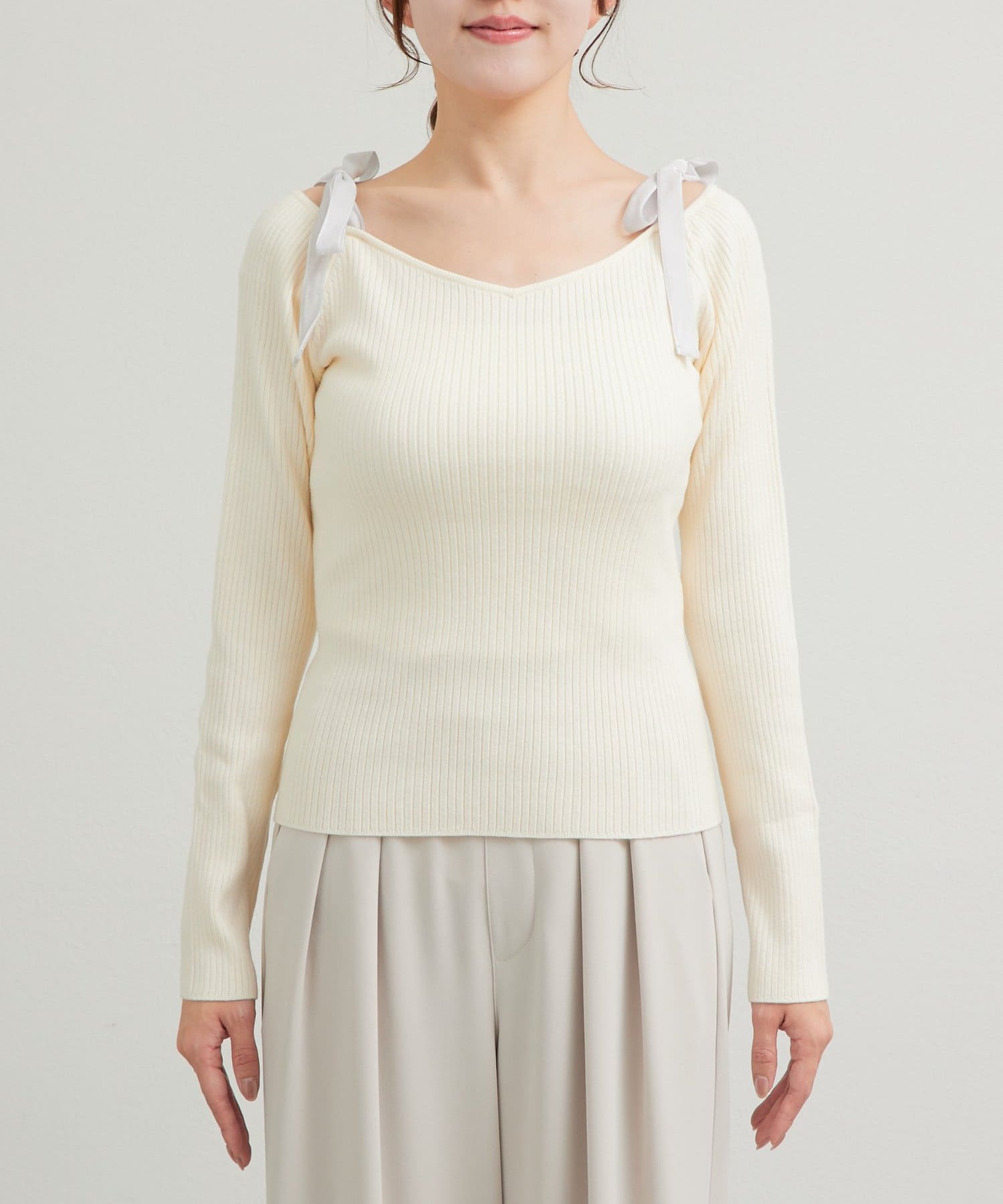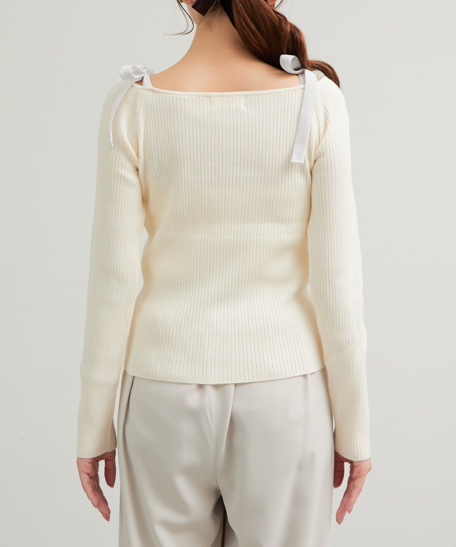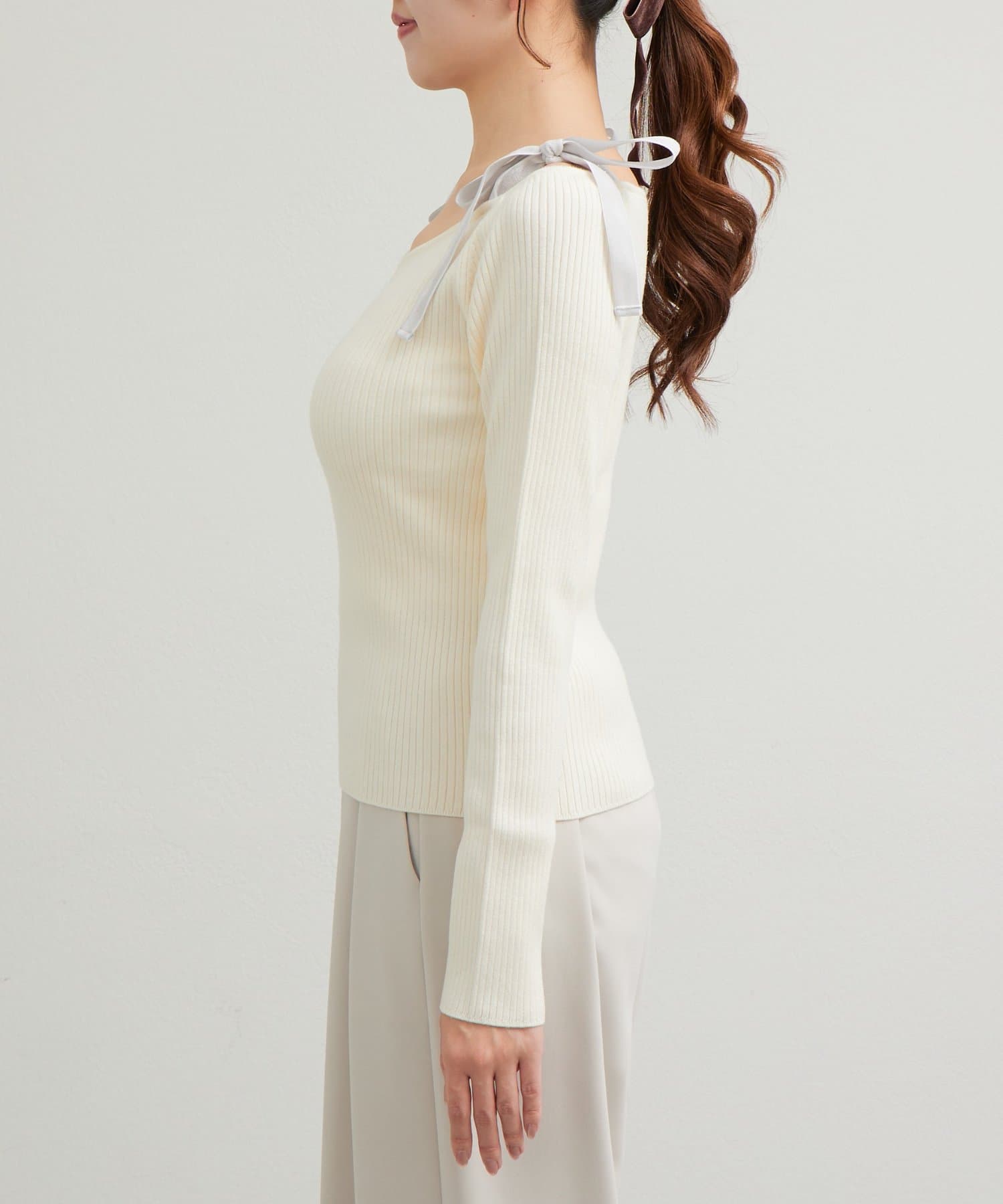 デコルテを美しく見せるネックラインと、肩の繊細なリボンが印象的なニット。