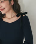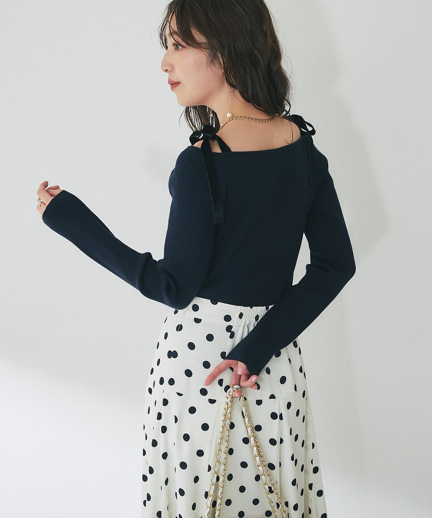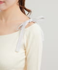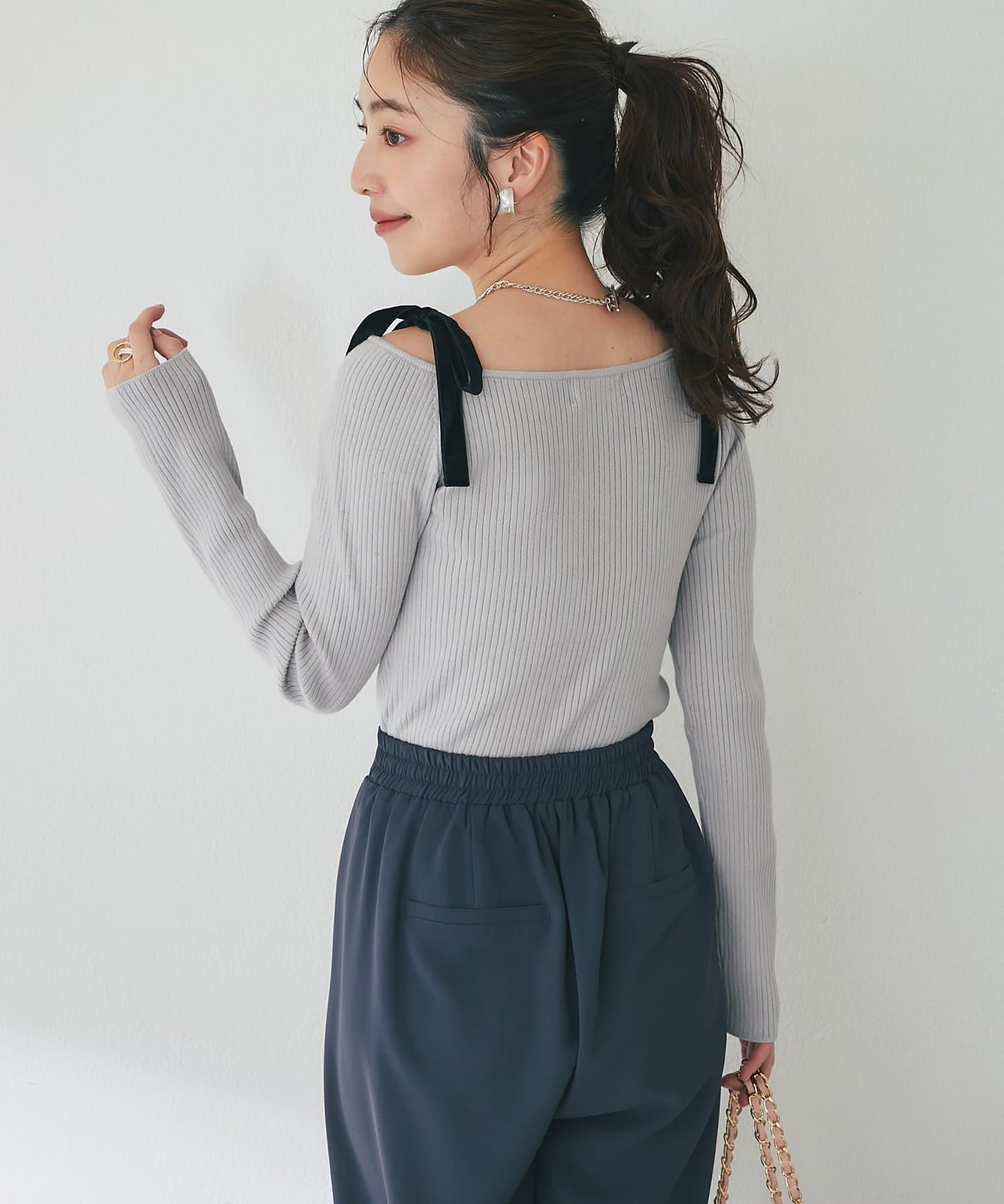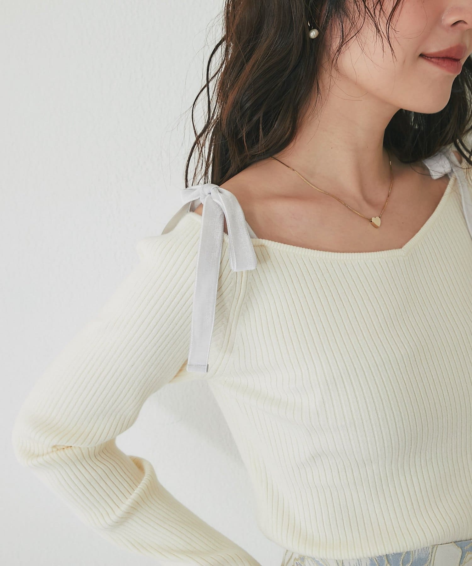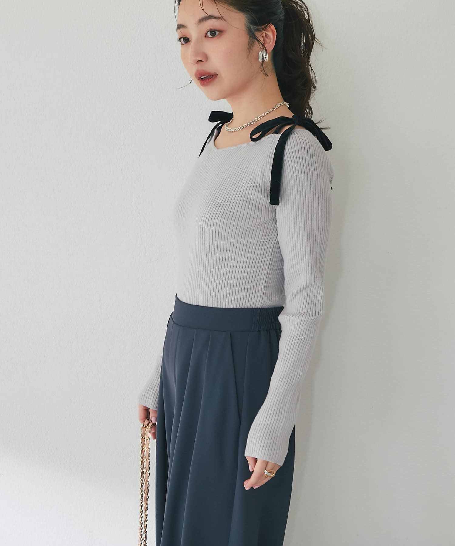 デコルテを美しく見せるネックラインと、肩の繊細なリボンが印象的なニット。