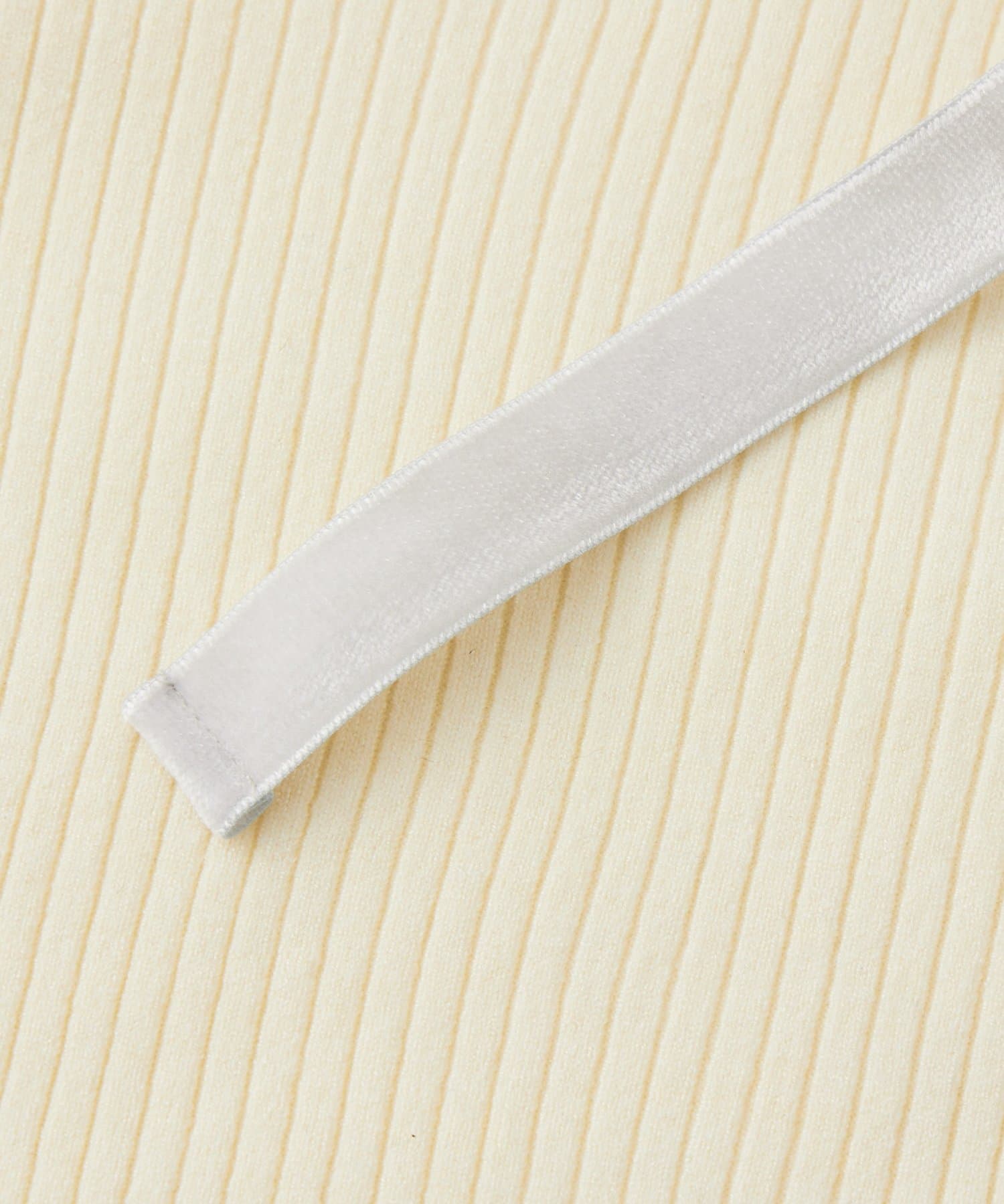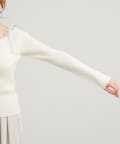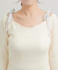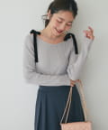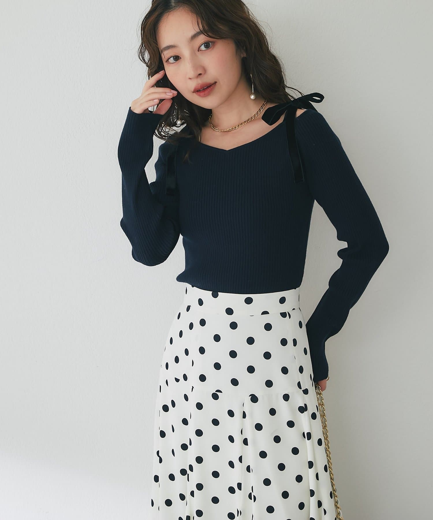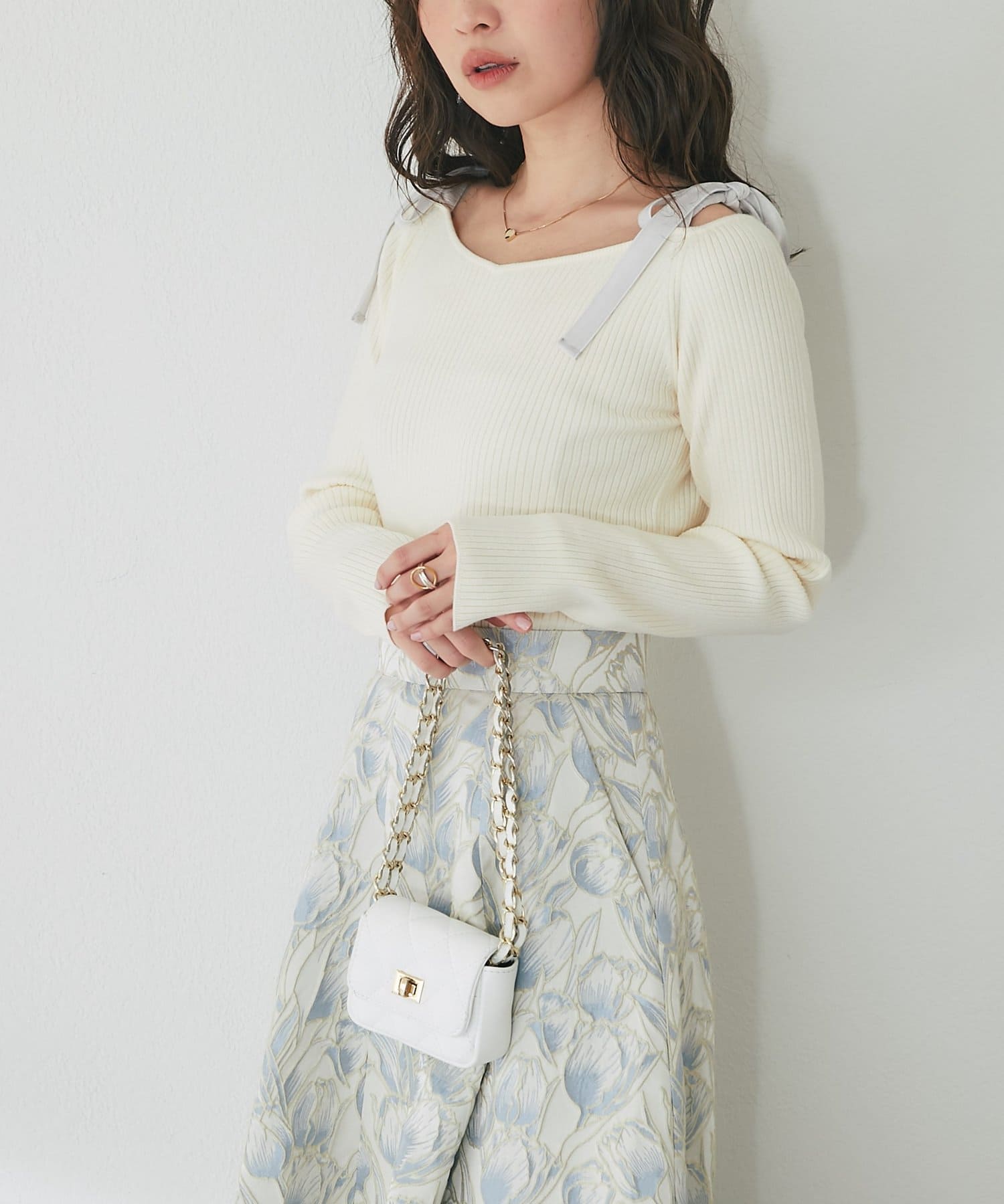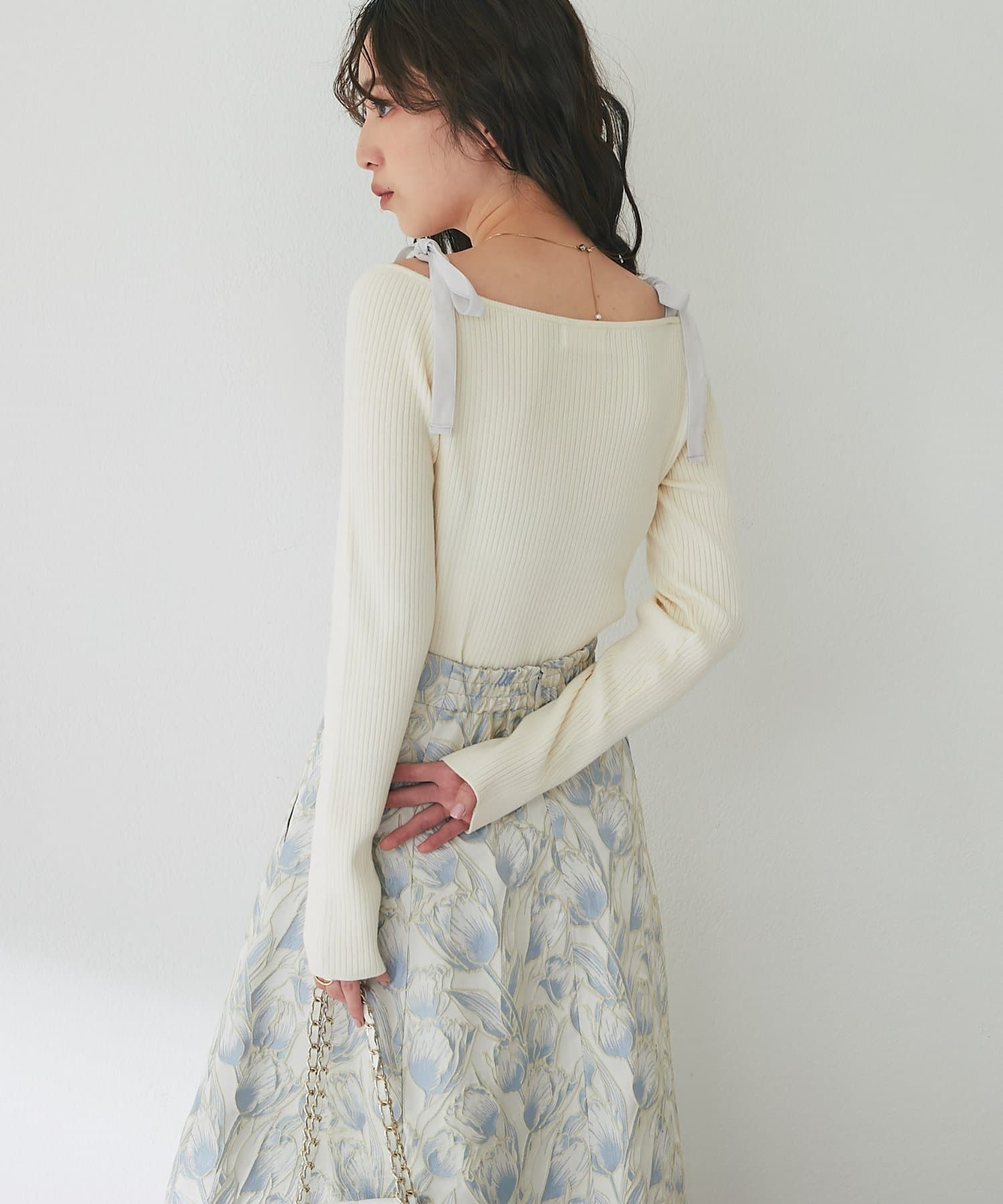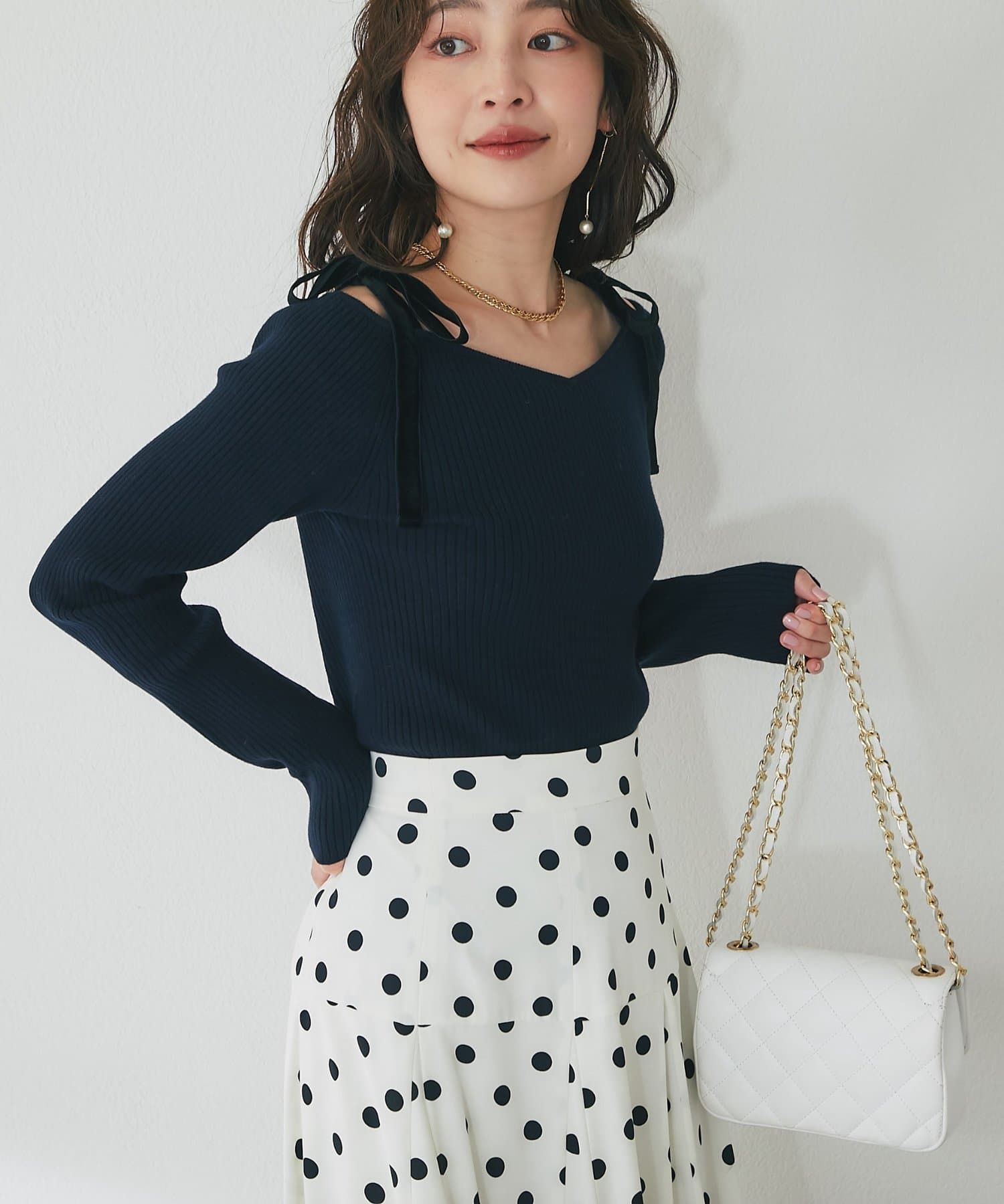 デコルテを美しく見せるネックラインと、肩の繊細なリボンが印象的なニット。