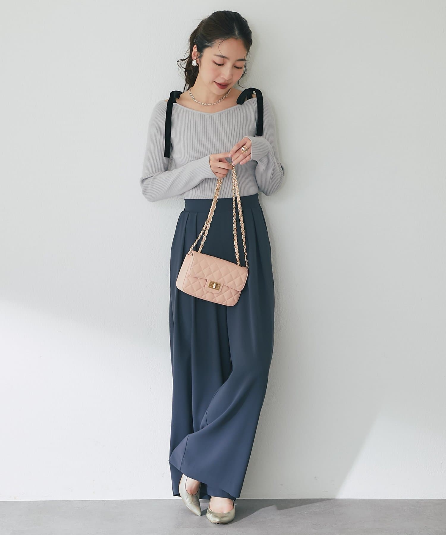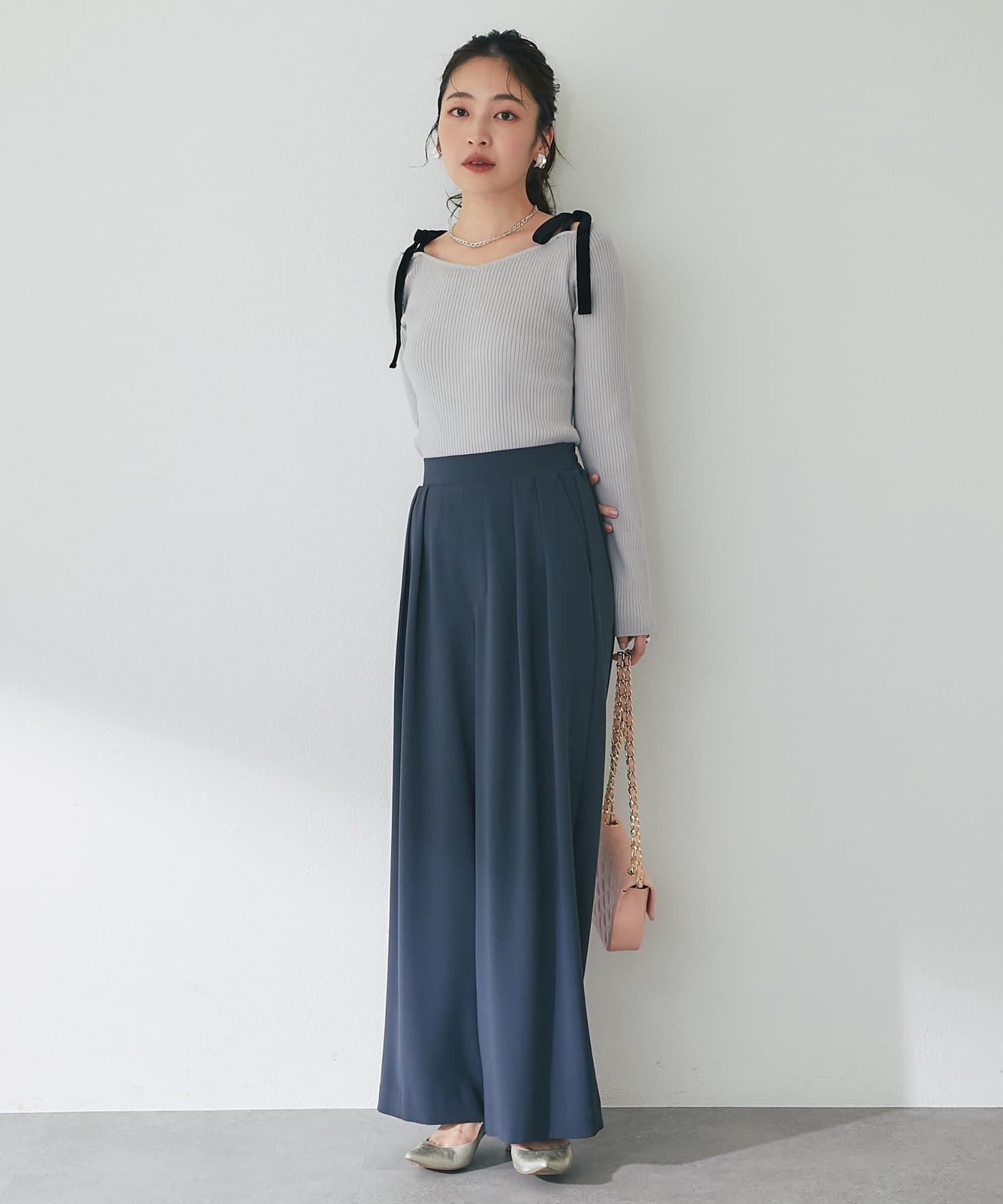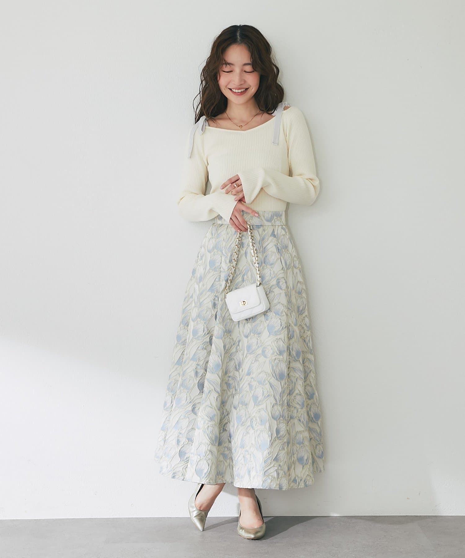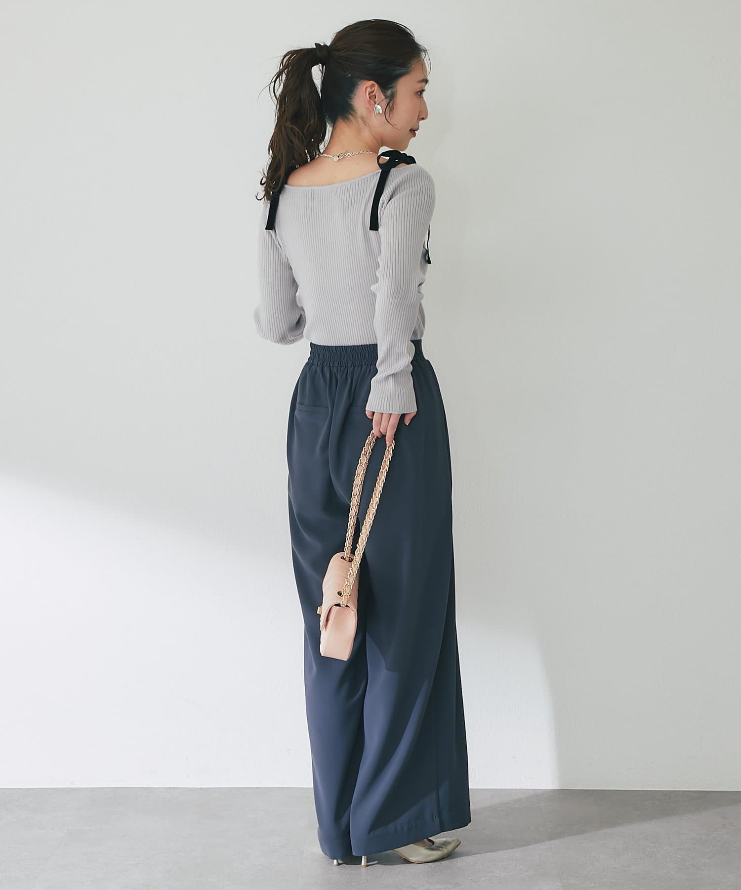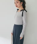 デコルテを美しく見せるネックラインと、肩の繊細なリボンが印象的なニット。