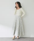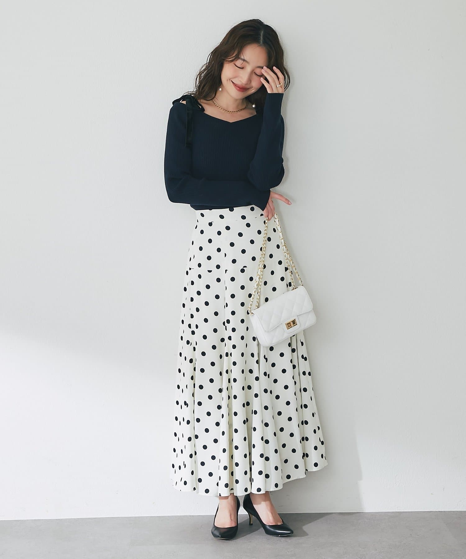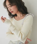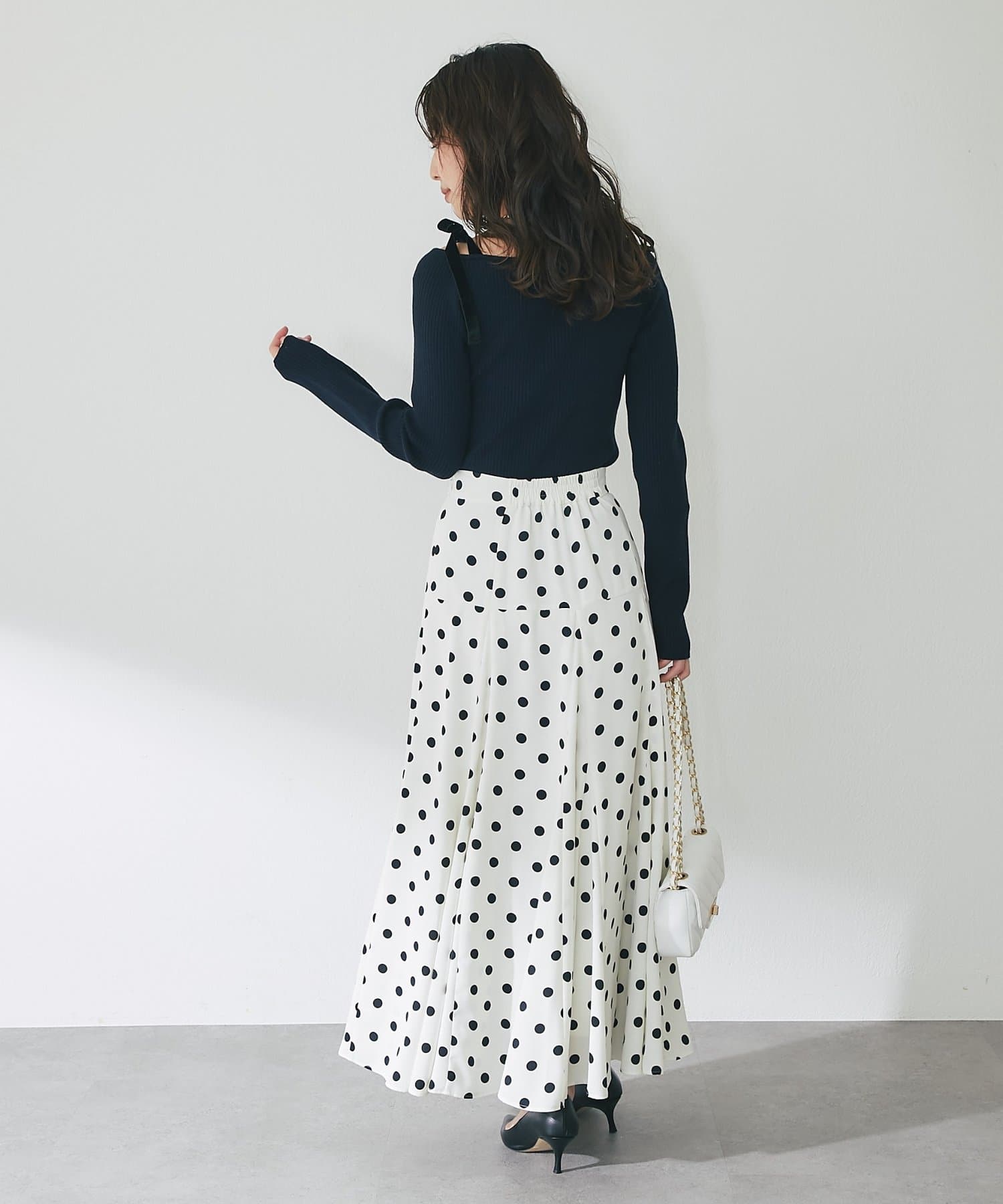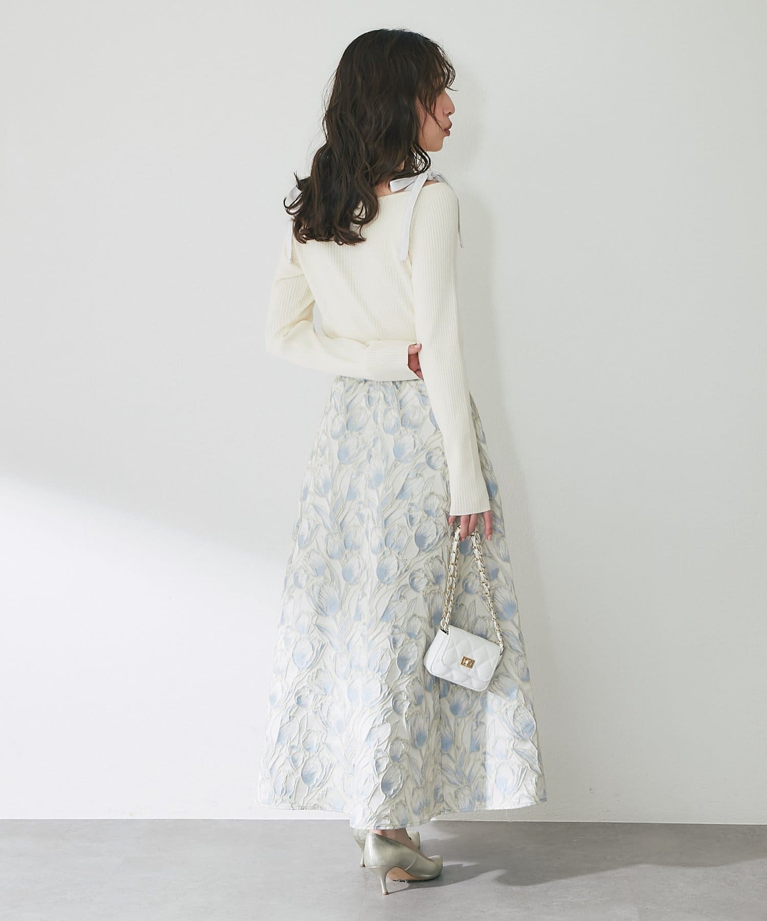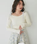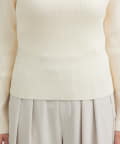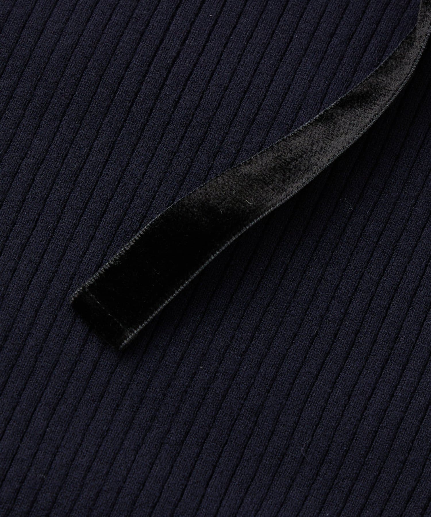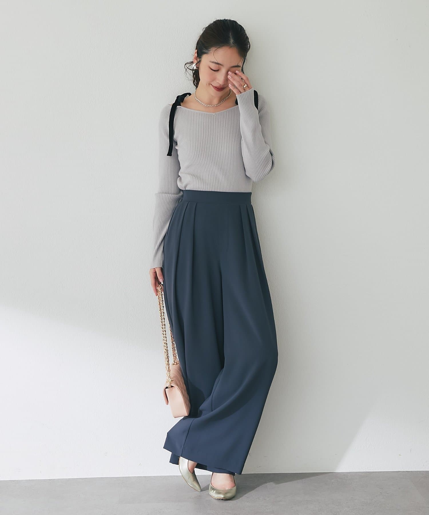 デコルテを美しく見せるネックラインと、肩の繊細なリボンが印象的なニット。