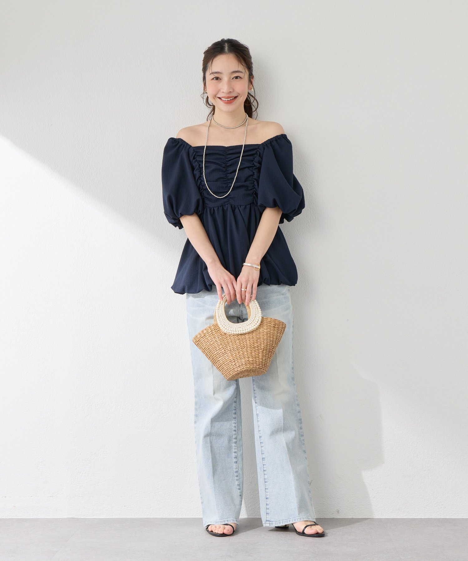 コンパクトなトップスを合わせれば、女性らしいきれいめデニムスタイルに。