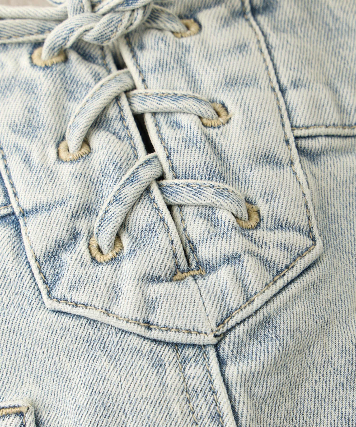ハイウエストにバックレースアップを施し、女性らしいアクセントをプラスしました。