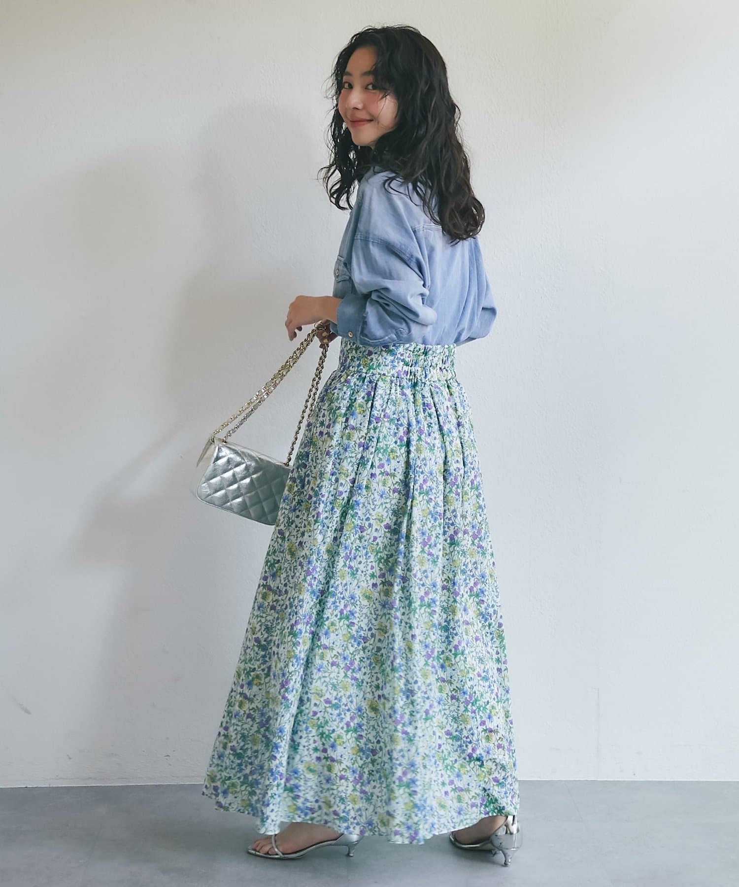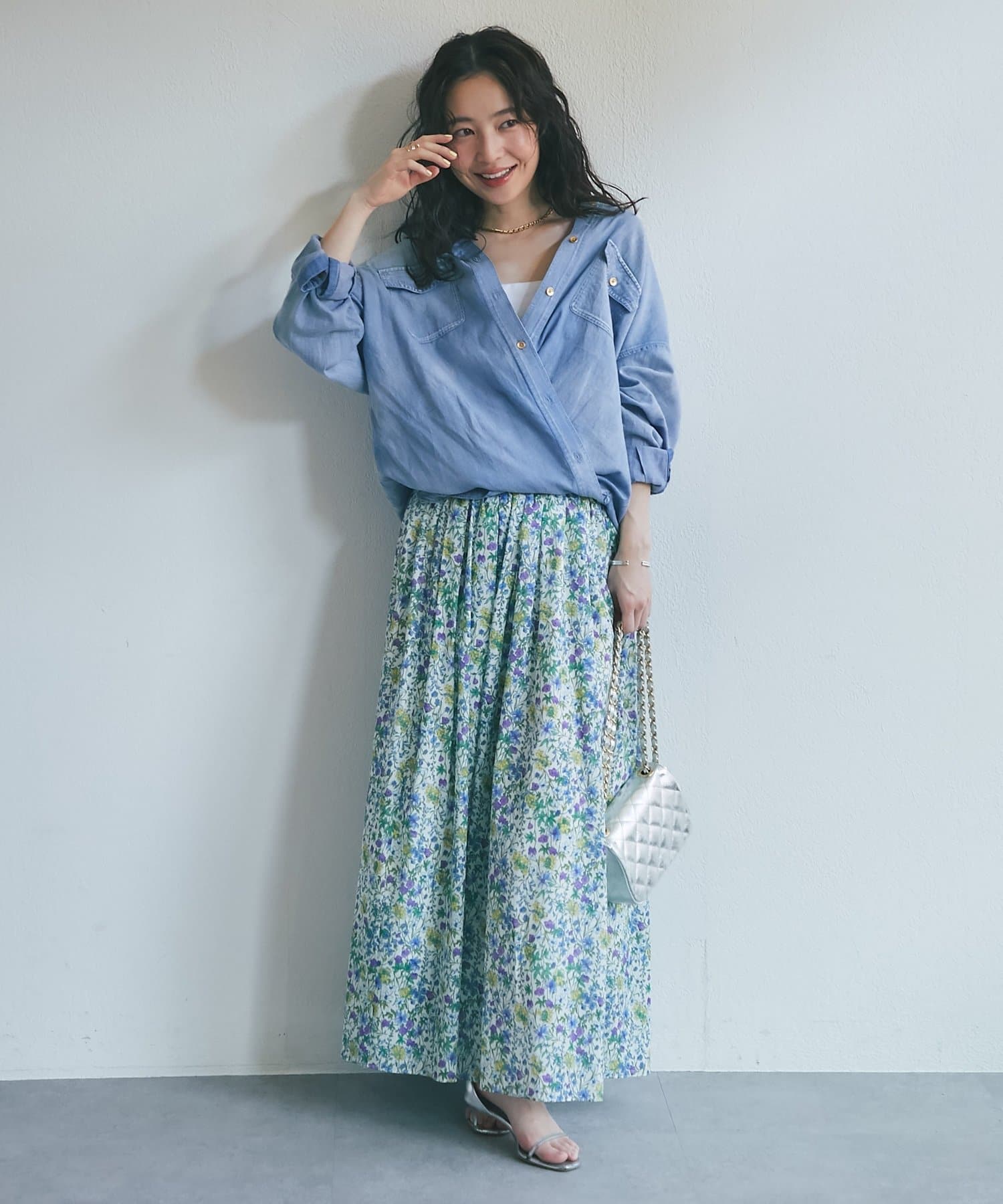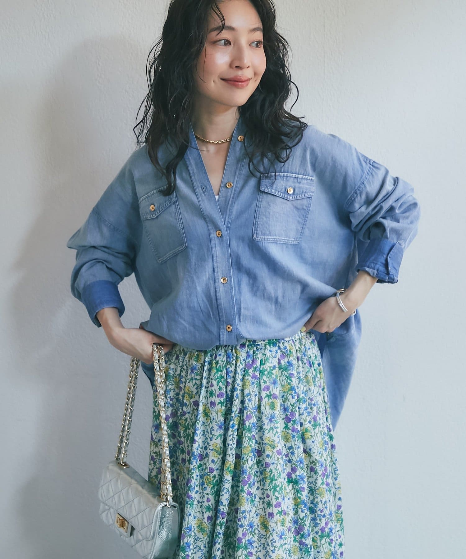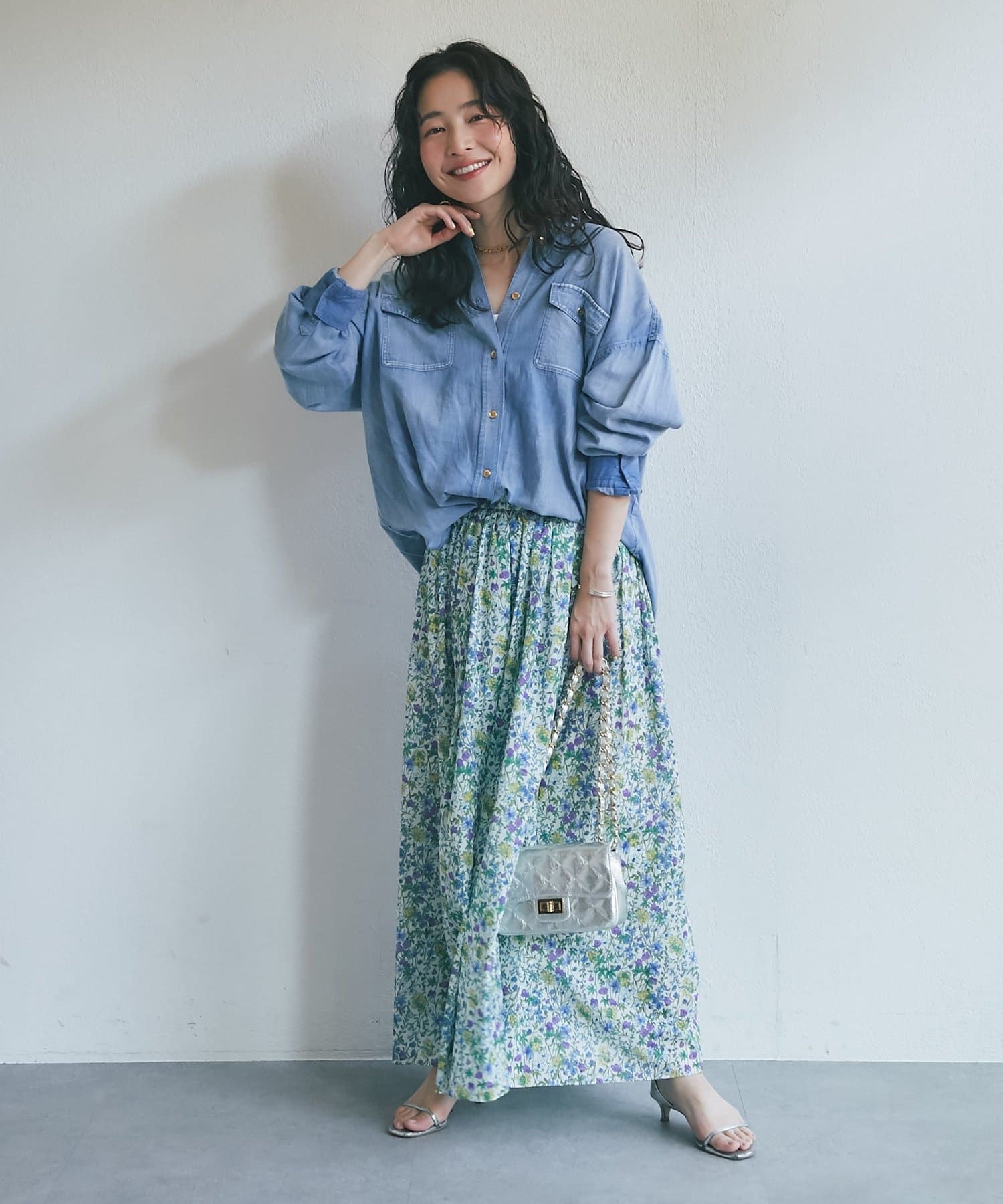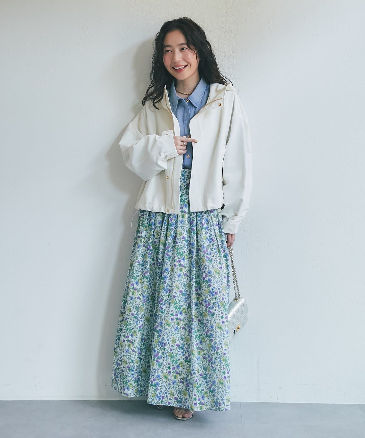 スカートやワンピースに羽織れば、カジュアルミックススタイルが完成。